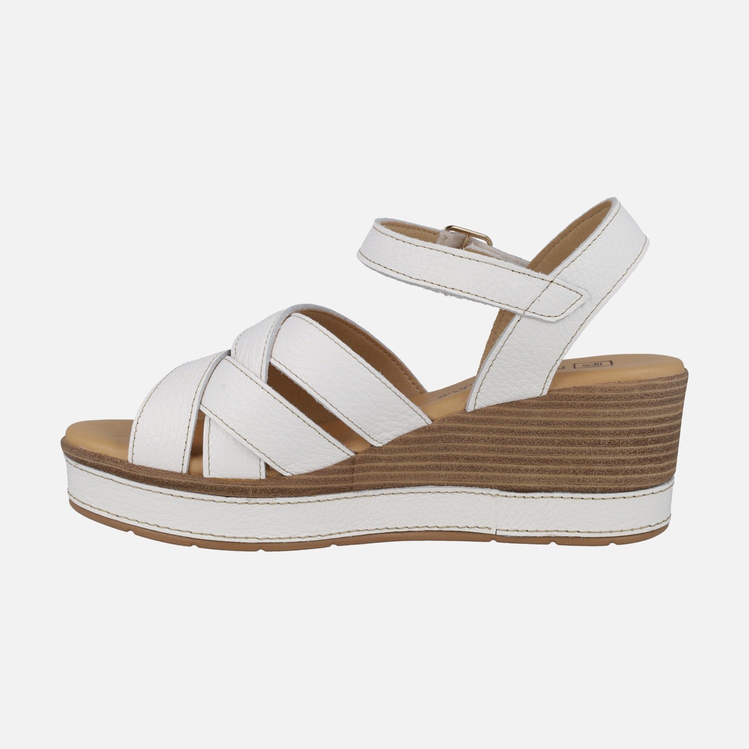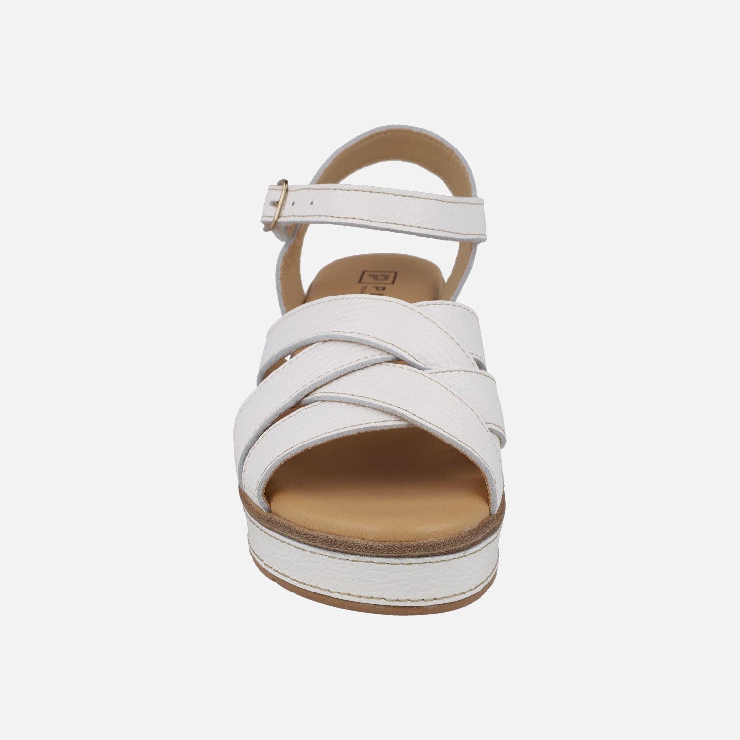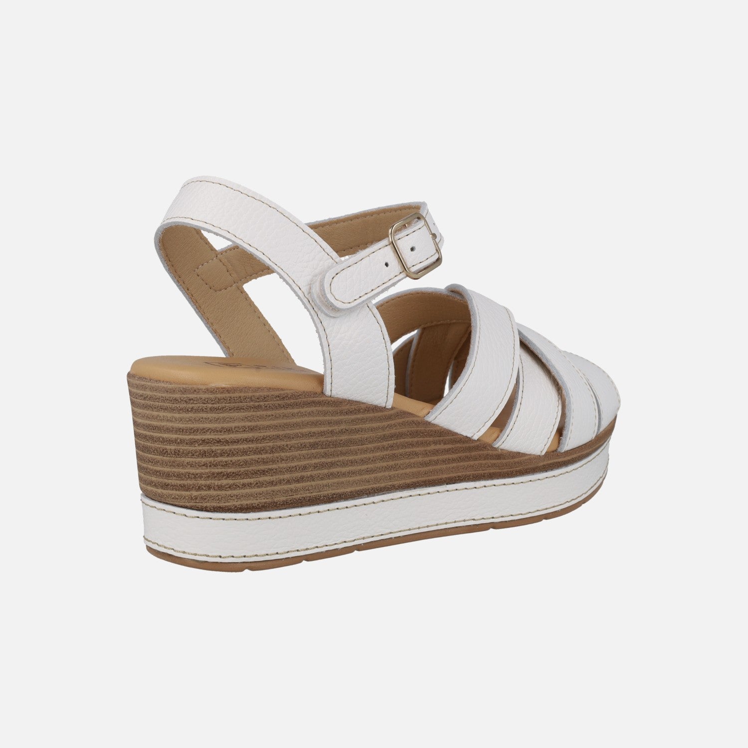 Sandalias blancas de piel de la marca Pitillos, modelo 11281 Blanco. Sandalias con tiras entrelazadas en la parte delantera, pulsera con hebilla ajustable al tobillo. Interior mixto en piel y tejido. Cuña de 6 cm de altura trasera (2,5 cm plataforma delantera).