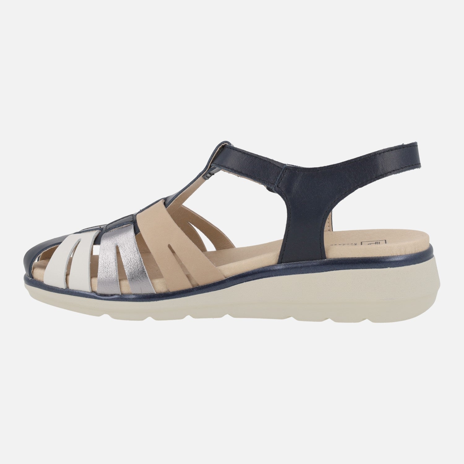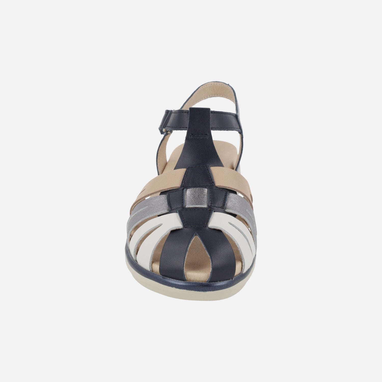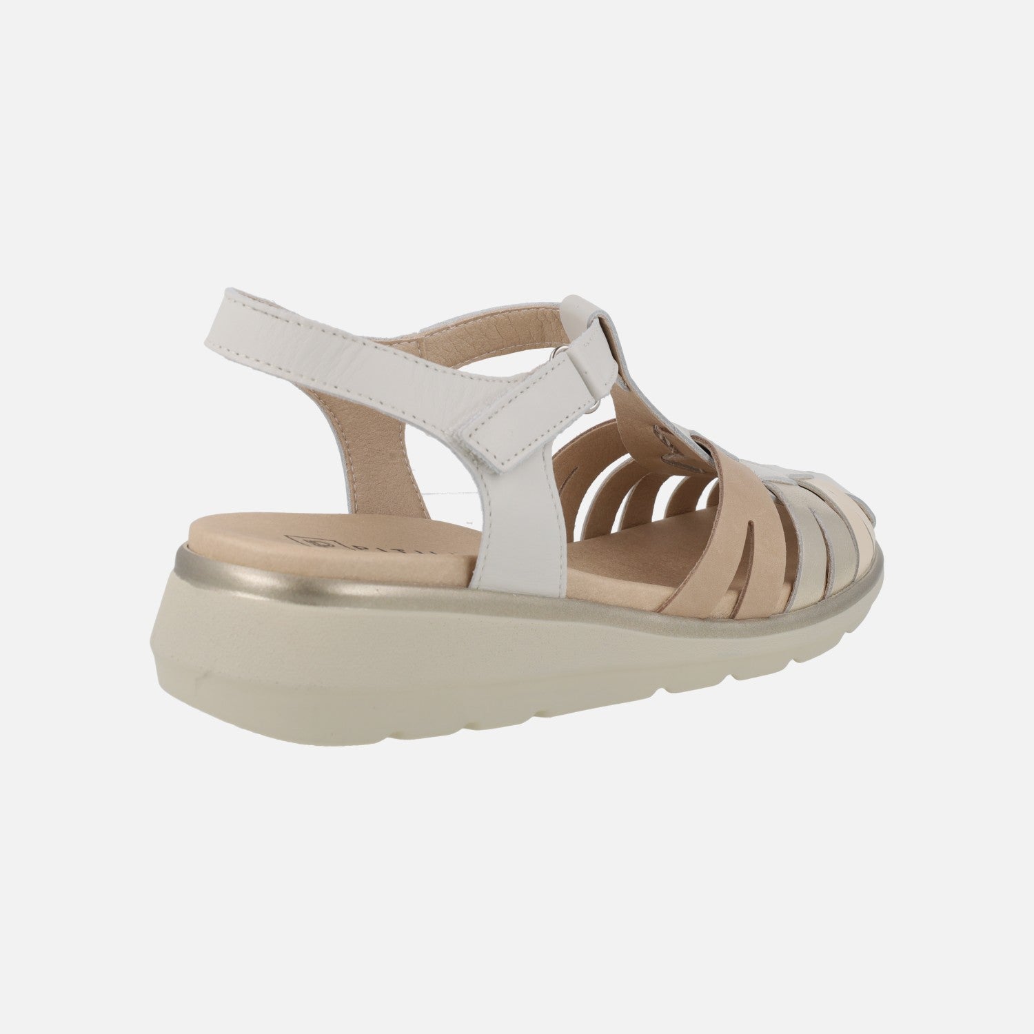 Sandalias para mujer de la marca Pitillos modelo 20310 línea Pasodoble. Sandalias confort, estilo cangrejeras, elaboradas en piel combinando distintos tonos: hielo/dorado/beige/taupe (combi blanco) o marino/blanco/plata/taupe (combi azul). Cierre con tira ajustable con velcro al tobillo. Interiores en tejido. Piso sintético de 4 cm de altura trasera (2 cm parte delantera).