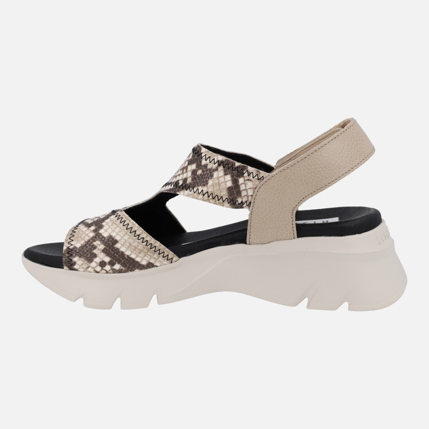 Sandalias deportivas para mujer de la marca Hispanitas modelo HV254010 Latte. Sandalias de piel color beige/crema, con detalle de cierre de velcro en el talón. Interiores de microfibra. Piso de goma EVA, super ligero, con 6 cms de altura trasera (3,5 cms plataforma delantera). Sistema TRIFLOW de triple almohadillado para un gran confort a la hora de caminar.