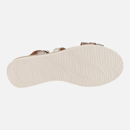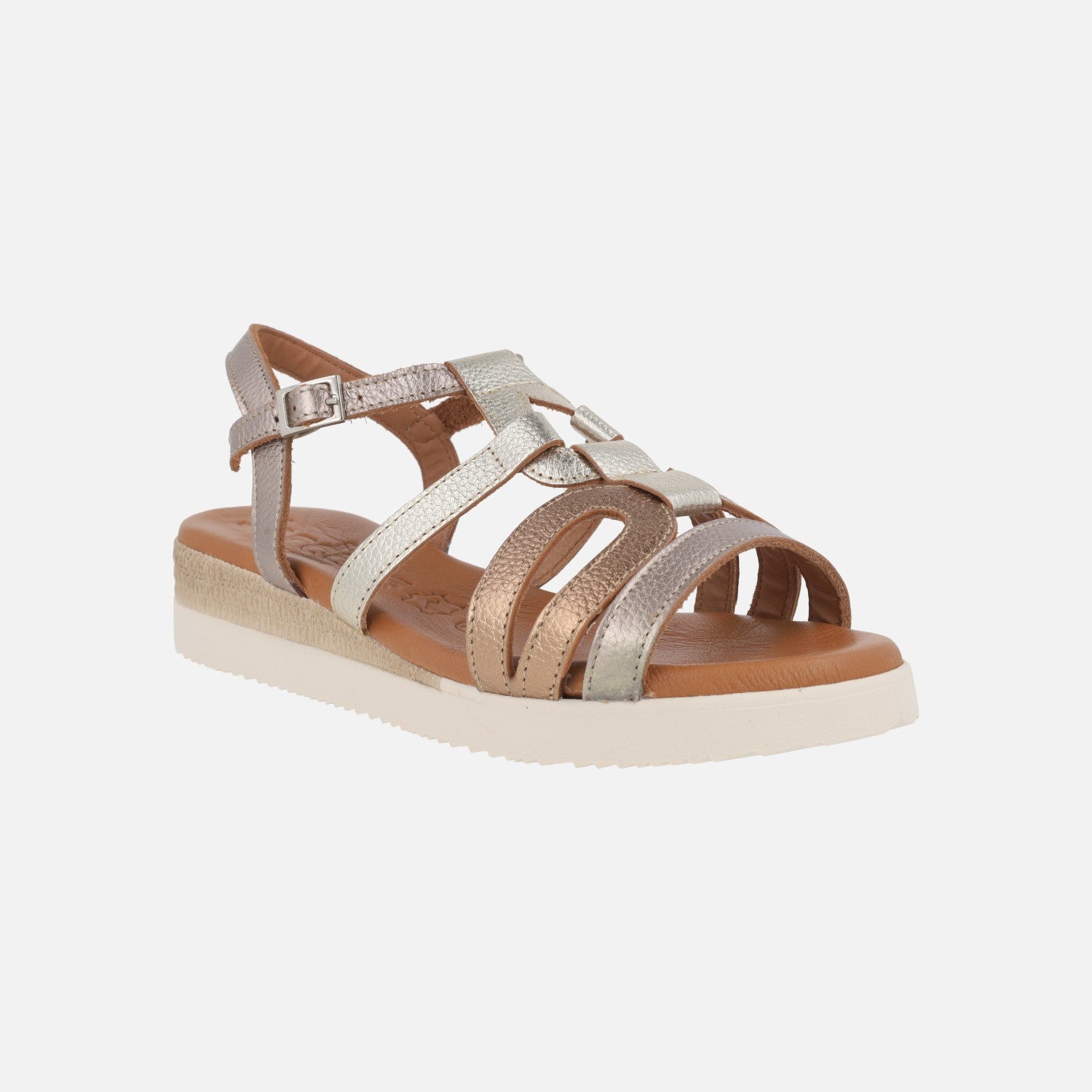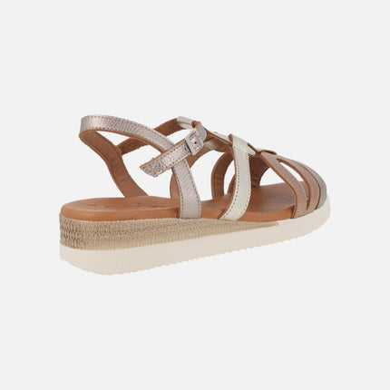 Preciosas sandalias de piel de la marca Jordana, modelo 534, disponibles en combinado cuero y en combinado de metalizados. Sandalias Made in Spain, elaboradas en piel de primera calidad con cierre de hebilla ajustable al tobillo. Interior en materiales sintéticos. Planta de piel. Piso de goma, bicolor, con 3,5 cm de altura trasera (2 cm parte delantera).