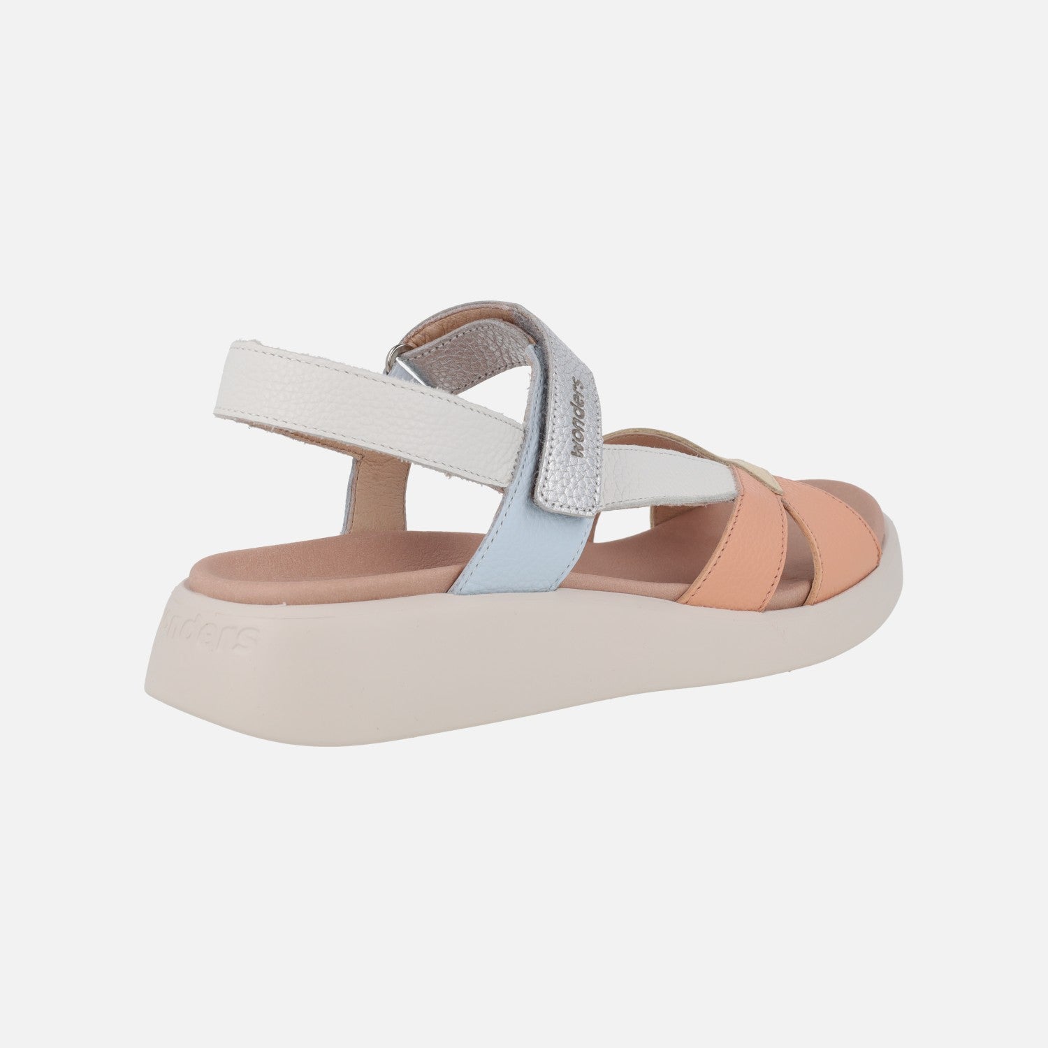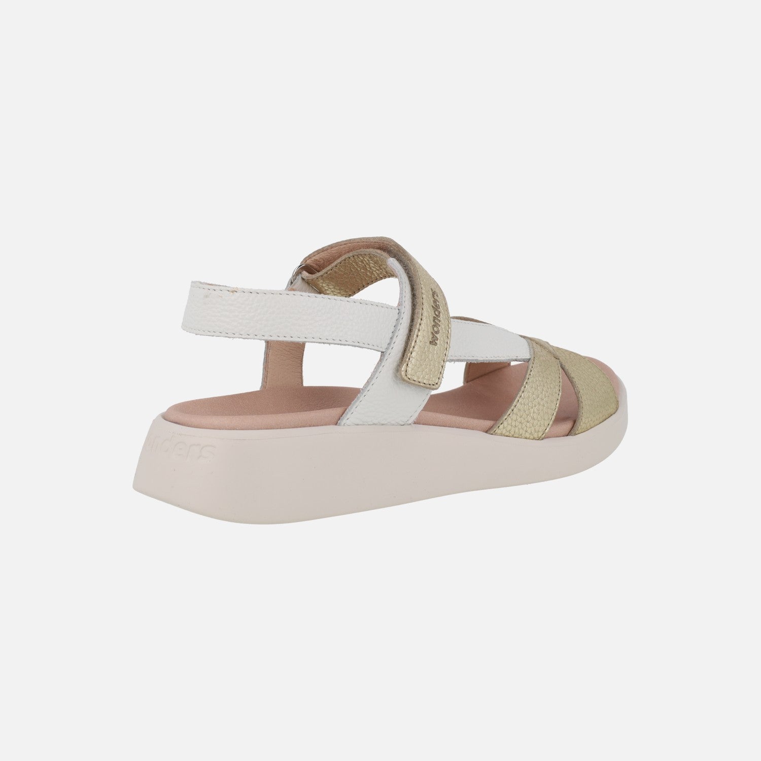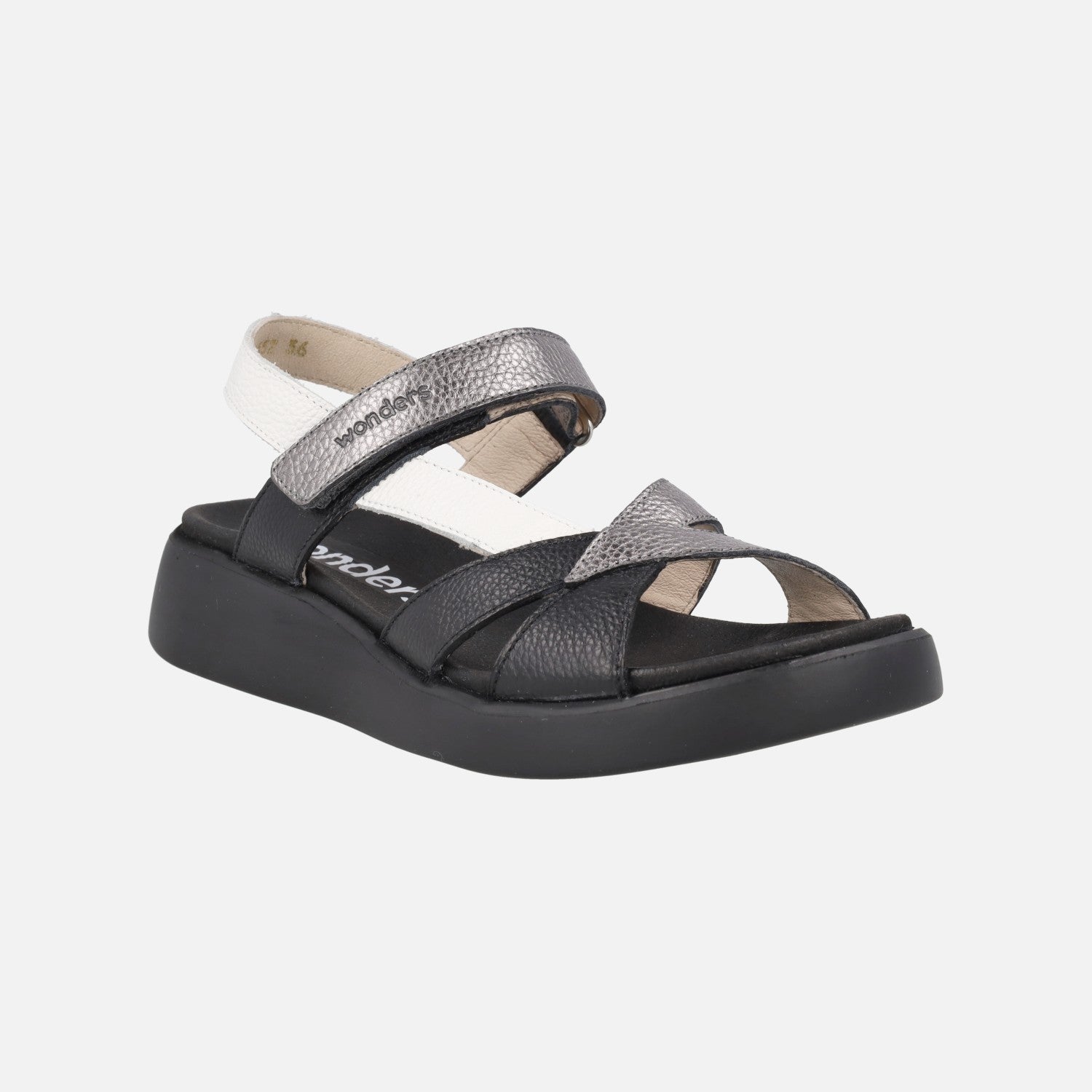 Preciosas y comodísimas sandalias de la marca Wonders, modelo c-6552 Mar 52, disponibles en combinado de tonos pastel, en platino (oro) combinado con blanco y en combinado negro con blanco y plomo. Sandalias de piel con cierre de velcro al tobillo. Interiores en piel y microfibra. Suela XL Extralight, increíblemente ligera y confortable, de aproximadamente 3,5 cm de altura en la parte trasera (2 cm aproximadamente parte delantera). Wonders, YES WE FLY.