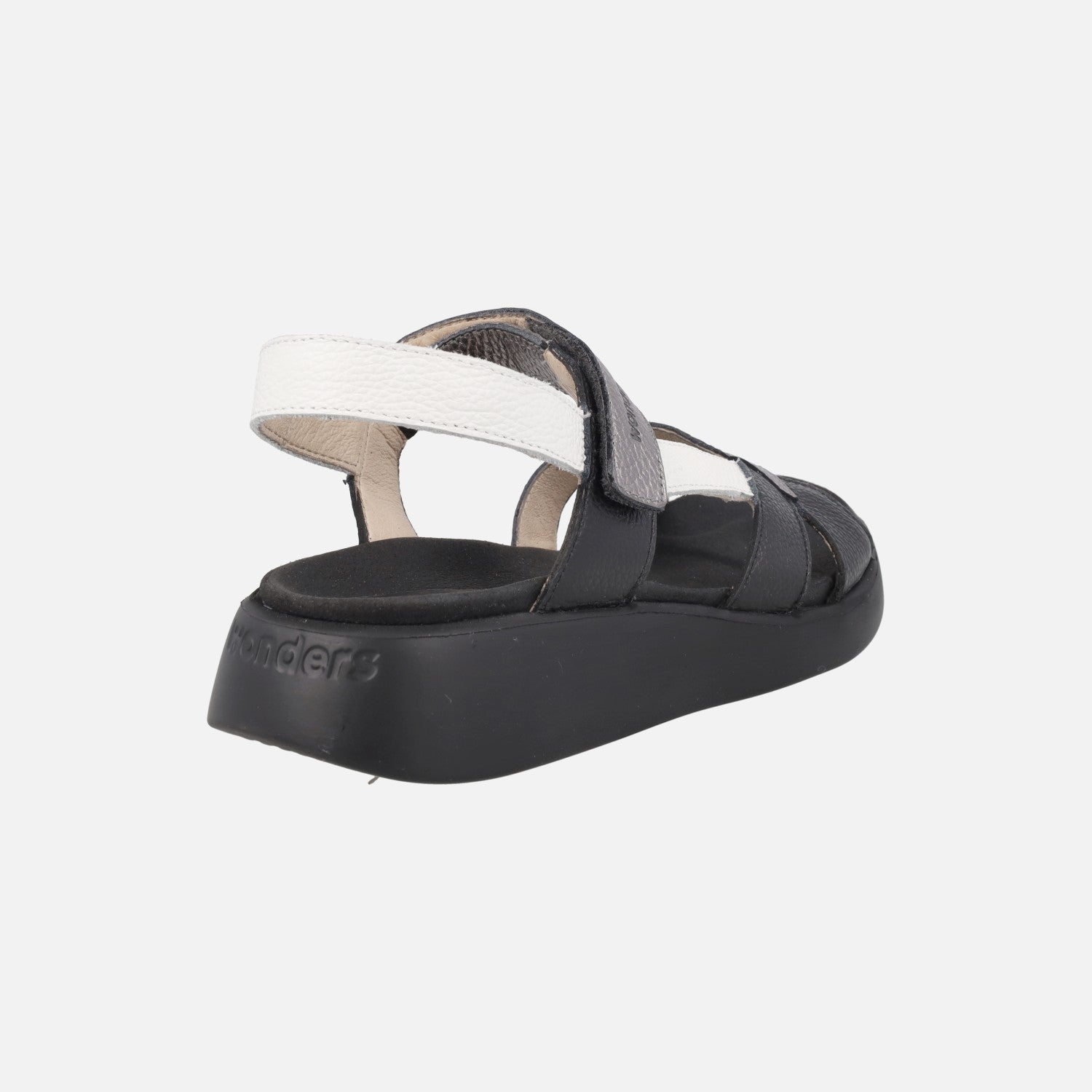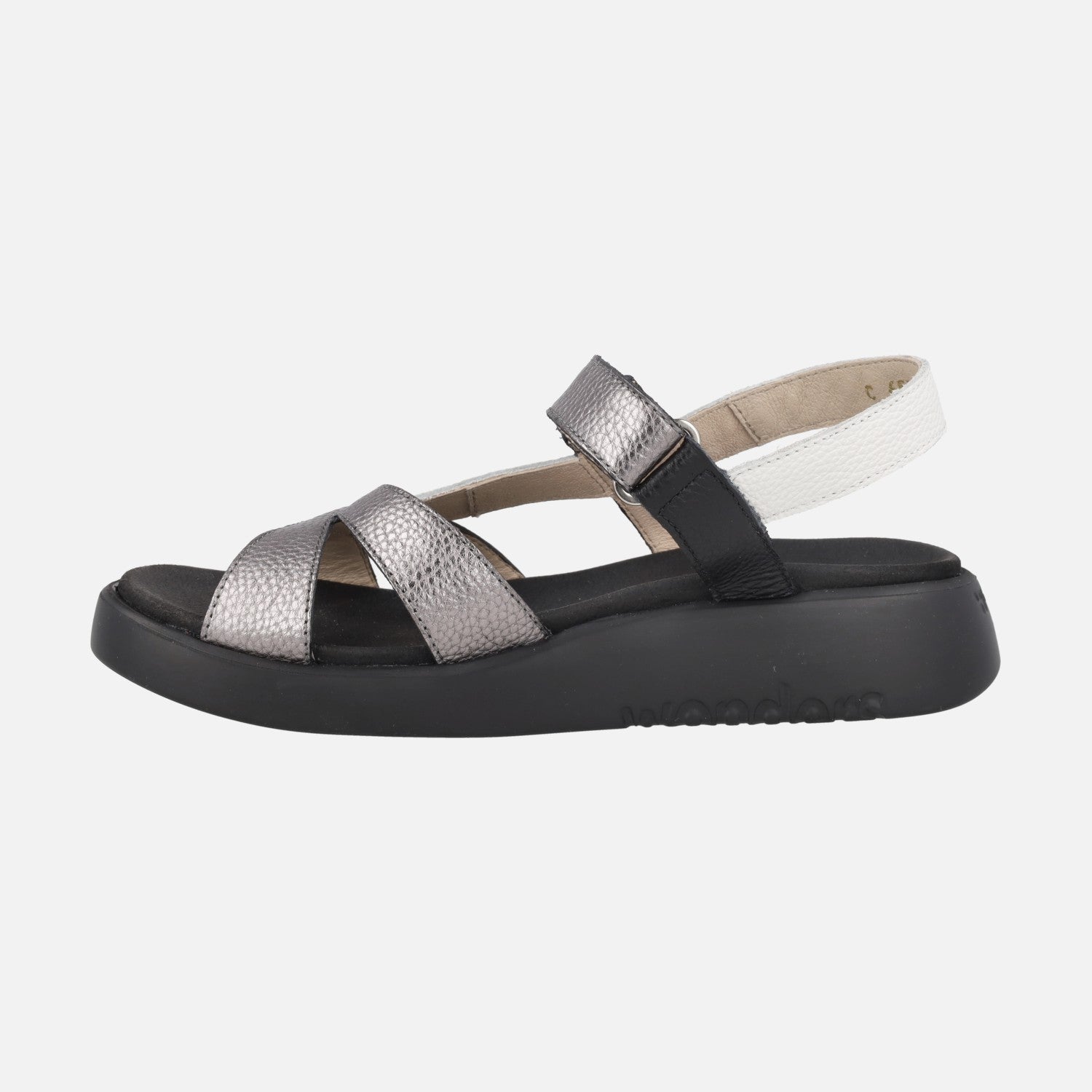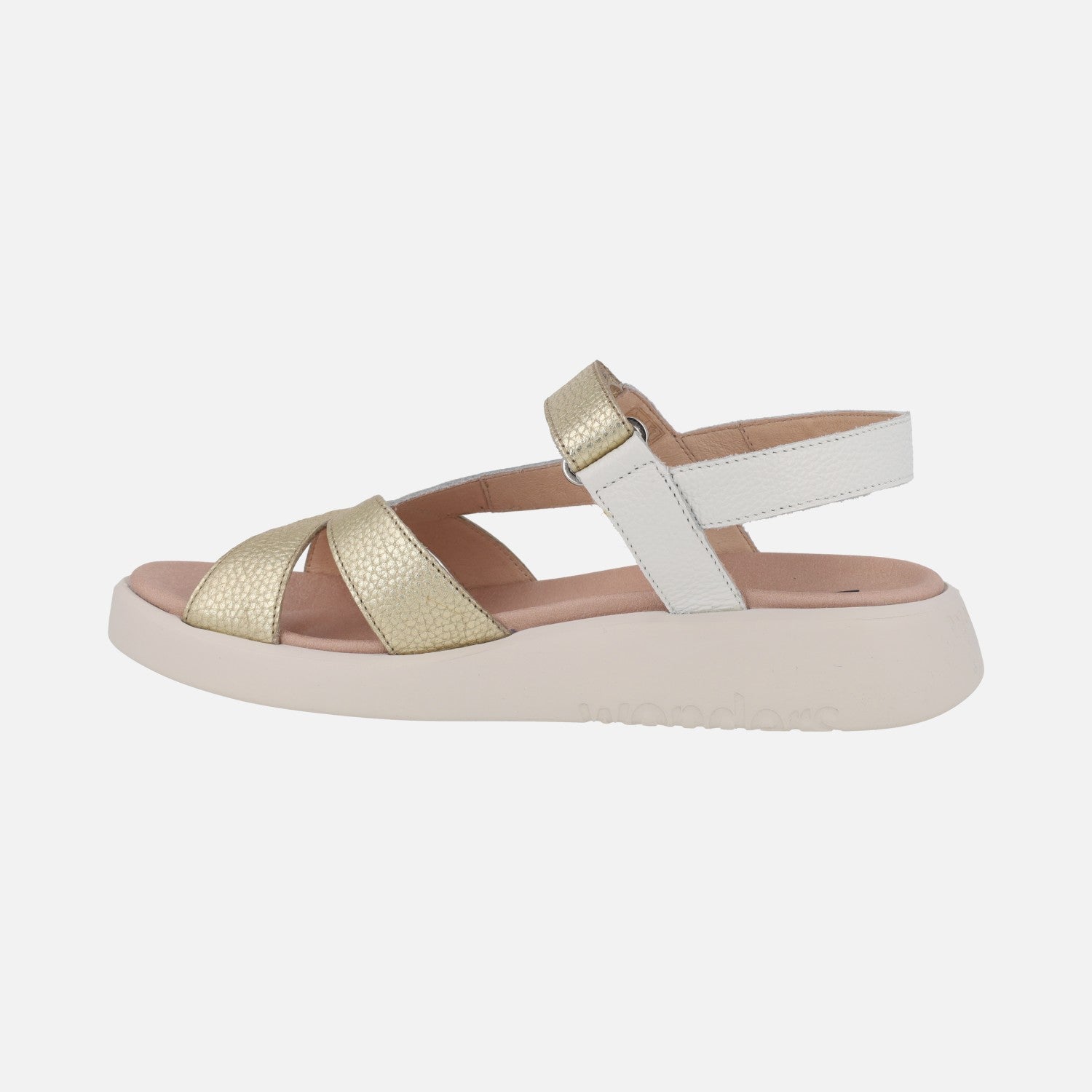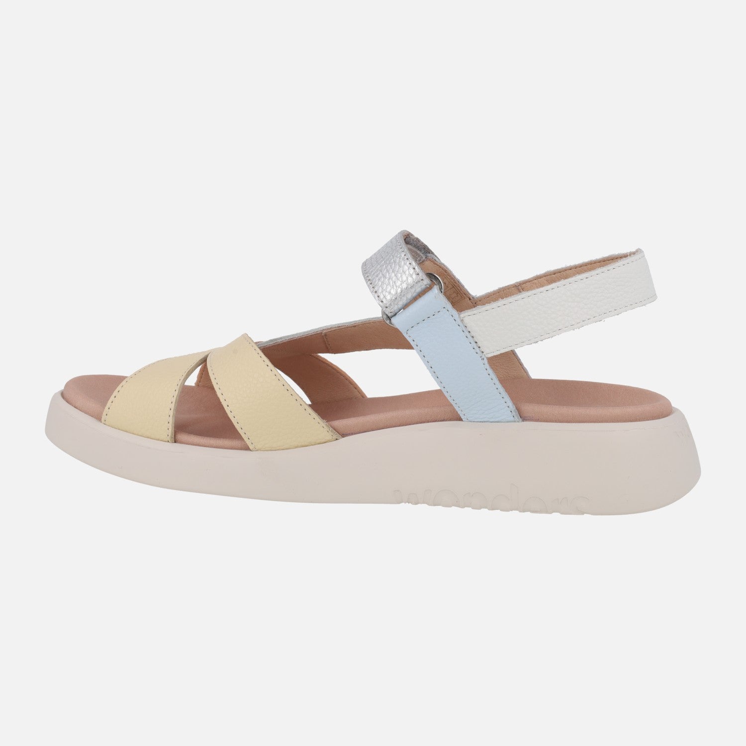 Preciosas y comodísimas sandalias de la marca Wonders, modelo c-6552 Mar 52, disponibles en combinado de tonos pastel, en platino (oro) combinado con blanco y en combinado negro con blanco y plomo. Sandalias de piel con cierre de velcro al tobillo. Interiores en piel y microfibra. Suela XL Extralight, increíblemente ligera y confortable, de aproximadamente 3,5 cm de altura en la parte trasera (2 cm aproximadamente parte delantera). Wonders, YES WE FLY.
