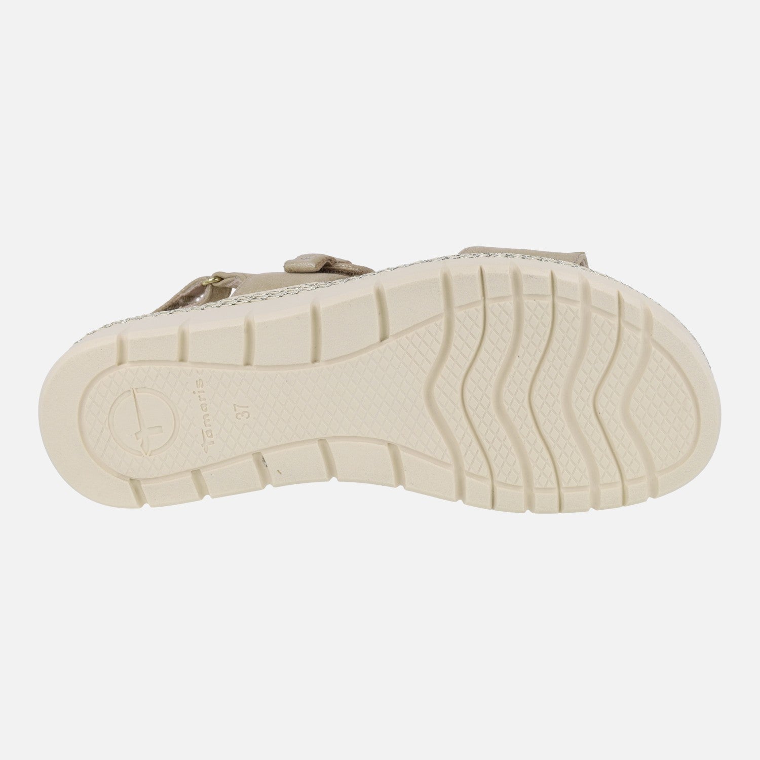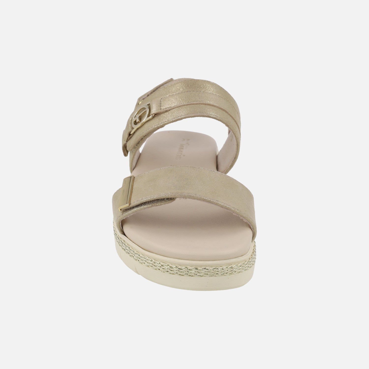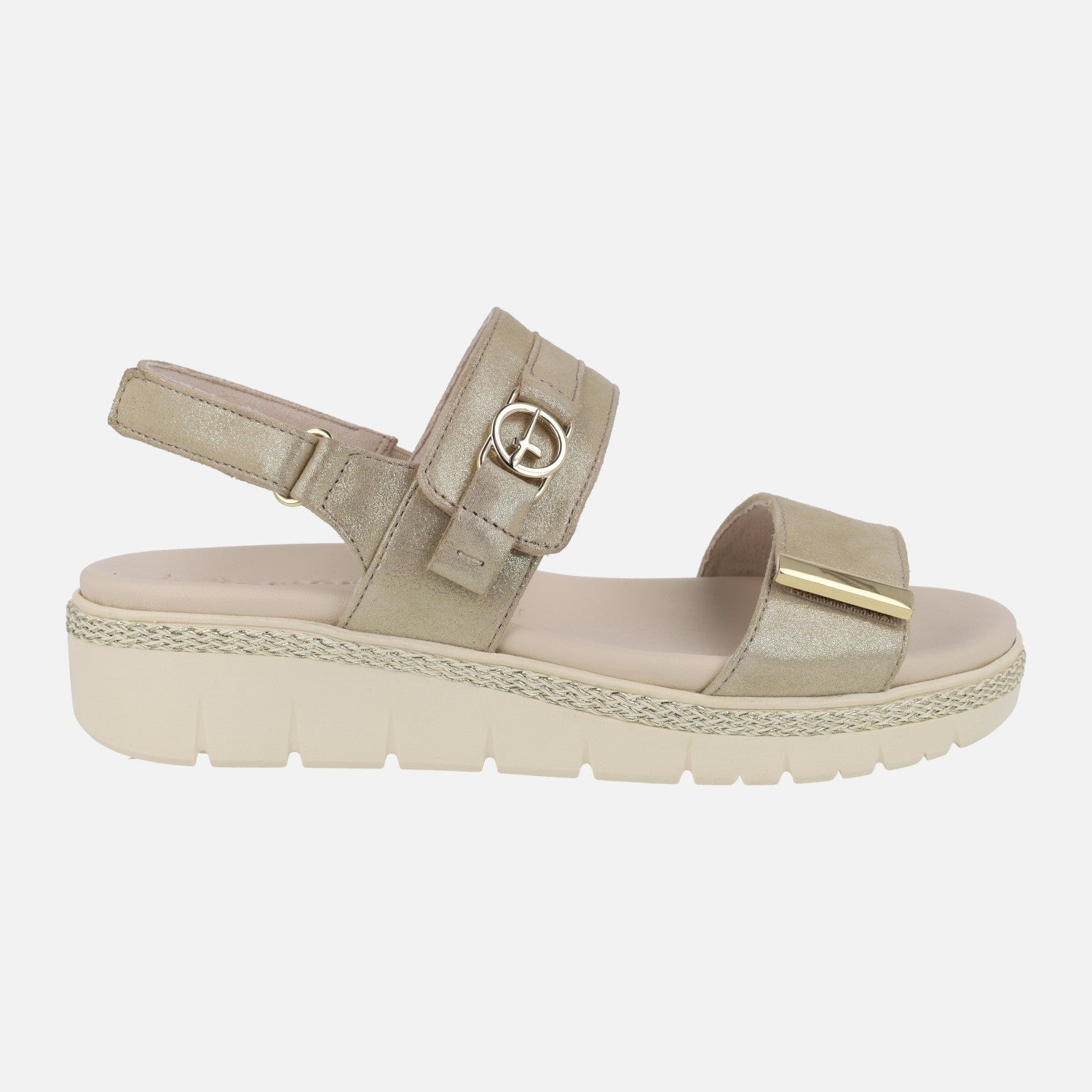 Nuevas sandalias de la marca Tamaris, modelo 1-28264-44 champagne. Sandalias con exterior en piel dorada, con cierre de velcro al tobillo y otros dos cierres de velcro en la parte delantera y del empeine. Interior textil con plantillas de piel. Las plantillas son extraíbles (llevan velcro por debajo). Piso sintético de 4 cm de altura trasera (3 parte delantera).