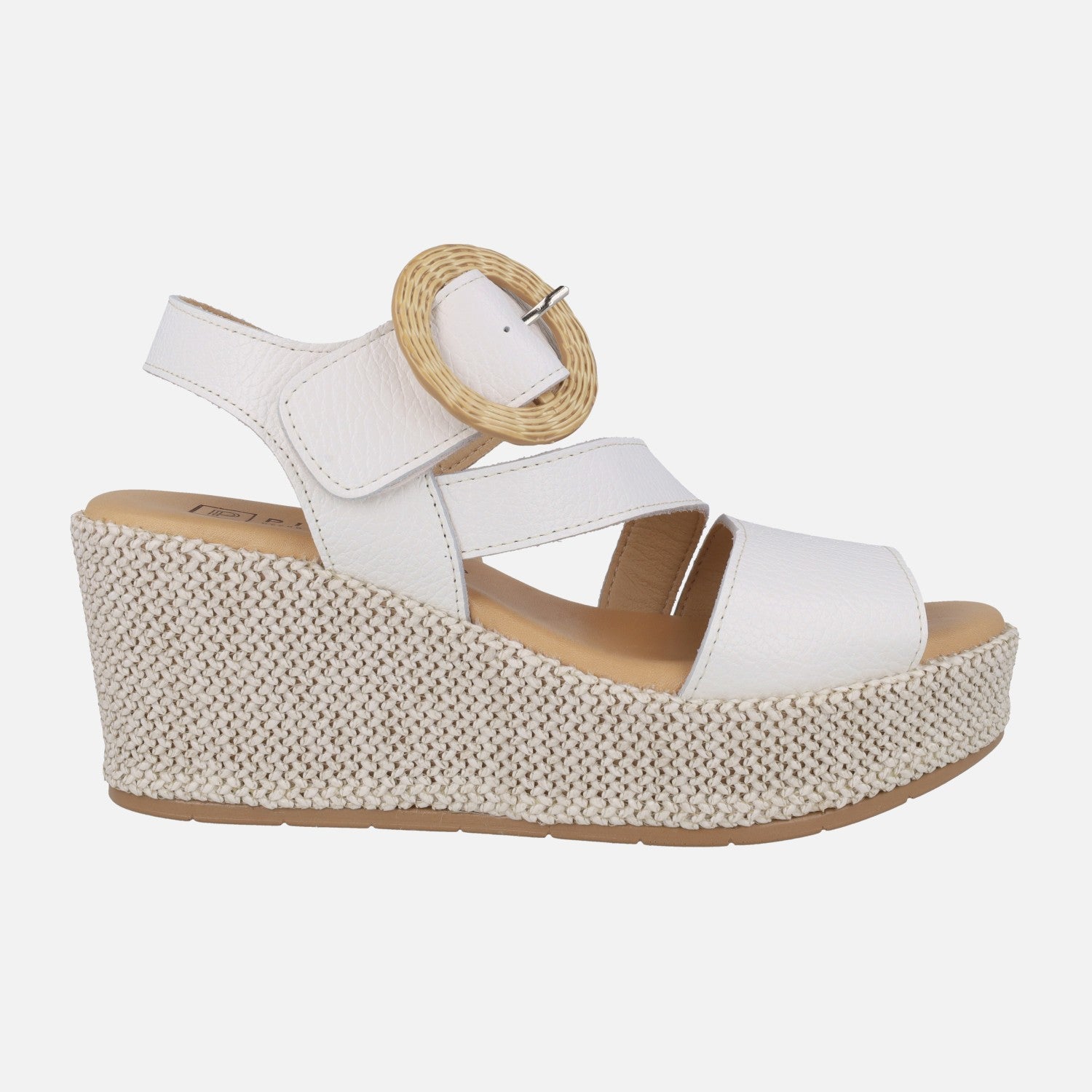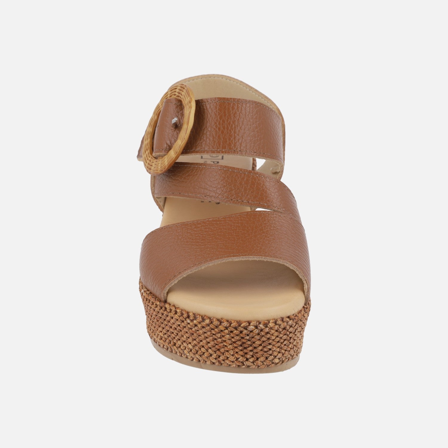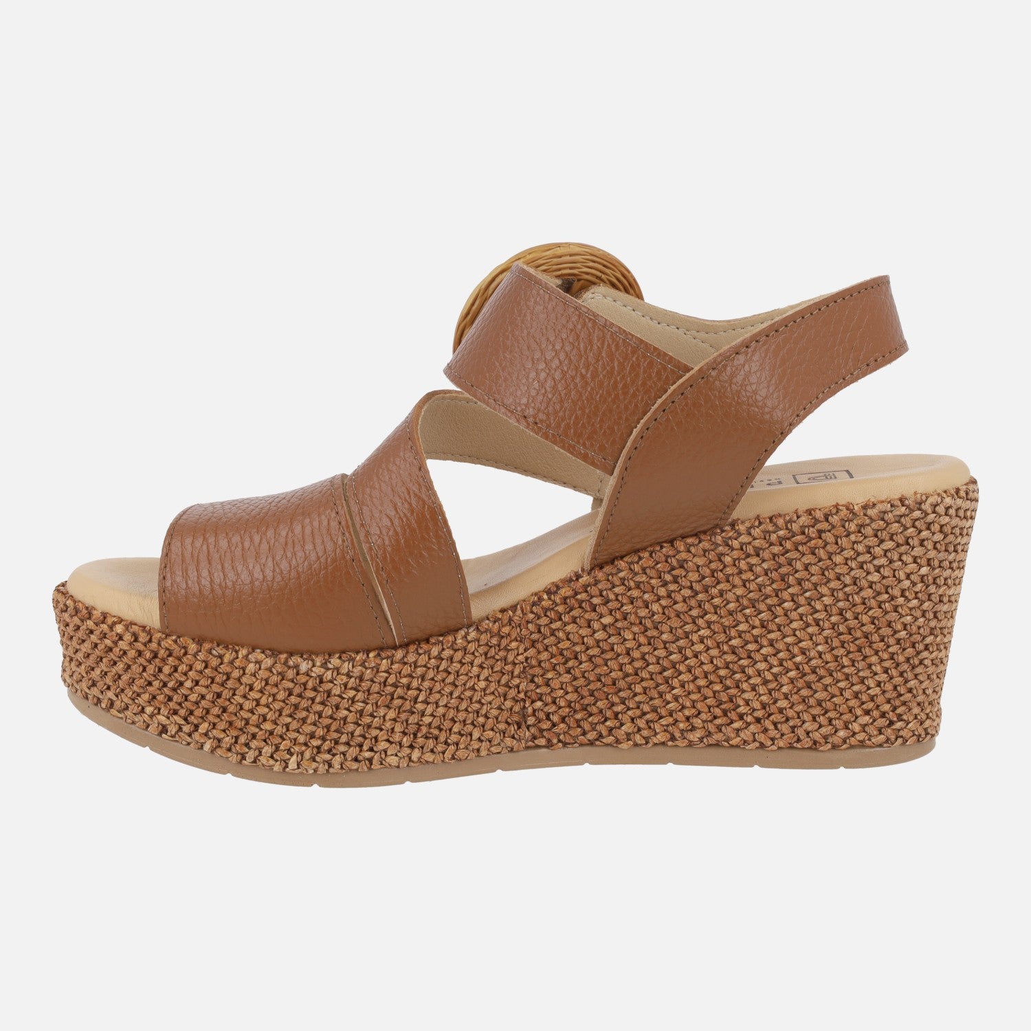 Sandalias de piel para mujer marca Pitillos modelo 11271 Cuero. Sandalias de cuña alta, elaboradas en piel con cierre de velcro, la hebilla circular es un adorno. Interior textil con planta de piel. Cuña de 7 cm de altura trasera, forrada de rafia (3,5 cm plataforma delantera).
