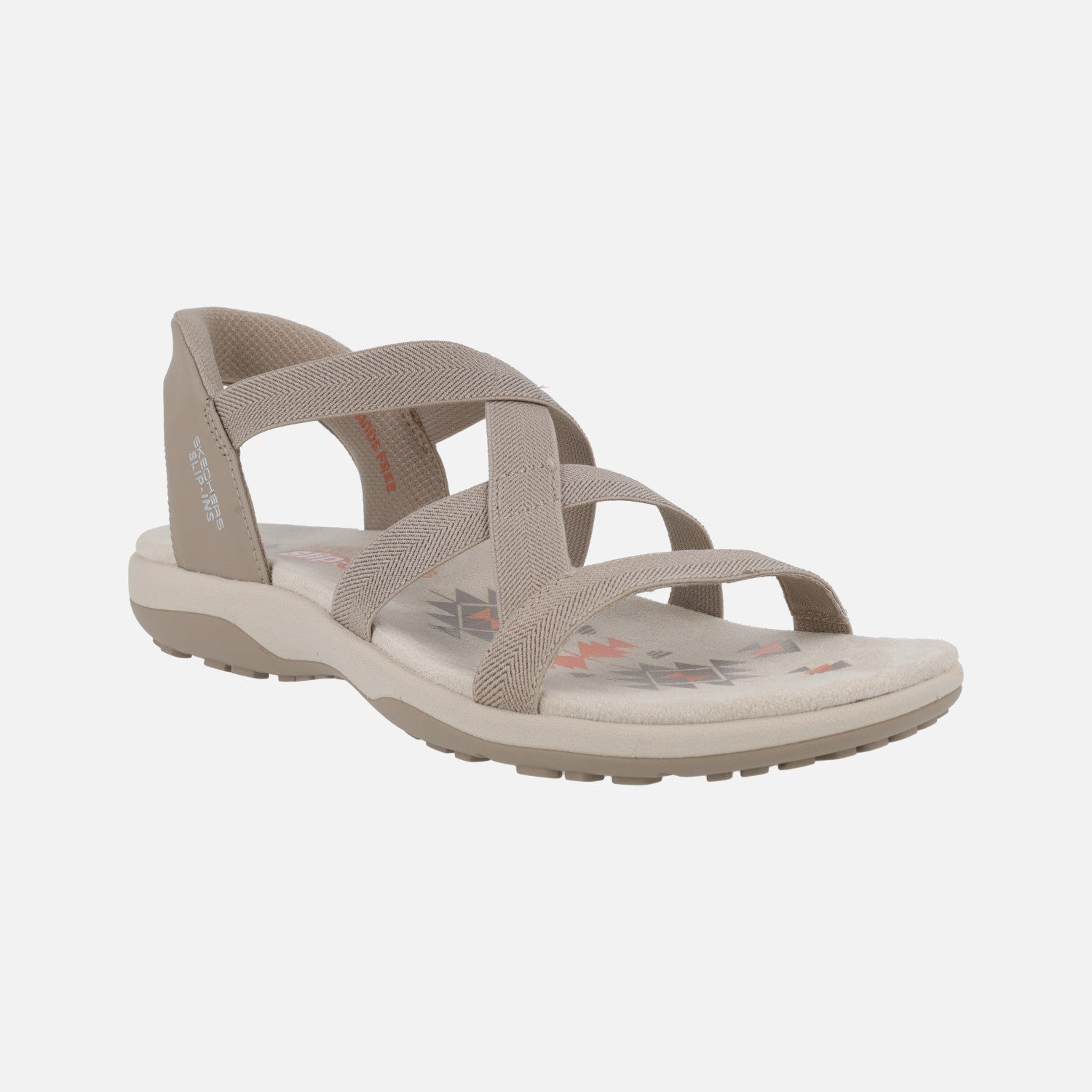 Sandalias para mujer, con tiras elásticas Skechers Slip Ins Reggae Slim-Stretch Flex 163460 TPE. Sandalias color taupe, con sistema de calzado fácil SLIP INS, sin necesidad de usar las manos. Elaboradas en materiales textiles y sintéticos. Planta acolchada. Piso ligero de goma, con 4 cm de altura trasera (2 cm parte delantera).