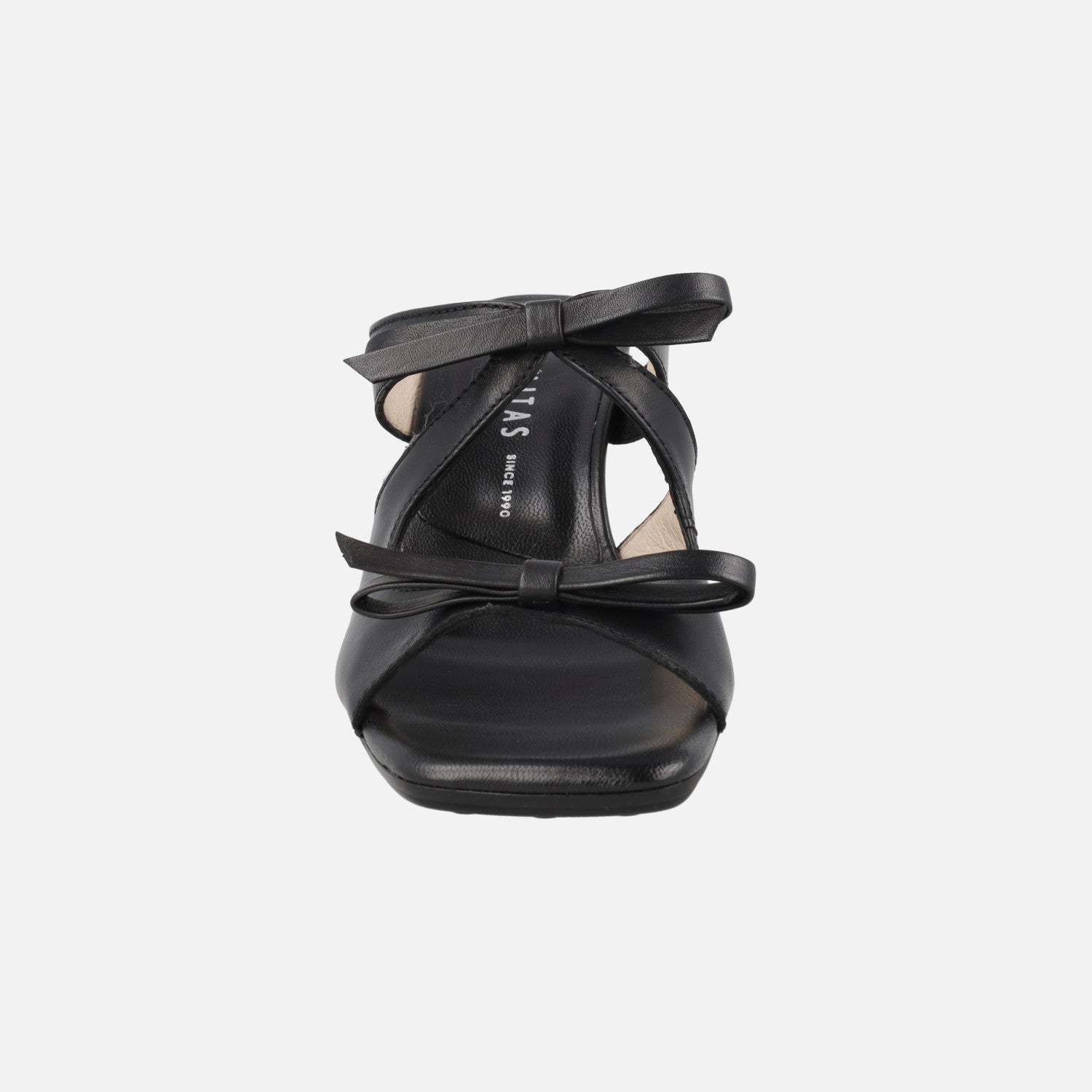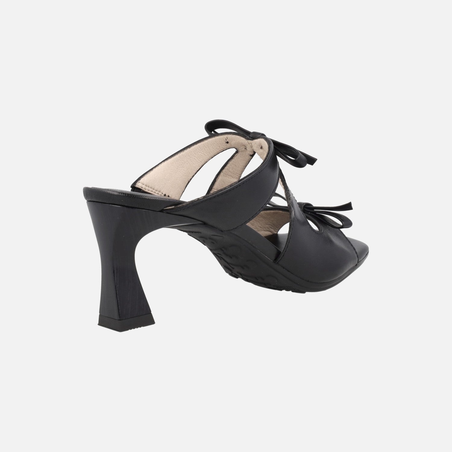 Preciosas sandalias estilo mules de la marca española Hispanitas, modelo HV264701 Rosa, disponibles en color almond (camel) y en color negro. Sandalias de piel, destalonadas, con adorno de lazos en la parte delantera. Interiores forrados en piel y microfibra. Tacones de aproximadamente 7cm de altura (altura total con la planta 8 cm). Suela sintética (poliuretano termoplástico). Tecnología TRIFLOW de triple almohadillado, para un gran confort a la hora de caminar.