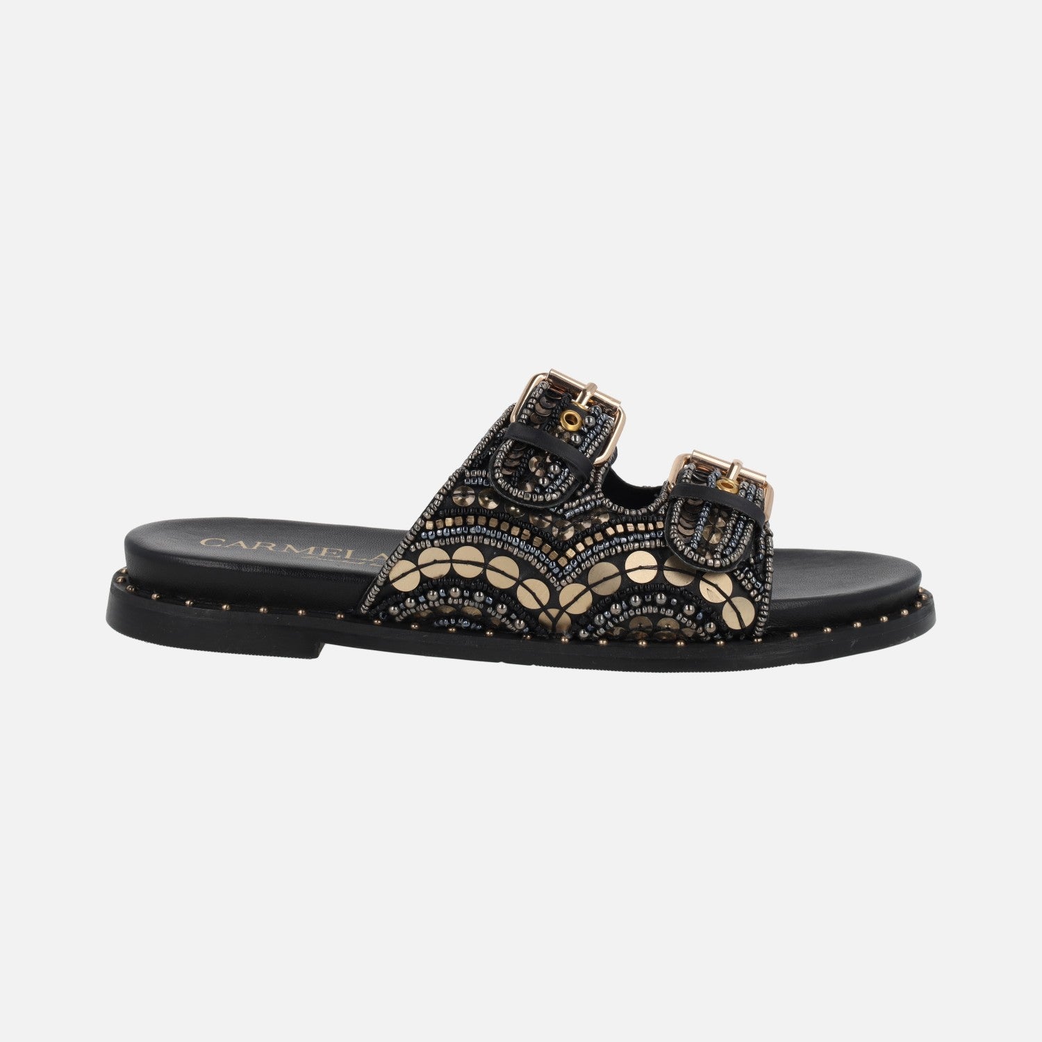 Preciosas sandalias con hebillas de la marca Carmela shoes modelo 163200 negro. Sandalias elaboradas en materiales sintéticos con fantasía de abalorios y lentejuelas. Interiores en piel. Suela sintética de 2,5 cm de altura trasera (2 cm parte delantera).