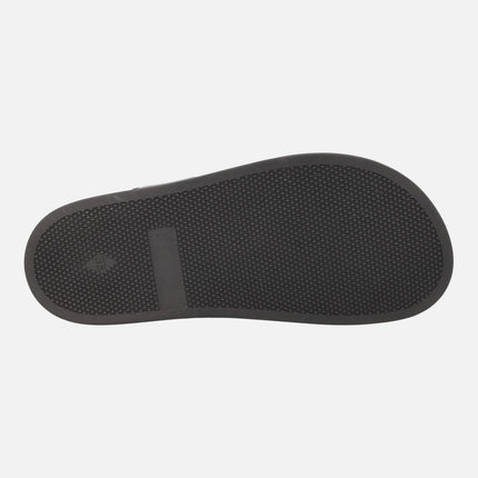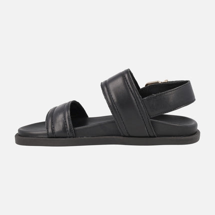 Sandalias negras de piel de la marca Alpe modelo Isabela 5446. Sandalias negras de tiras anchas de piel, la del empeine con adorno metálico dorado hacia el exterior. Tira al talón con cierre de hebilla ajustable. Interiores forrados de piel. Piso de goma con 2,5 cms de altura trasera (2 cms parte delantera).