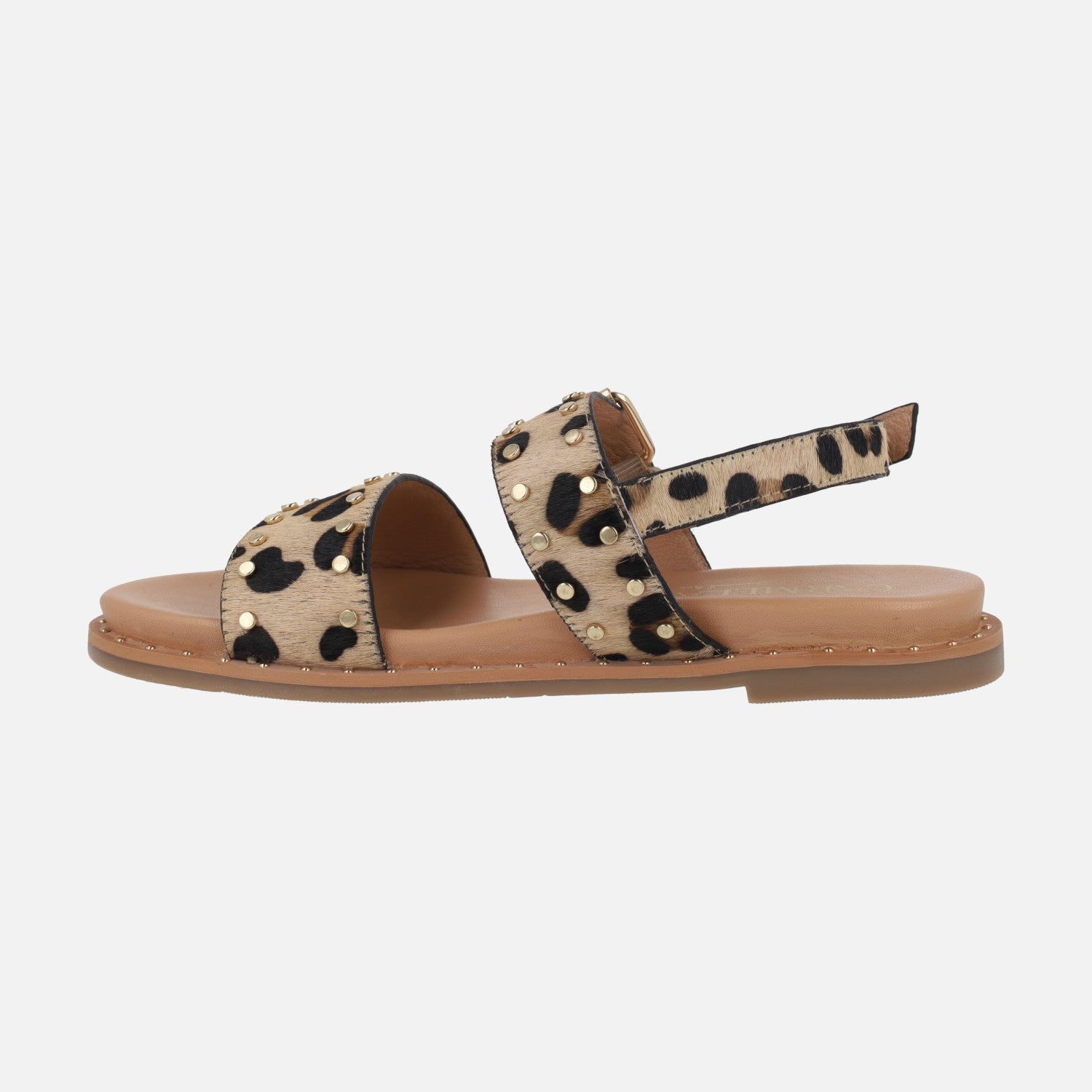 Preciosas sandalias para mujer de la marca Carmela shoes modelo 163197, disponibles en piel negra, piel marrón y print leopardo. Sandalias planas, elaboradas en piel con dos tiras anchas en la parte delantera y una tira más fina que va al talón, con cierre de hebilla ajustable. En las tiras delanteras lleva detalle de tachas metálicas y en la del empeine una hebilla más grande ajustable. Interiores forrados de piel. Suela sintética de aproximadamente 2,5 cm de altura trasera.