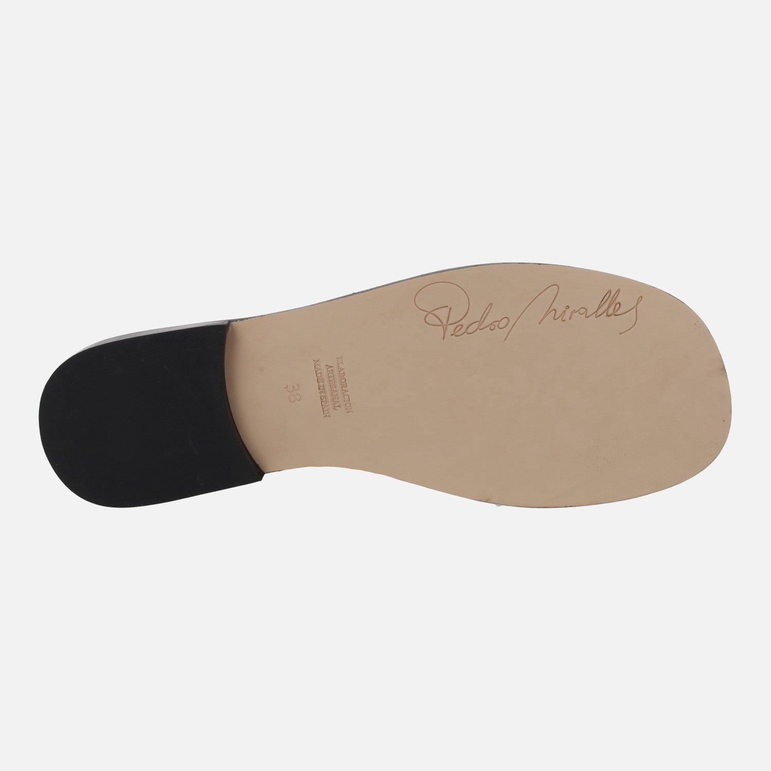Sandalias planas para mujer de la marca Pedro Miralles modelo 18031, disponibles en negro y en marrón testa. Sandalias elaboradas en piel serraje, negras o marrones, totalmete cubiertas de tachas (doradas para el modelo marrón y plateadas para el negro). Además llevan una piedra en el centro, roja para el modelo marrón y azul para el negro. Interiores forrados de piel. Suela sintética de aproximadamente 2 cm de tacón. Elaboración artesanal Made in Spain.
