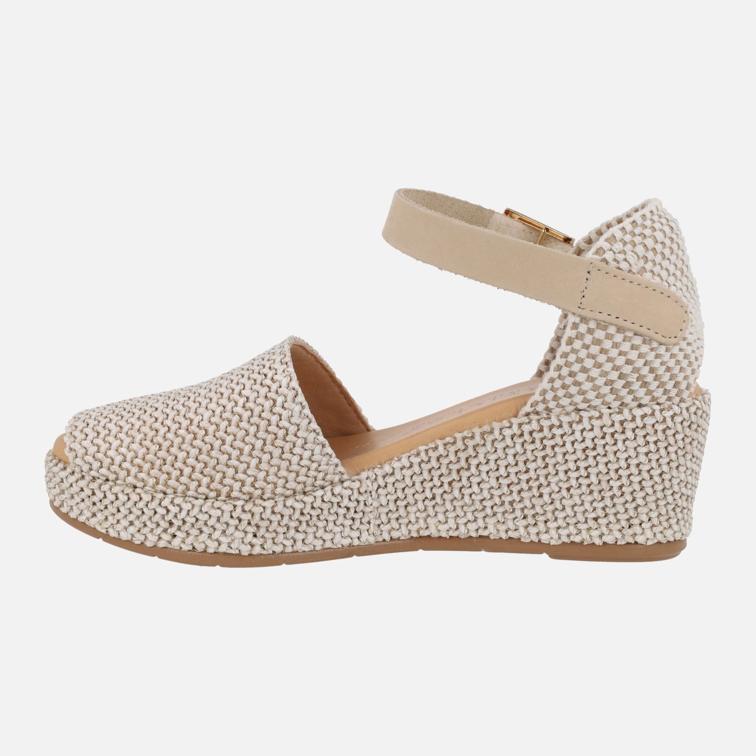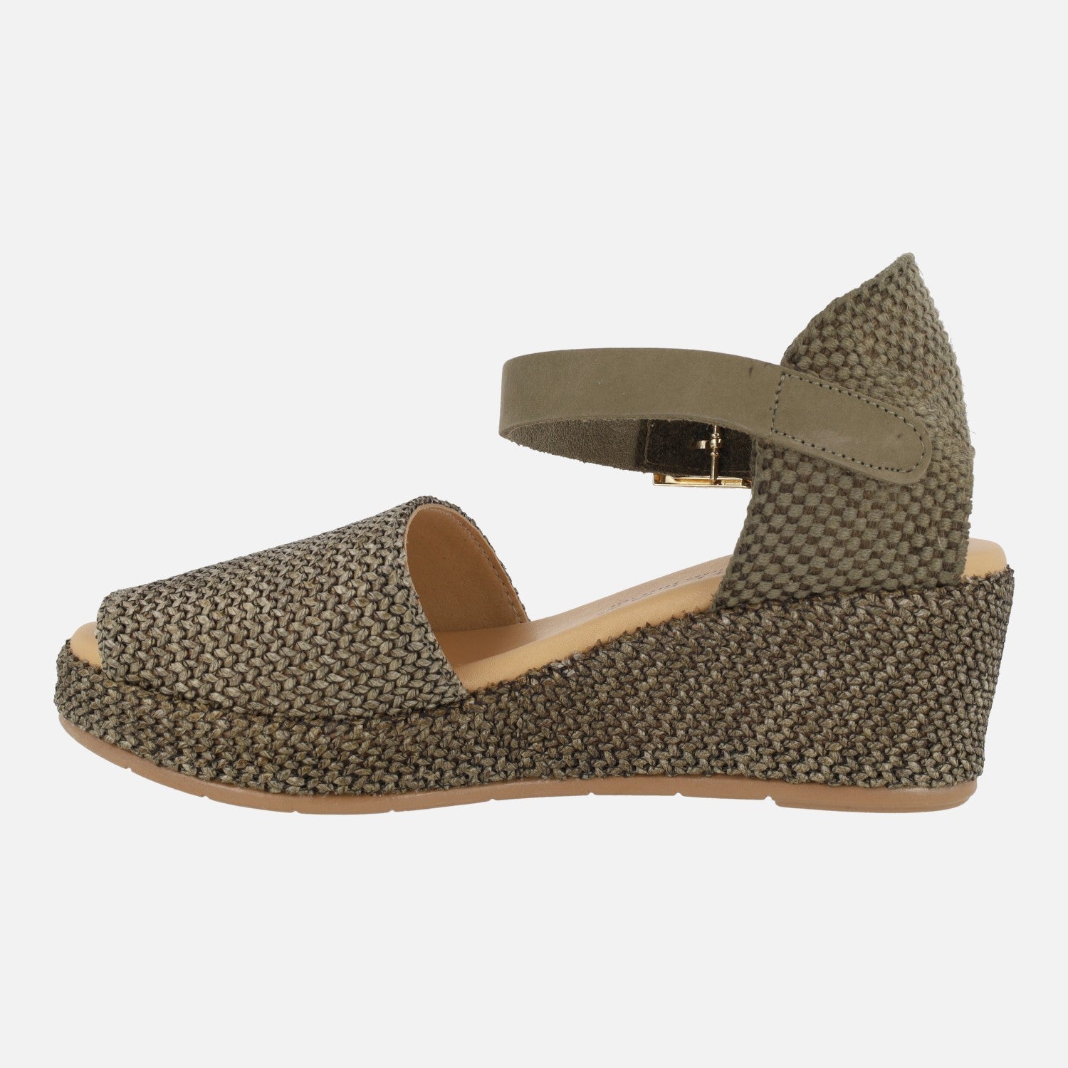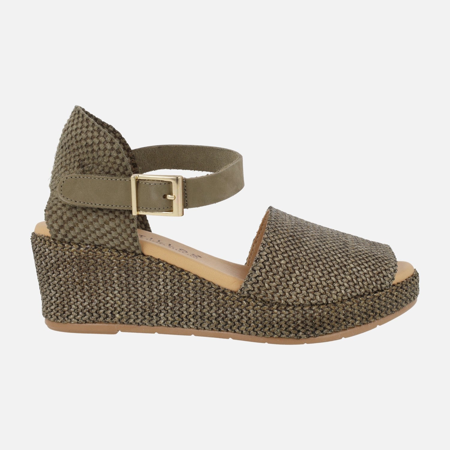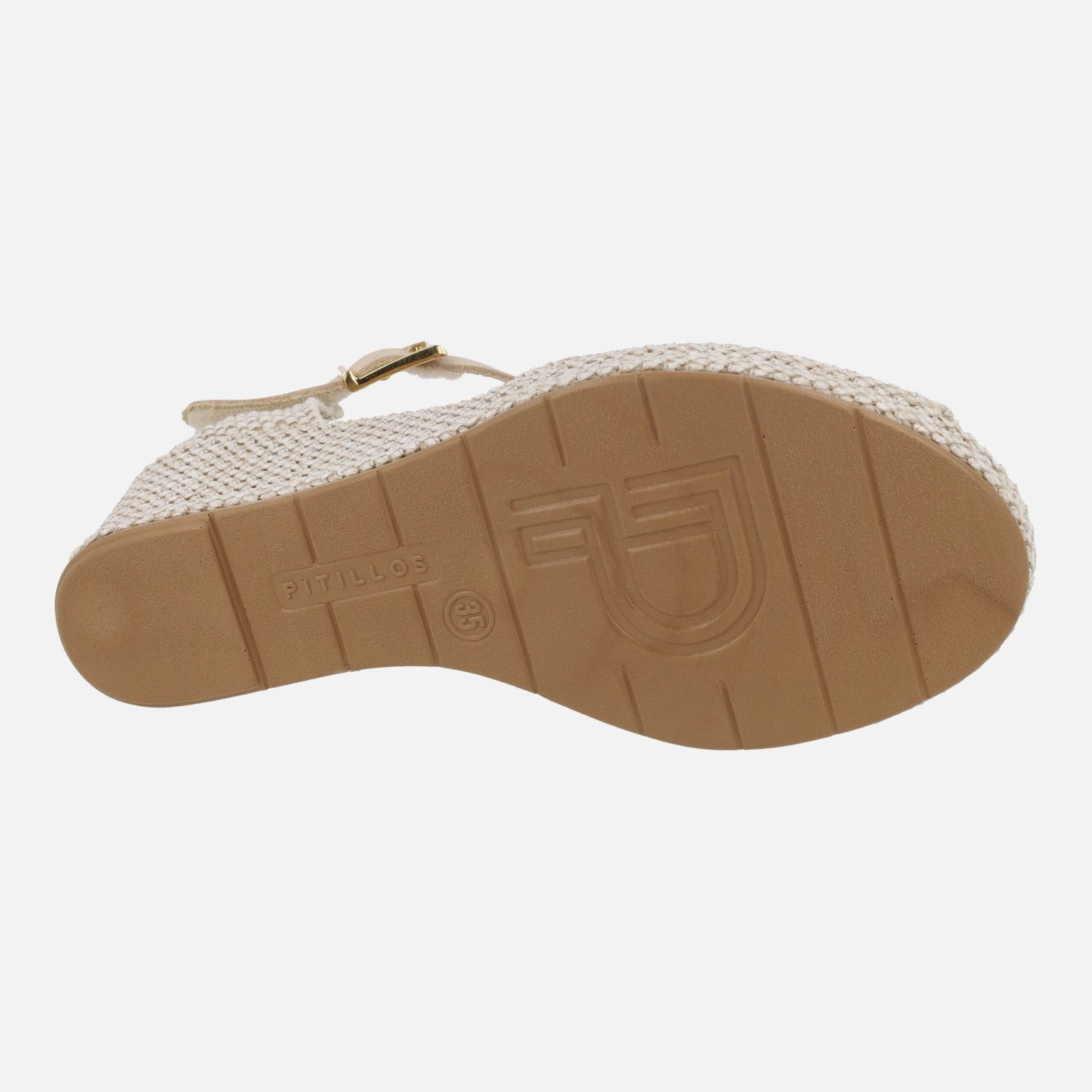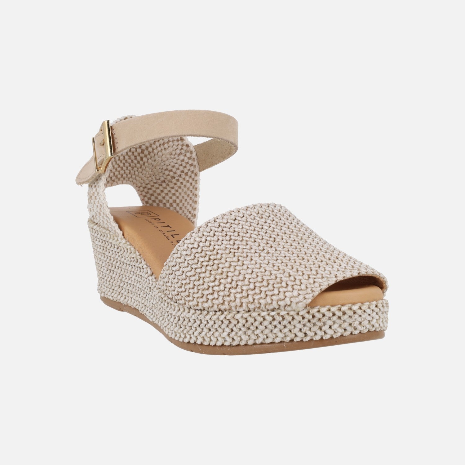 Alpargatas Pitillos modelo 11260, disponibles en natural (beige) y verde kaki. Zapatillas abiertas de puntera, con pieza textil en el talón y una pulsera de piel al tobillo con cierre ajustable de hebilla. Elaboradas en tejido rafia. Interior textil con plantillas de piel. Cuña de 5,5 cm de altura trasera (2 cm parte delantera).