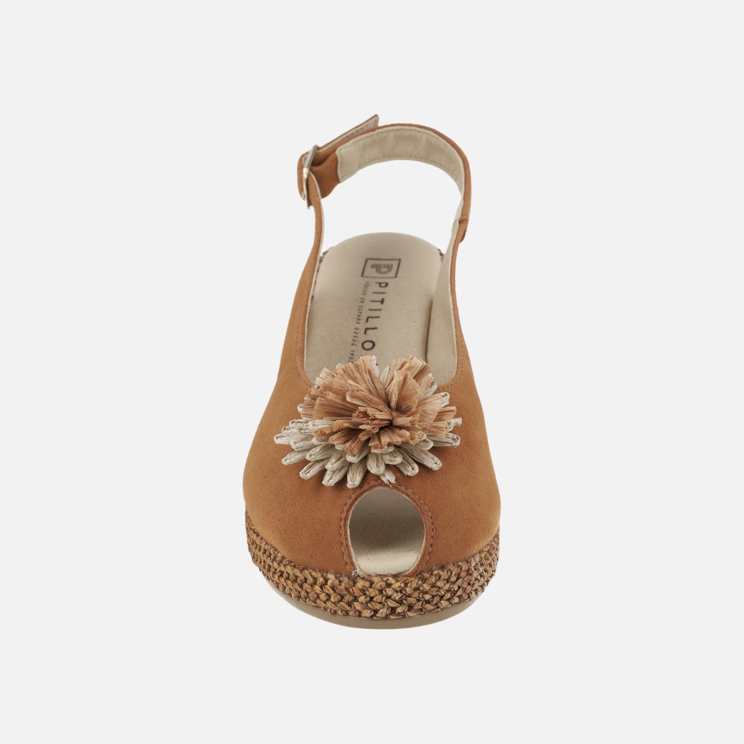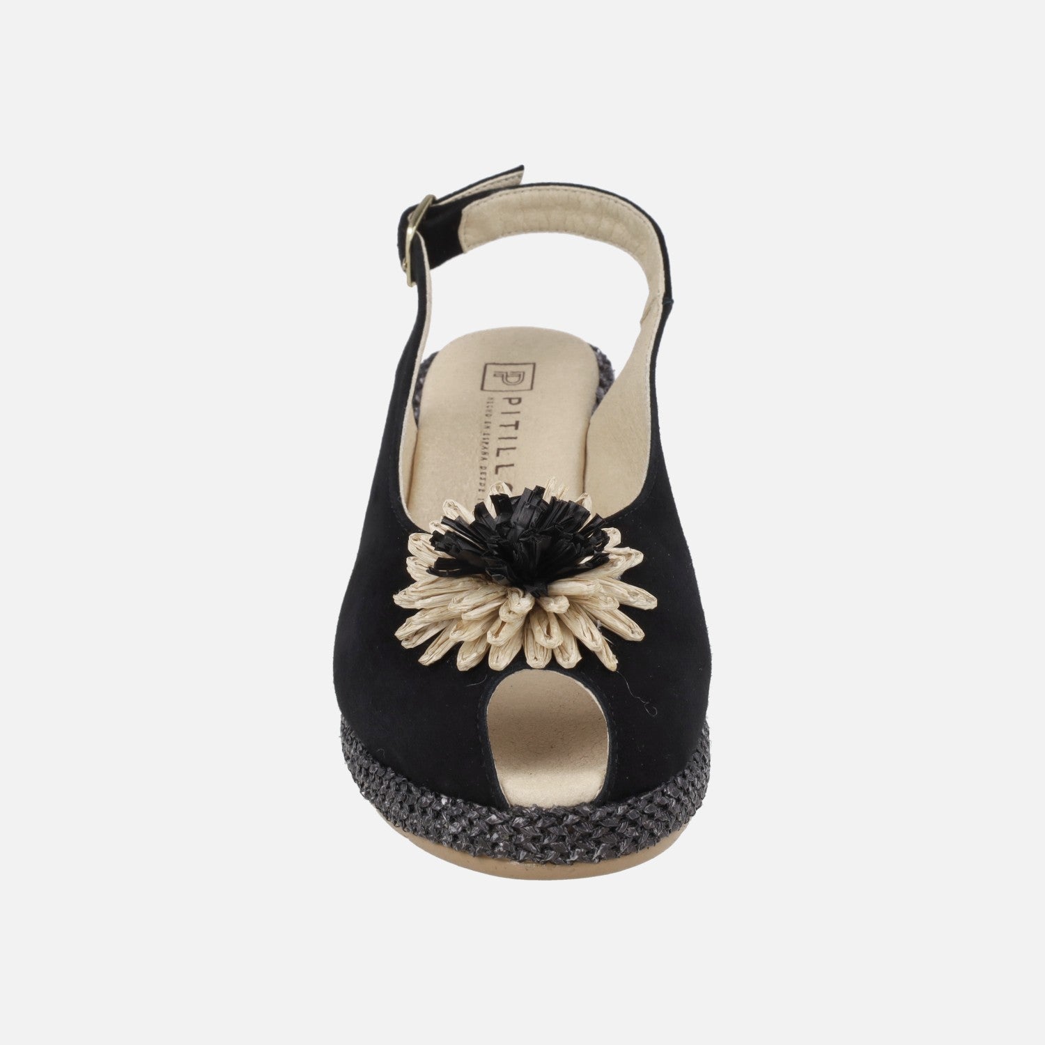 Zapatillas destalonadas para mujer de la marca española Pitillos, modelo 11310, disponibles en negro y en cuero. Zapatillas corte salón, estilo alpargatas, elaboradas en piel ante, con adorno de flor en la pala. Puntera abierta. Tira al talón con cierre de hebilla ajustable. Interiores en tejido. Cuña forrada de rafia, con aproximadamente 6,5 cm de altura trasera (casi 2 cm parte delantera).