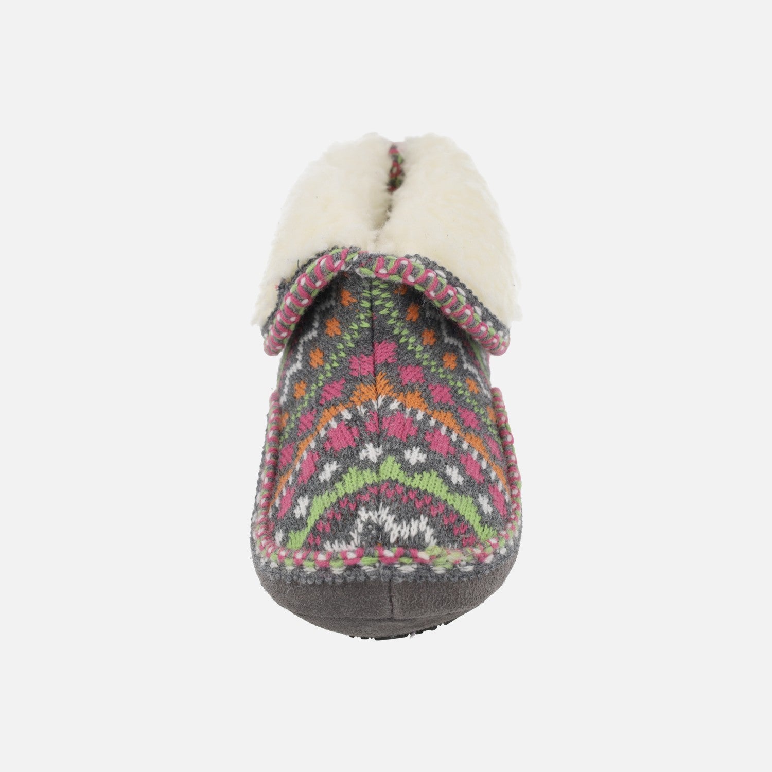Zapatillas de casa para mujer estilo bota de la marca Nordikas, modelo Classic 3600 Panticosa Gris. Zapatillas cerradas y subidas, elaboradas en lana multicolor. Parte de abajo en serraje color gris. Forro y planta de borreguito. Muy calentitas y confortables. Suela de goma y serraje. Altura de caña 11 cms (16 cm si lo estiras y lo dejas sin vuelta) . Altura de piso aproximadamente 3 cm en la parte trasera y 2 cm en la delantera.