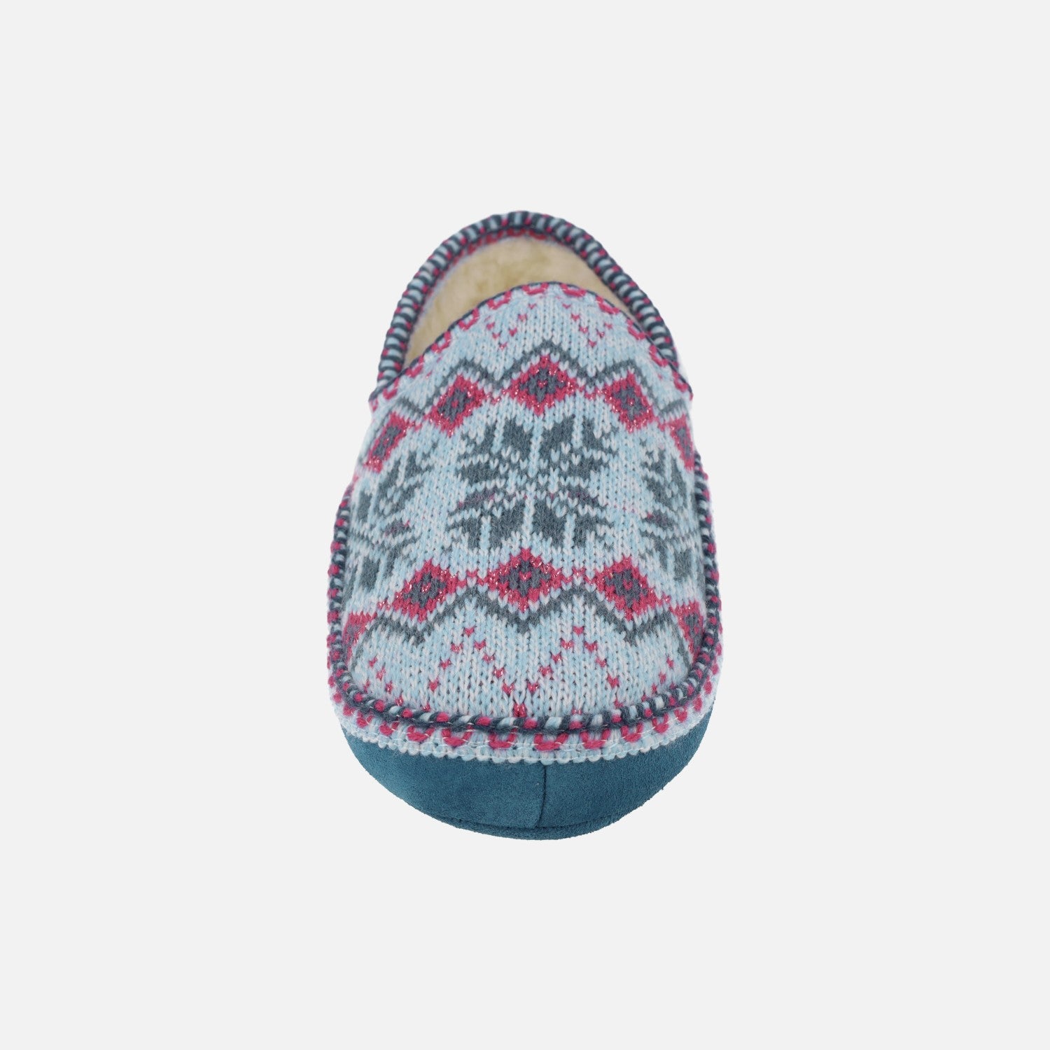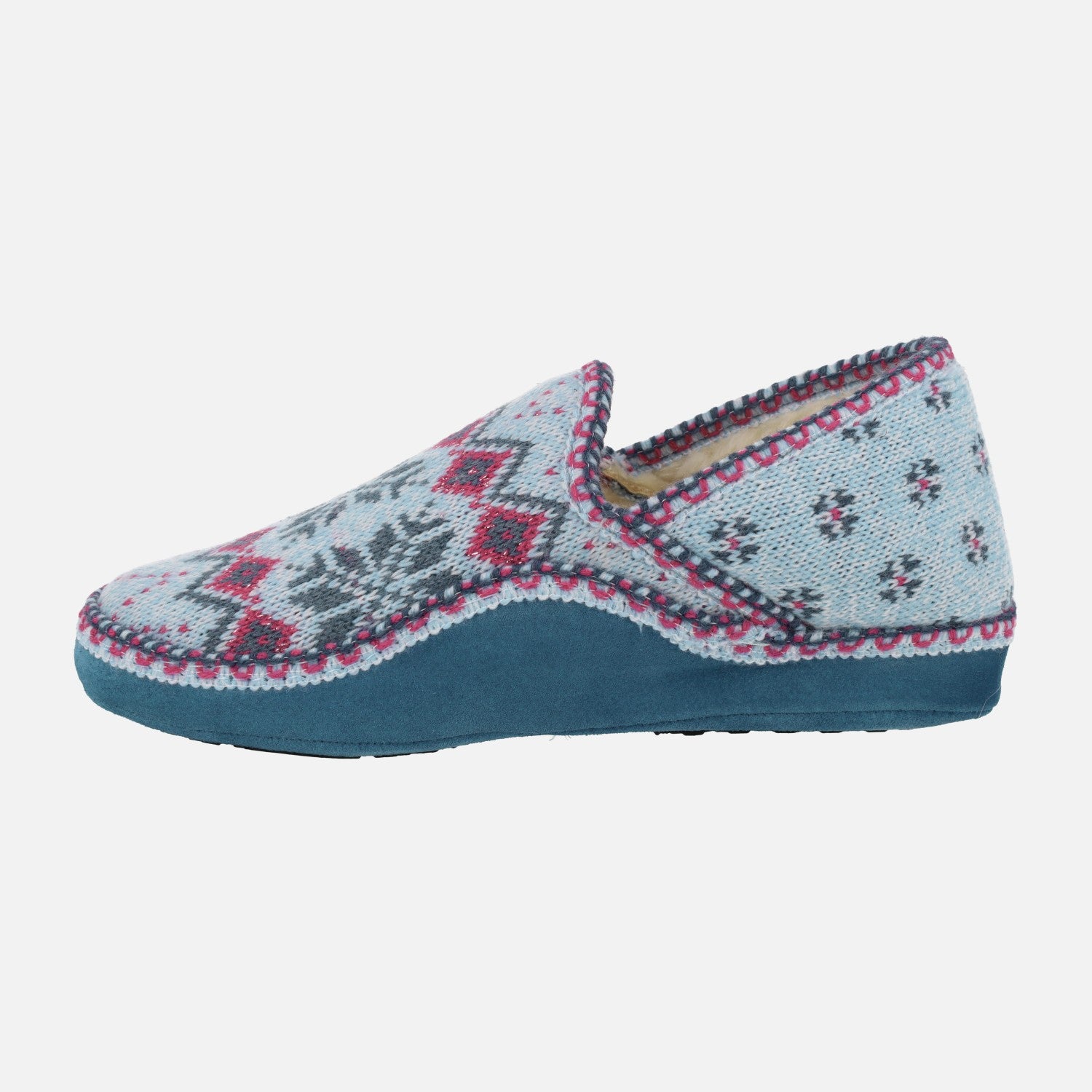 Zapatillas de casa para mujer de la marca Nordikas, modelo Classic 2000 Heidi Zafiro. Zapatillas cerradas elaboradas en lana combinando azules y rosa principalmente. Parte de abajo en serraje color azul. Forro y planta de tejido borreguillo. Muy calentitas y confortables. Suela de goma y serraje. Altura de piso aproximadamente 3 cm en la parte trasera y 2 cm en la delantera.
