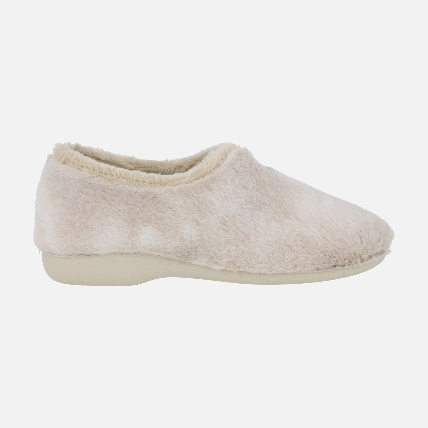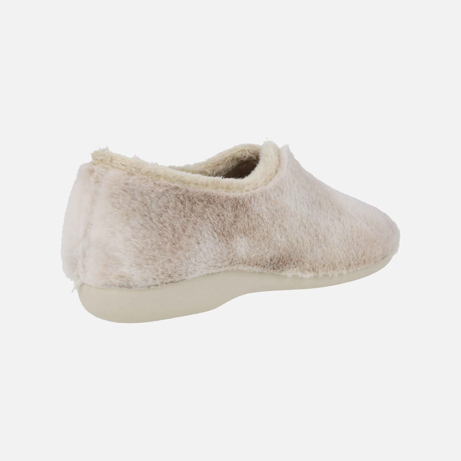 Zapatillas de casa para mujer de la marca Norteñas, modelo 30-325 Beige. Zapatillas de casa cerradas, elaboradas en tejido pelo suave haciendo efecto degradado/manchado. Interior textil afelpado, suave. Piso de goma de 2,5 cms de altura trasera. Made in Spain.