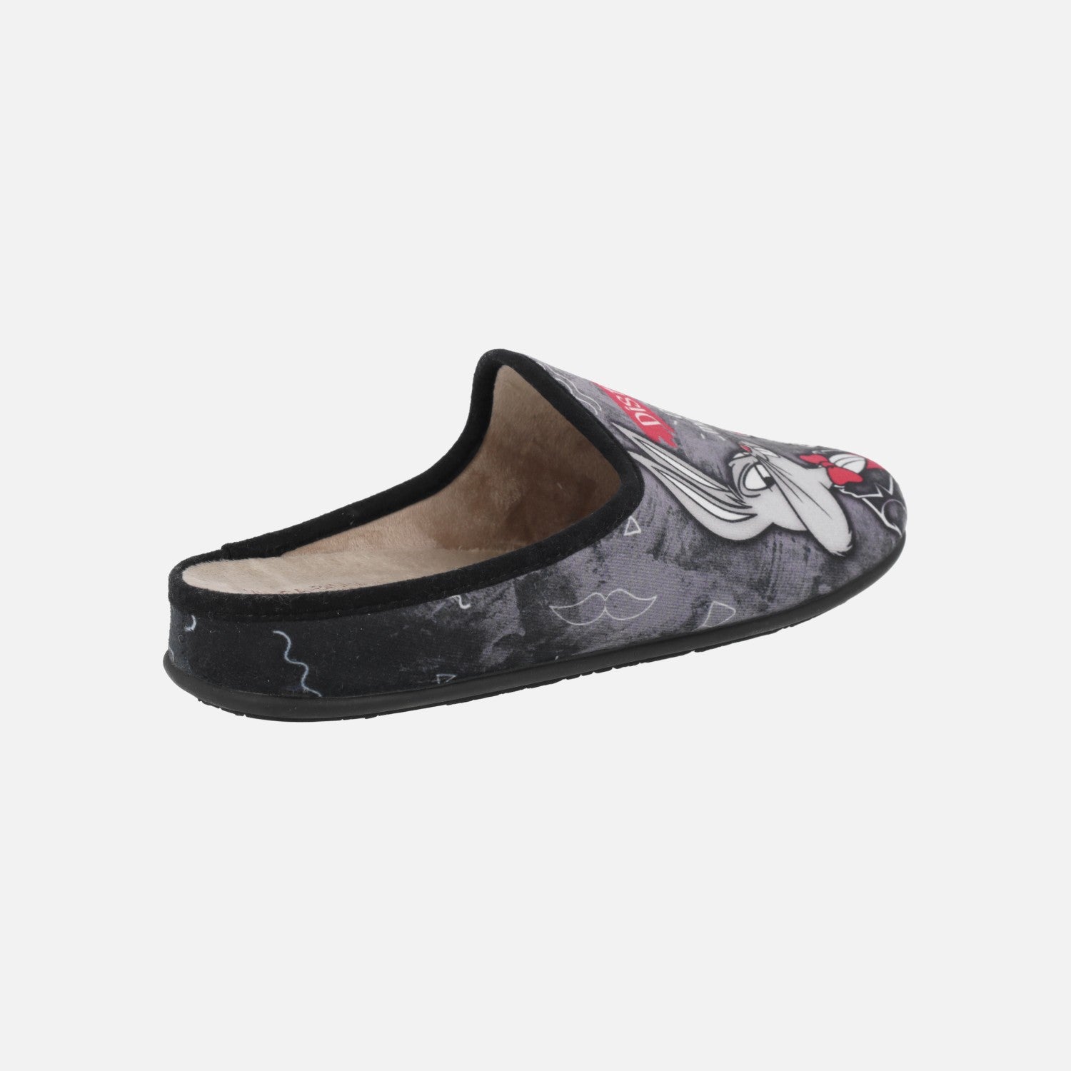 Zapatillas de casa descalzas para hombre de la marca Vulcabicha modelo 1864 Gris/Negro. Zapatillas elaboradas en tejido con detalle de Bugs Bunny y la frase "DISFRUTA CADA MOMENTO". Interior en tejido suave con plantillas extraíbles. Piso de caucho natural. Made in Spain.