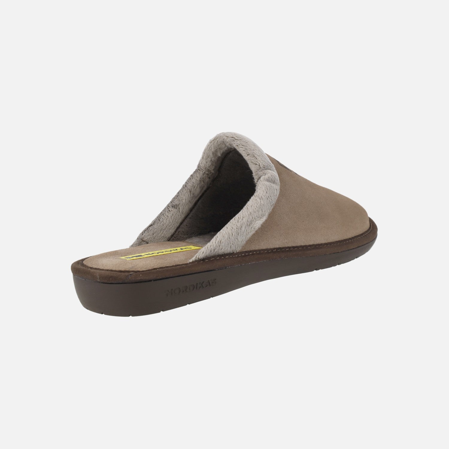 Zapatillas de casa para hombre de la marca española Nordikas, modelo Top Line Cab 513 en Afelpado piedra. Zapatillas descalzas de talón, elaboradas en piel serraje beige taupe con ribete de pelo. Forro afelpado suave. Planta mixta, de piel y tejido afelpado. Piso ligero de goma.