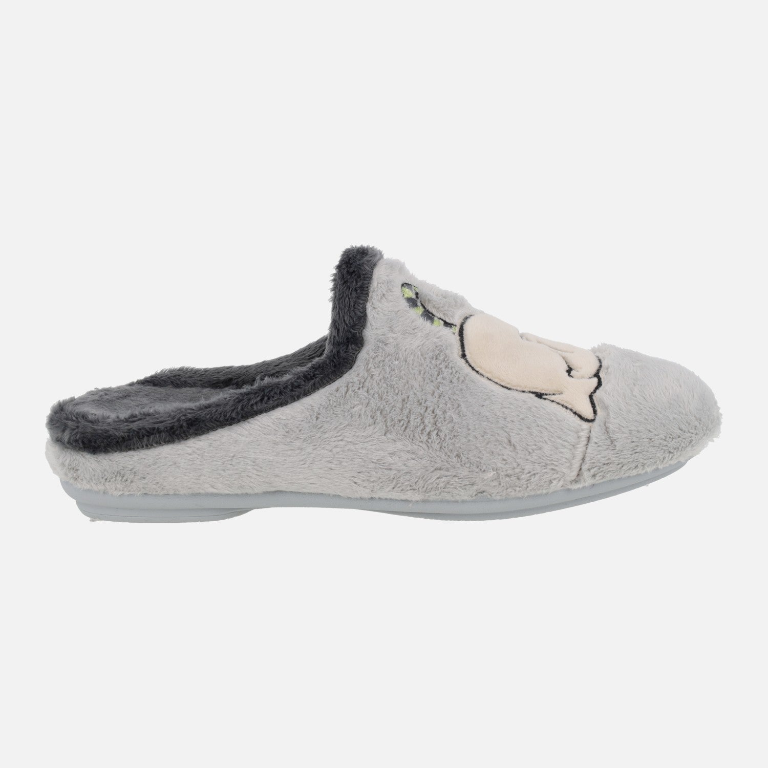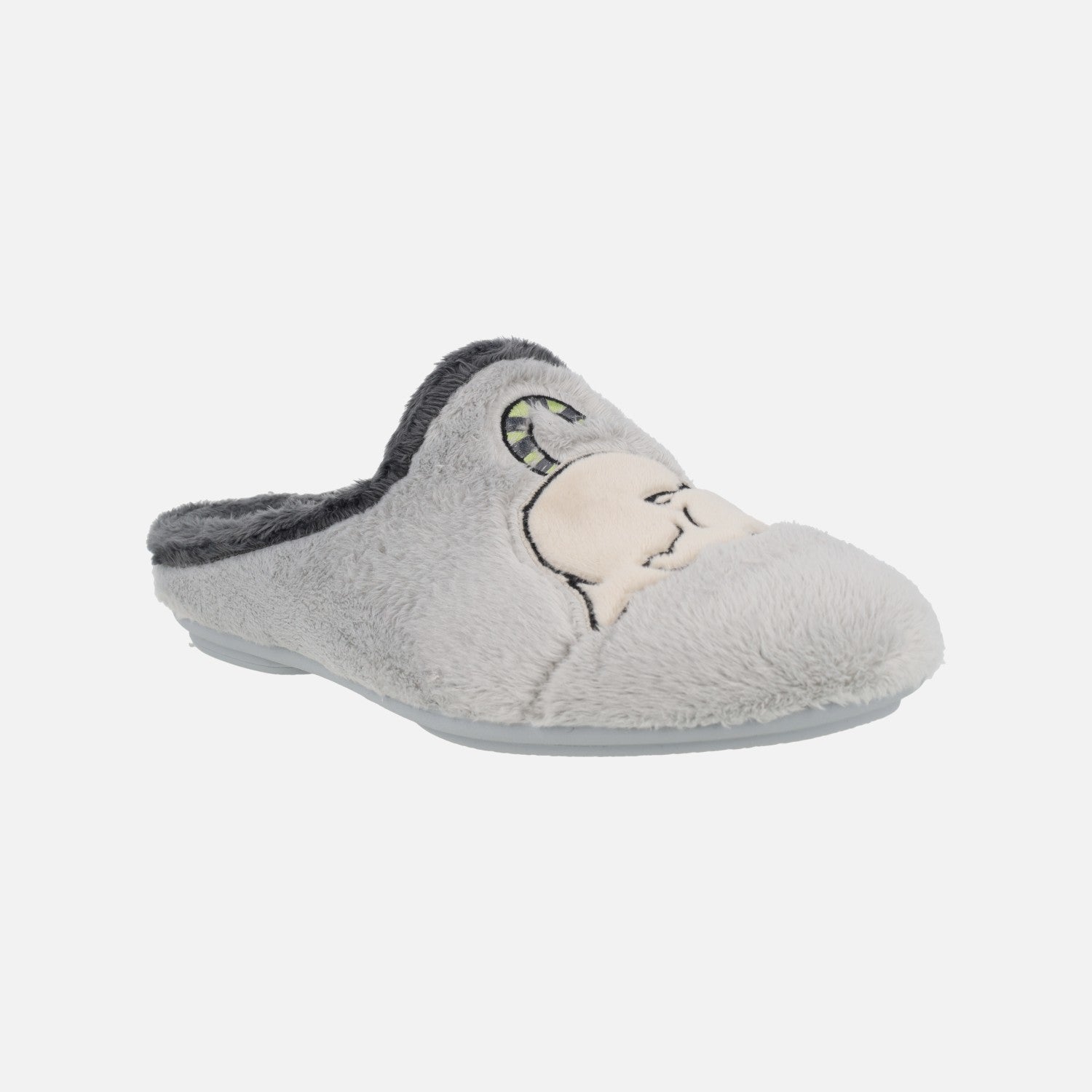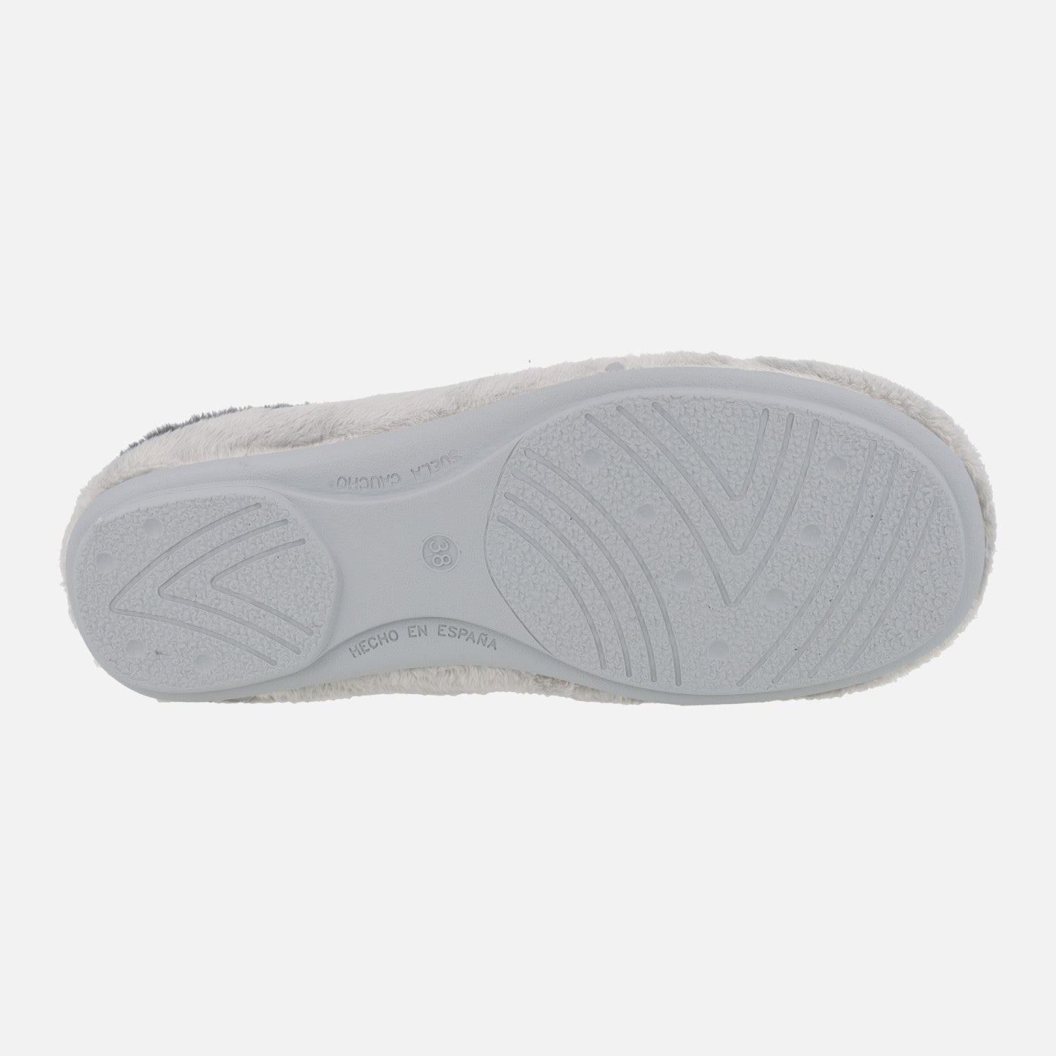 Zapatillas de casa descalzas para mujer de la marca Vulca bicha modelo 4352 ceniza/marengo. Zapatillas de casa abiertas de talón, elaboradas en tejido pelo suave, en color gris con imagen de gatos. Interior en tejido suave, plantillas extraíbles. Piso de caucho. Altura trasera sumando el grosor de la plantilla y el piso 3,5 cm (1 cm en la parte delantera). Hechas en España.