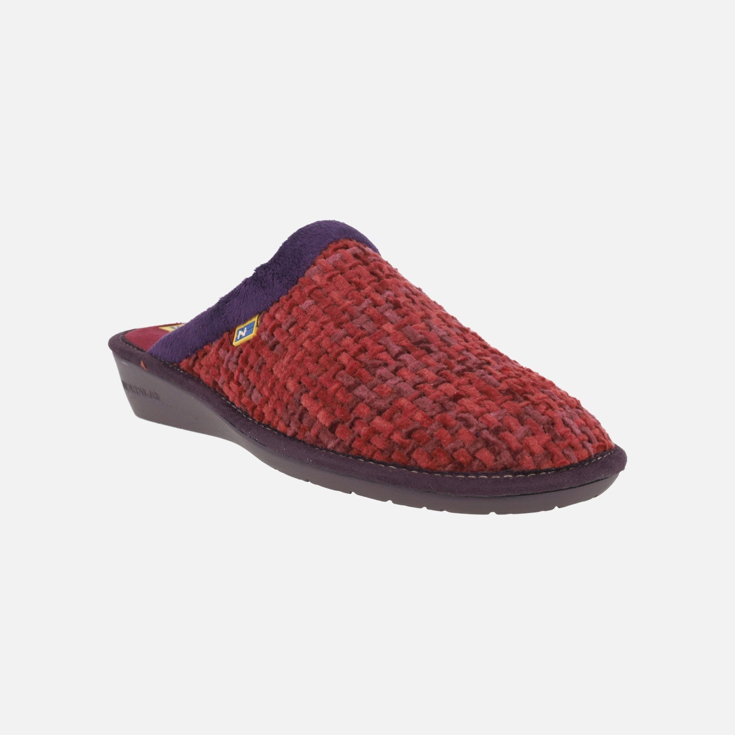 Zapatillas de casa para mujer de la marca Nordikas modelo Classic 2166 Quebec Rubí. Zapatillas descalzas de talón elaboradas en tejido suave combinando burdeos con collarín morado. Interior forrado en tejido afelpado suave, con planta mixta de piel y tejido. Piso de goma con ligera cuña de 3,5 cms de altura (1 cm parte delantera). Made in Spain