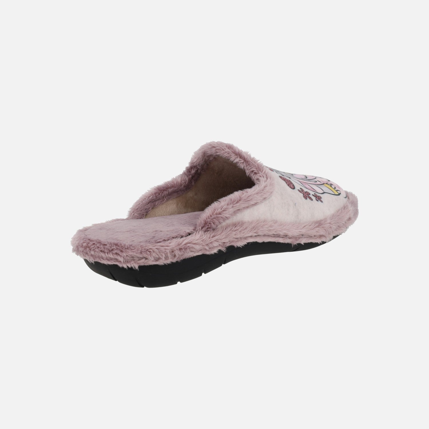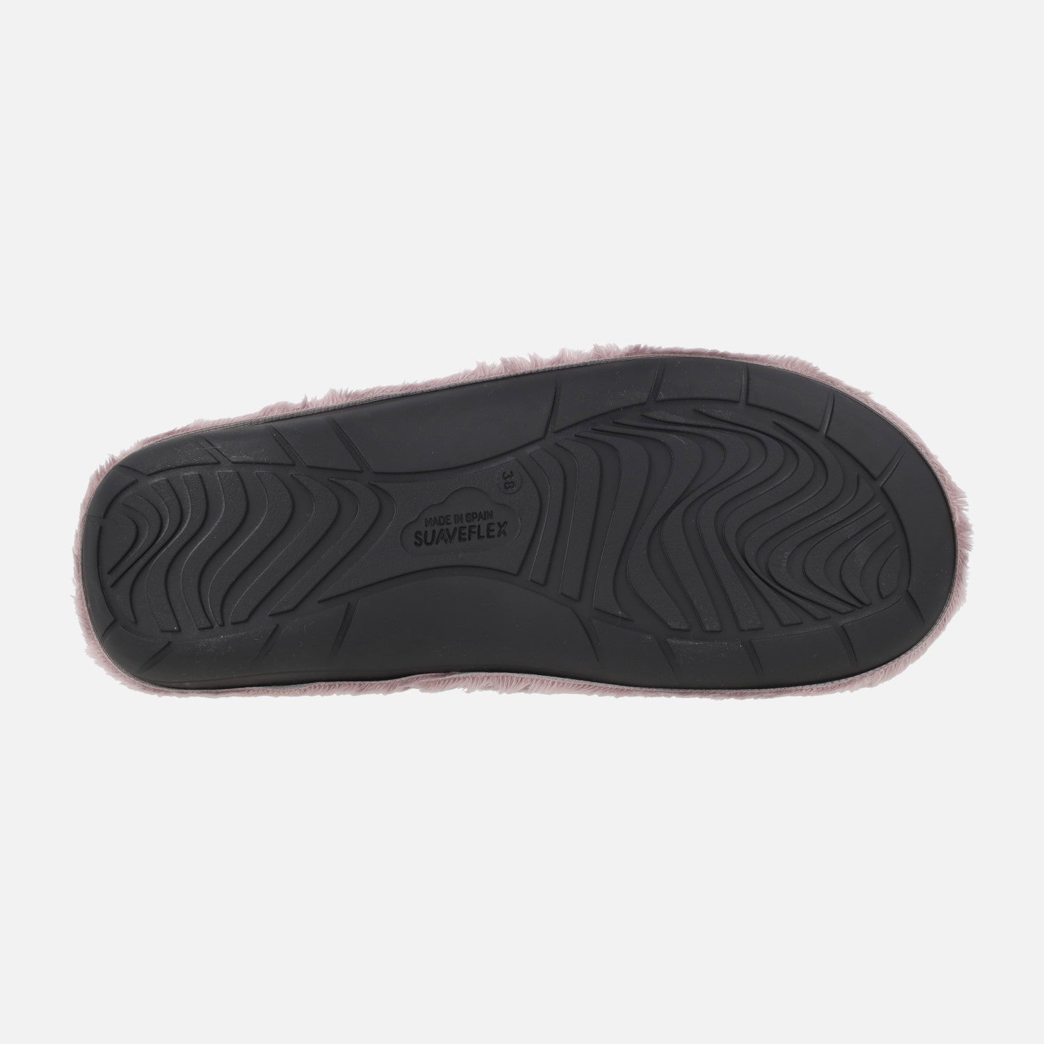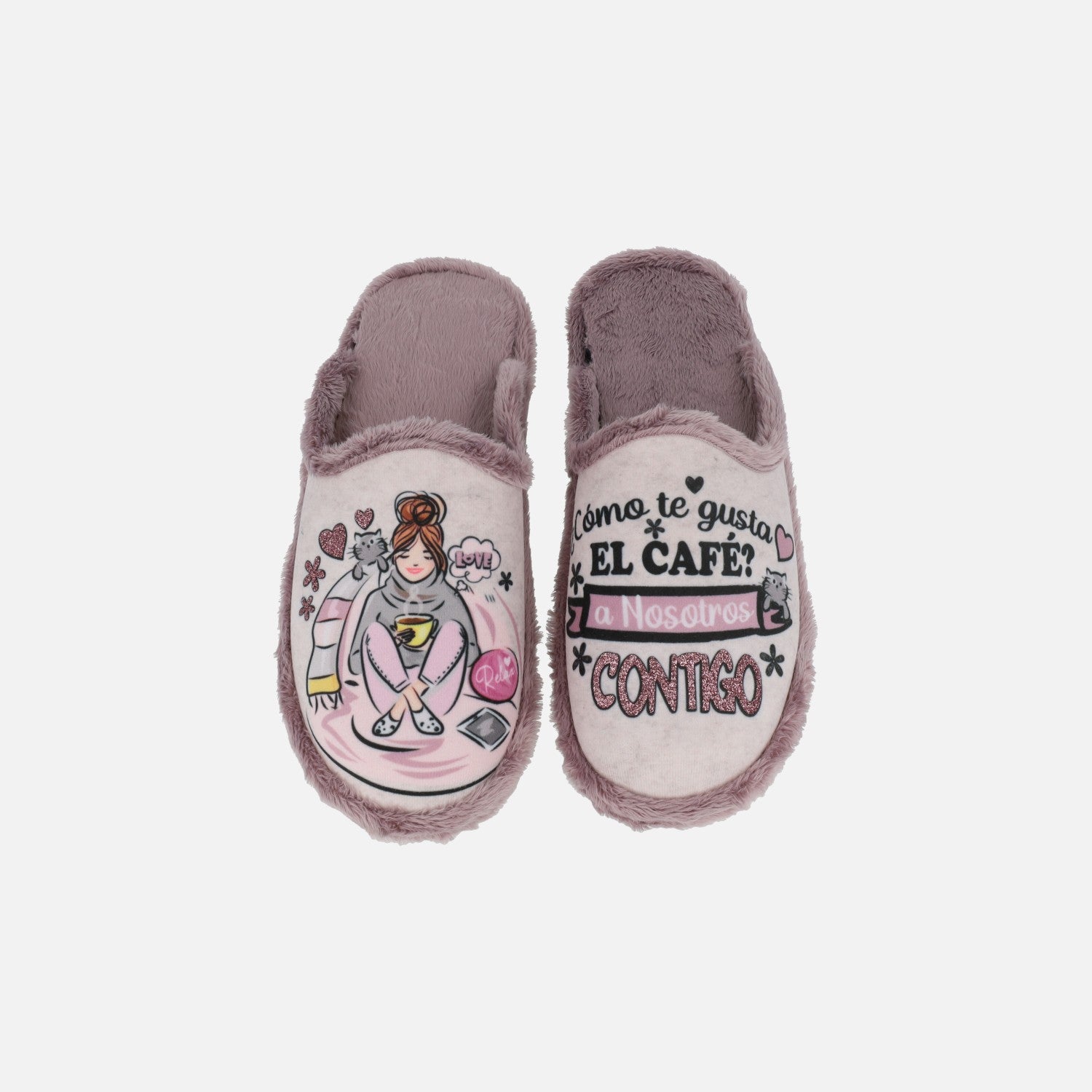Zapatillas de casa abiertas de talón para mujer de la marca Suaveflex, modelo 200 Bison. Zapatillas de casa elaboradas en tejido pelo en tonos rosados y malvas, con diseño de chica con gatito en un pie y la frase "¿CÓMO TE GUSTA EL CAFE? A NOSOTROS CONTIGO" en el otro pie. Interior textil suave con plantillas extraíbles. Piso sintético con 3 cm de altura trasera (2 cm parte delantera). Made in SPain.