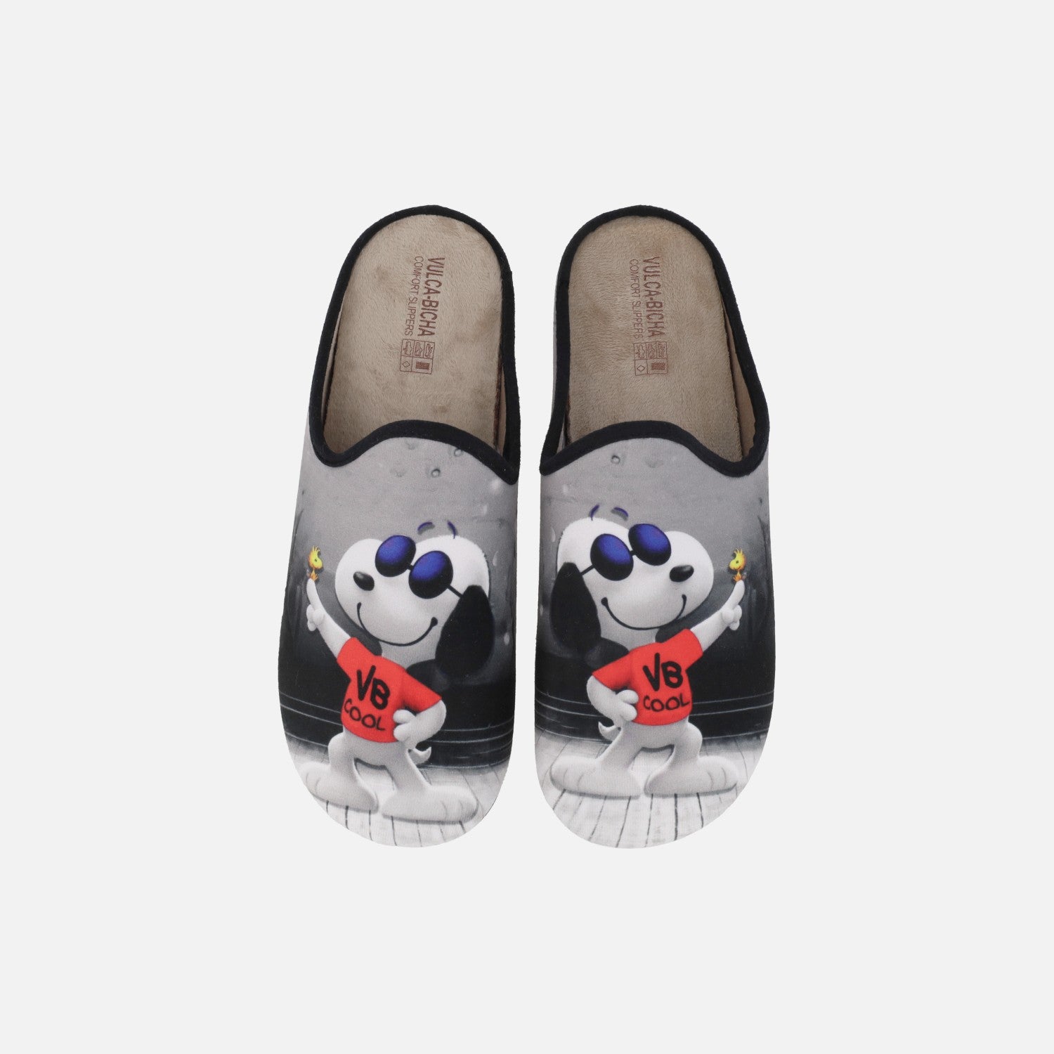 Zapatillas de casa descalzas para hombre de la marca Vulcabicha modelo 1831 Gris/Negro. Zapatillas elaboradas en tejido con detalle de Snoopy con gafas de sol y camiseta Cool. Interior en tejido suave con plantillas extraíbles. Piso de caucho natural. Made in Spain.