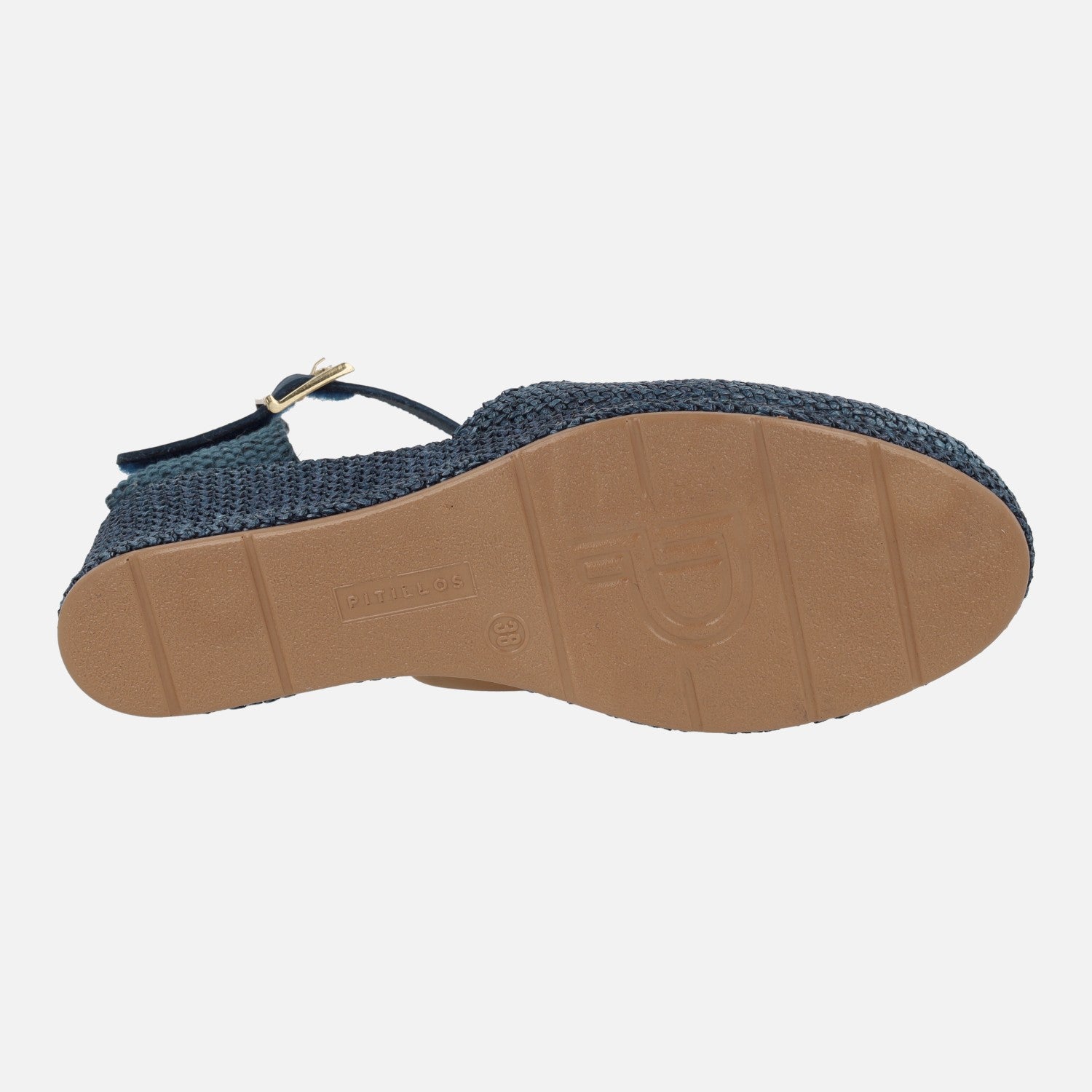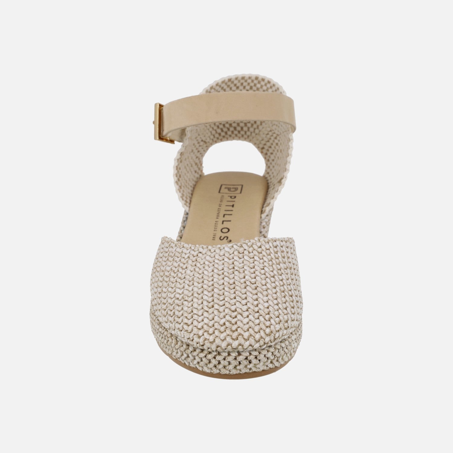 Zapatillas de rafia de la marca Pitillos modelo 11303 Natural. Zapatillas estilo alpargatas, elaboradas en tejido rafia, con pulsera de piel al tobillo, ajustable con hebilla. Color natural (beige). Interior textil. Cuña de 5 cm de altura trasera, forrada en tejido (altura delantera 2 cm).