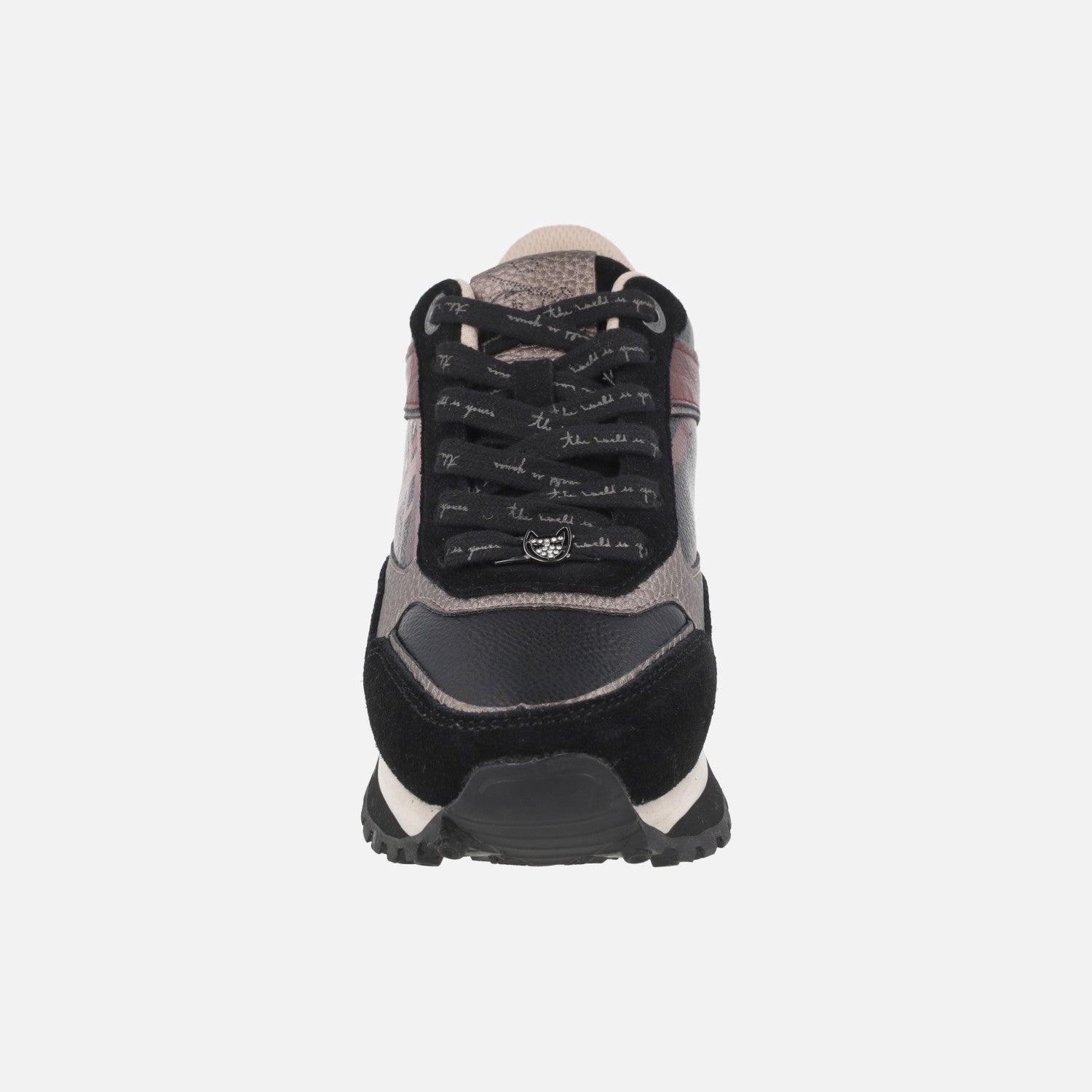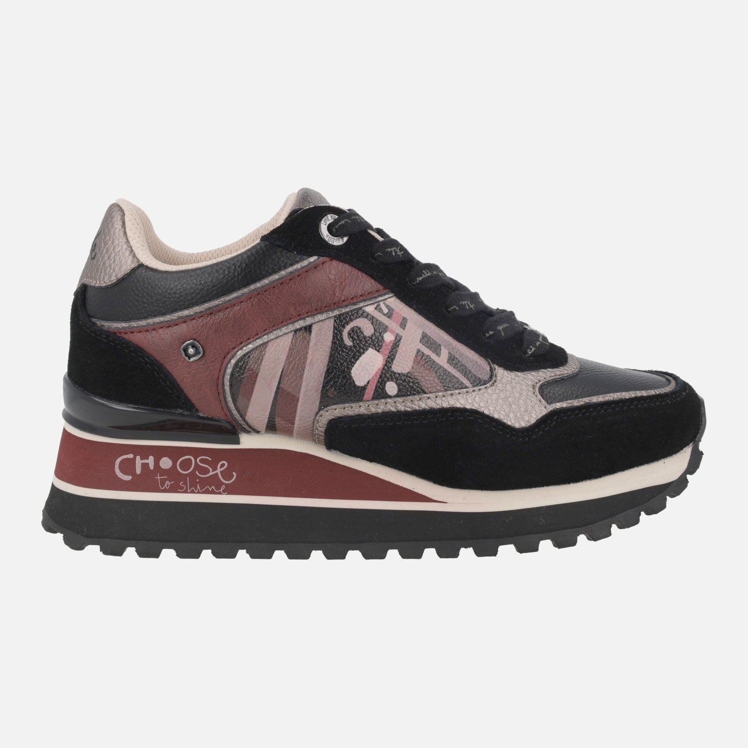 Zapatillas deportivas para mujer de la marca Anekke modelo 41380 Negro. Deportivos elaborados en piel serraje y sintéticos, en un combinado de negro y burdeos predominantemente. Cierre de cordones. Interior textil con plantillas extraíbles. Piso sintético de 5 cm de altura trasera (2,5 cm parte delantera). Mensaje "Choose tu shine" (elegido para brillar) en el piso.