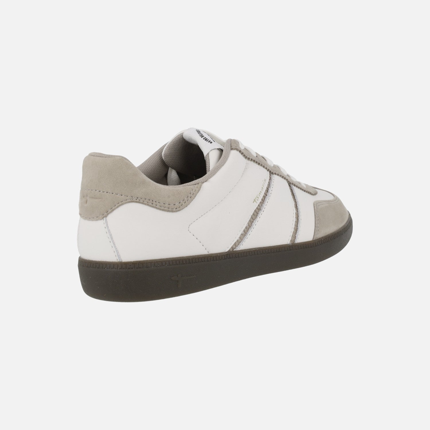 Zapatillas deportivas para mujer de la marca Tamaris modelo 1-23624-43 Offwhite. Zapatillas bajas, con cordones, elaboradas en combinado de piel serraje y sintéticos, en tonos blancos y taupe. Interior textil. Piso de goma, con una altura trasera de 2,5 cm (2 cm parte delantera).