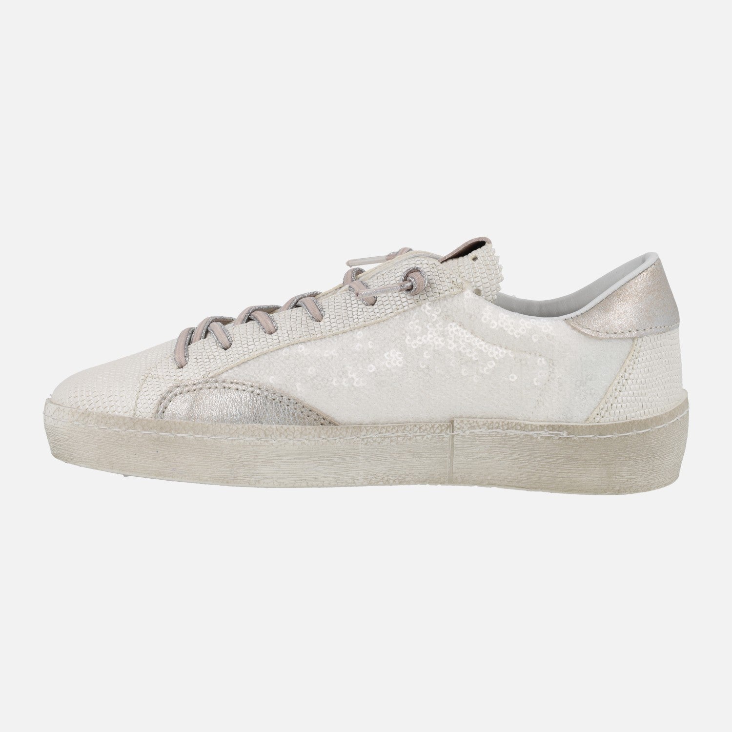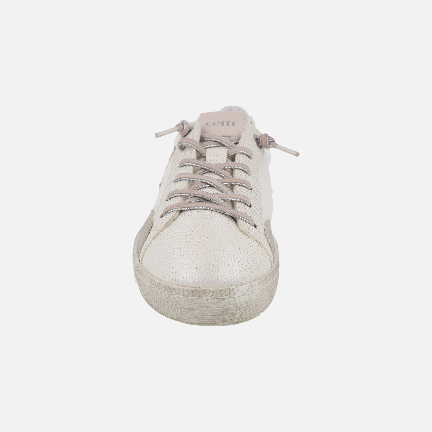 Preciosas deportivas estilo casco de la marca Cetti modelo c-1342 Blanco. Zapatillas elaboradas en piel blanca print serpiente, combinada con lentejuelas blancas y detalles en rosa y metalizados. Cordones elásticos. Logo de media estrella Cetti en el lado exterior. Interior textil con plantillas de piel extraíbles. Piso sintético, de 3 cm de altura trasera y 2 cm en la parte delantera.
