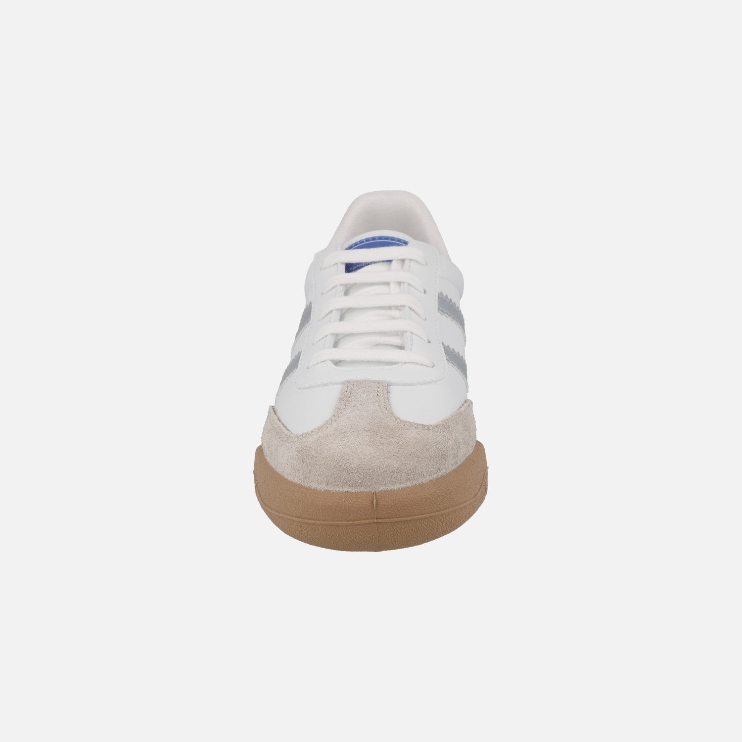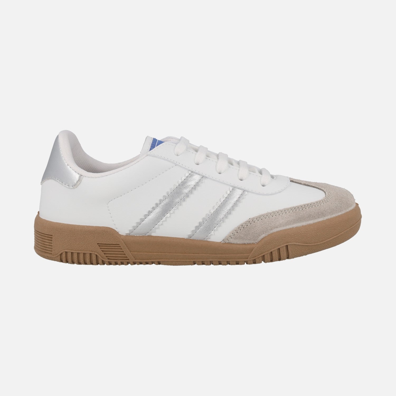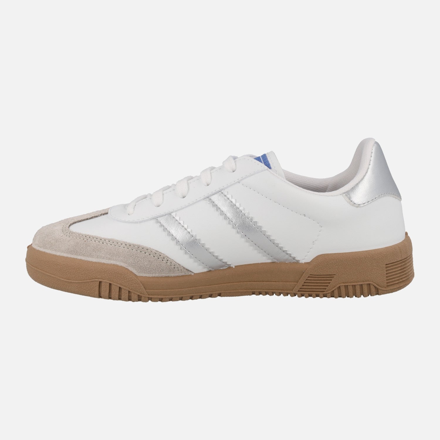 Zapatillas deportivas para mujer de la marca Roal, modelo A35008. Sneakers elaboradas en sintético blanco, con detalle de dos franjas en cada lado y la talonera contrastadas en plata. Cierre de cordones textiles. Interior textil con plantillas extraíbles. Piso de goma color caramelo de 2,5 cm de altura trasera (1,5 cm parte delantera). Made in Spain.