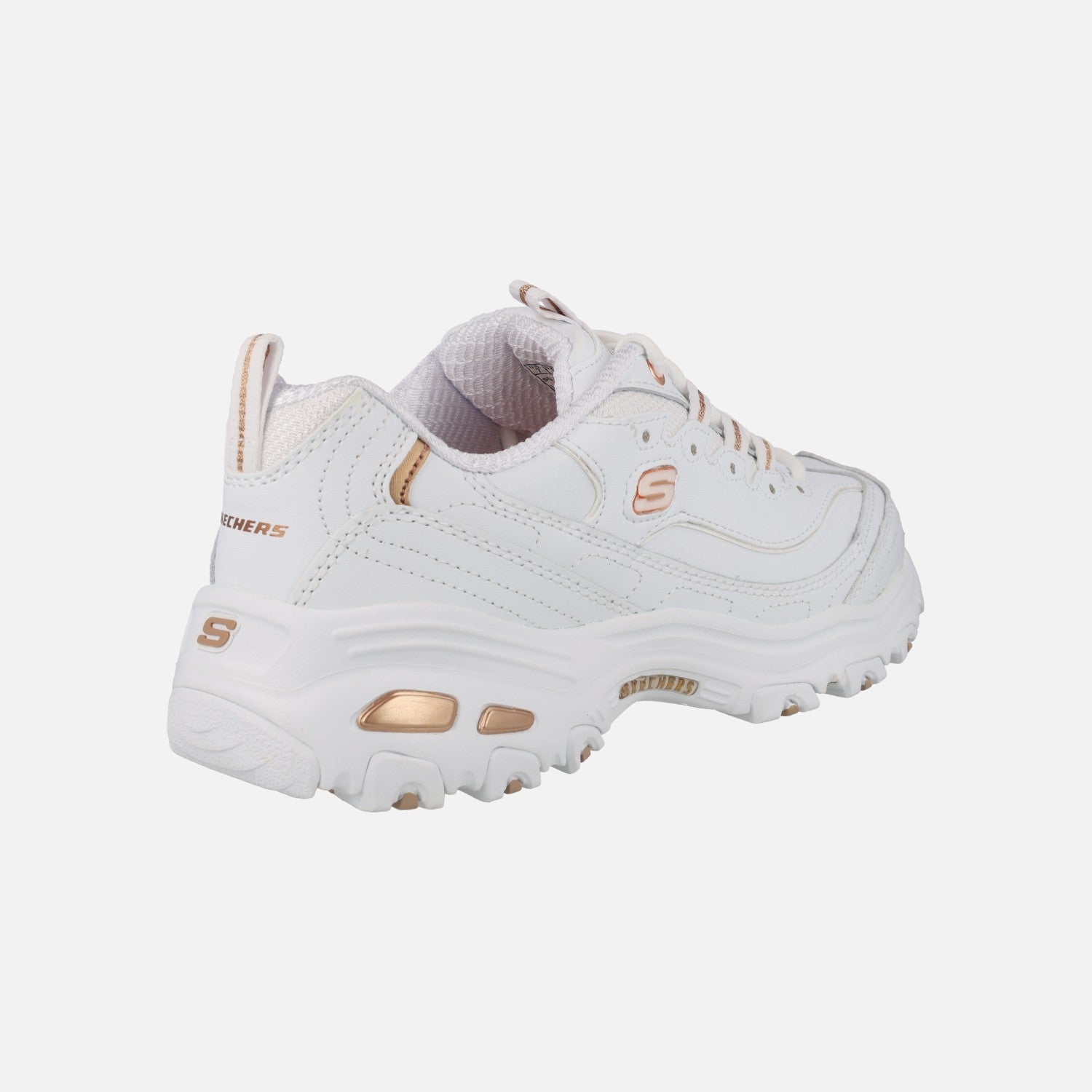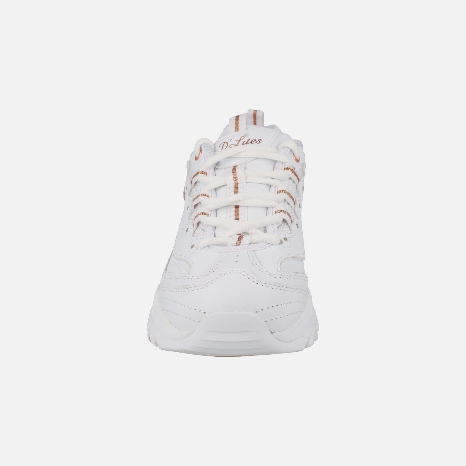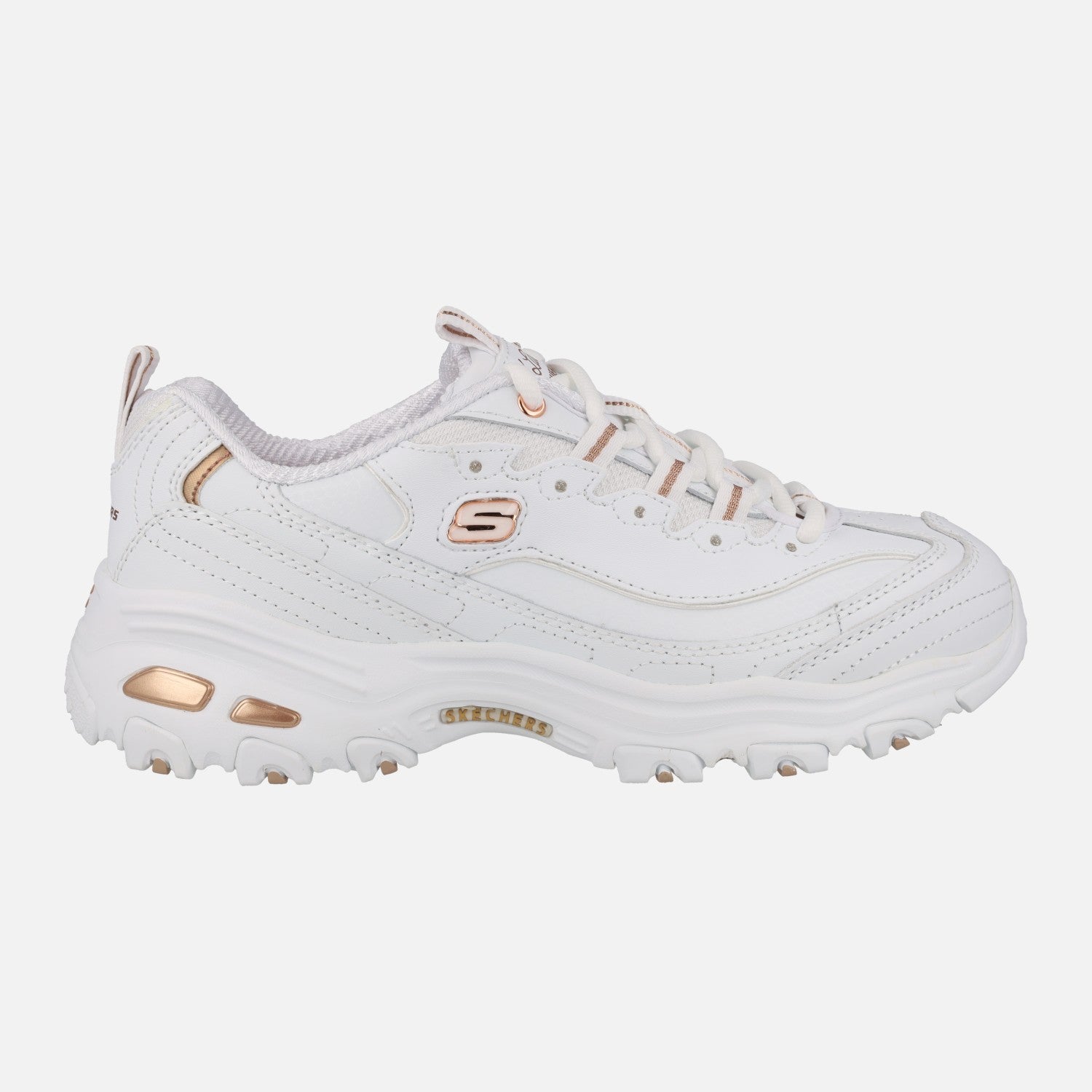 Zapatillas deportivas Skechers D'lites Fresh Start White Rose Gold 11931 wtrg. Zapatillas de cordones, elaboradas en combinado de piel y sintéticos, en color blanco con detalles metalizados. Interior textil, con plantillas Air cooled Memory foam. Piso volúmen con 4,5 cms de altura trasera (3 cms parte delantera).