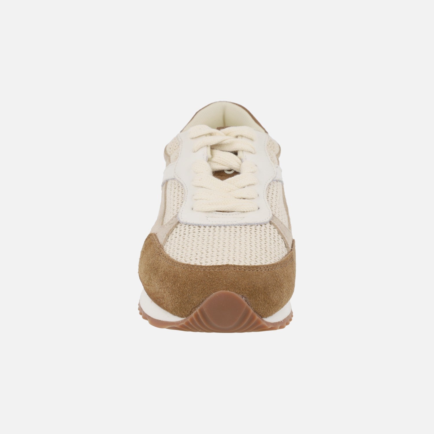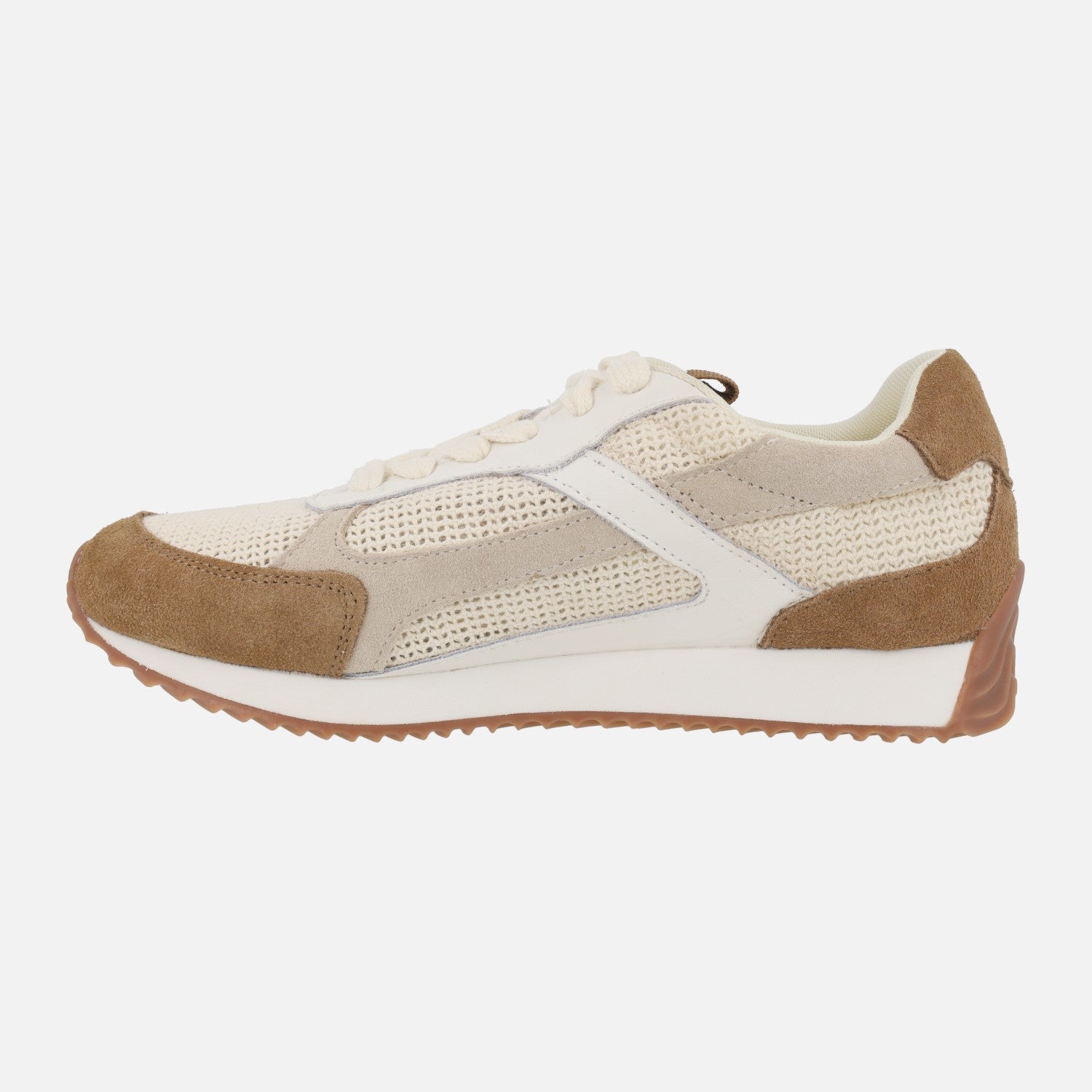 Zapatos deportivos para mujer de la marca Gioseppo modelo 78054 BUSIA Beige. Deportivas elaboradas en combinado de piel, serraje y tejido crochet, en tonos marrones y beige. Cierre con cordones textiles. Interior textil. Plantillas extraíbles. Piso de goma con una pequeña cuña de 3,5 cm de altura trasera (2 cm parte delantera).