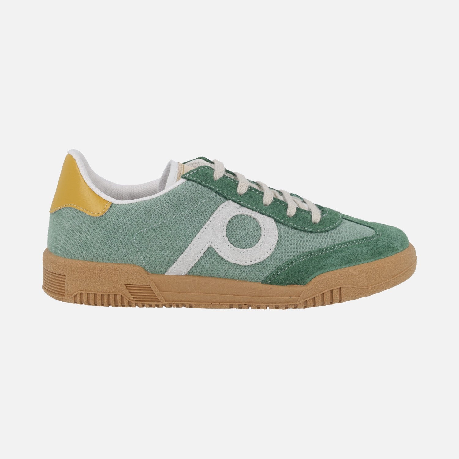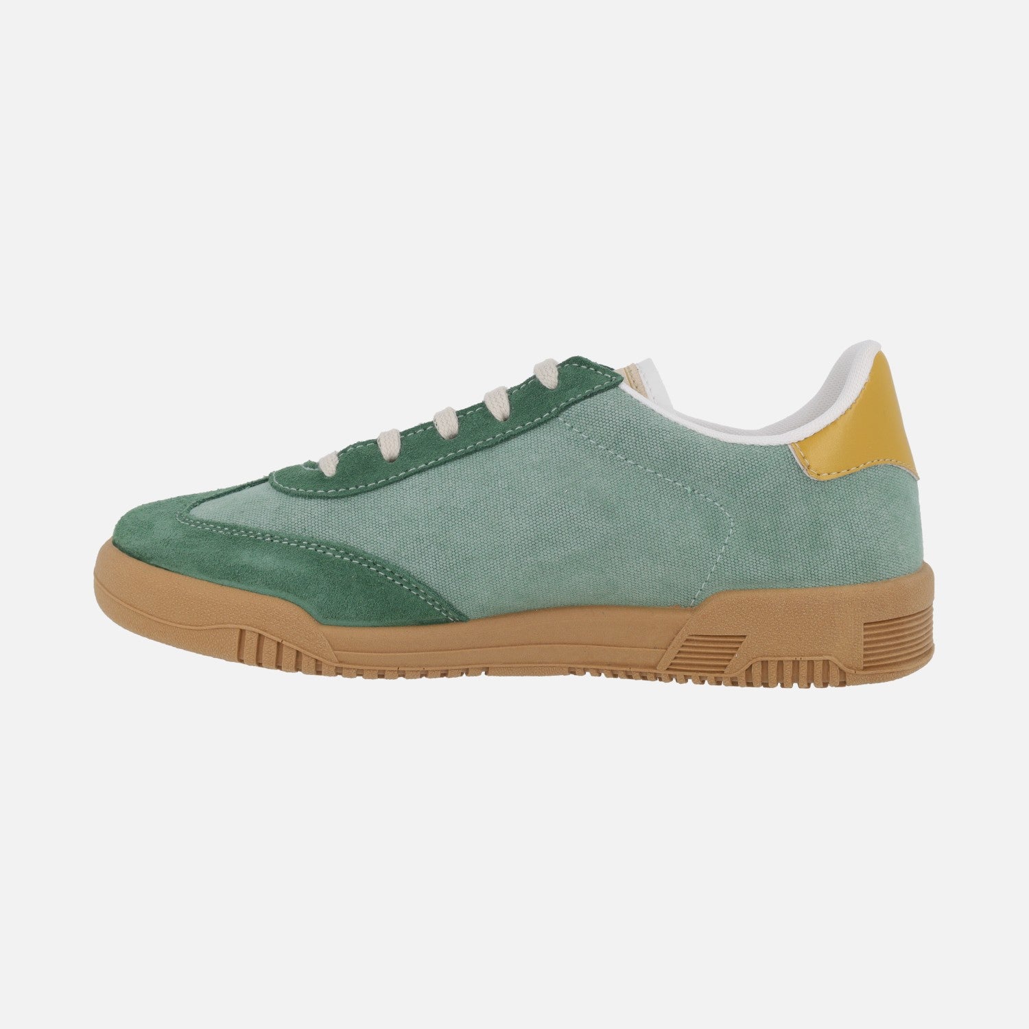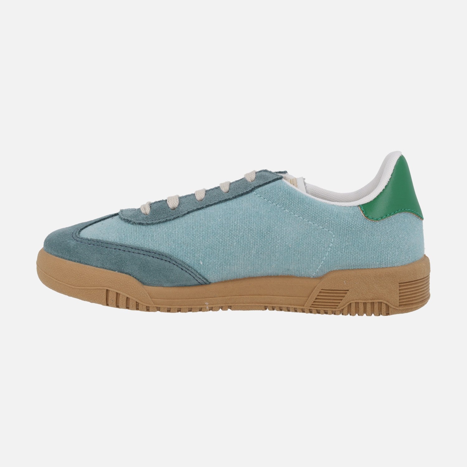 Zapatillas deportivas para mujer de la marca Roal modelo 35015, disponibles en combinado celeste, verde o blanco crudo. Zapatillas elaboradas en tejido, con cierre de cordones. Interior textil con plantillas extraíbles. Suela sintética, de aproximadamente 2,5 cm de altura.