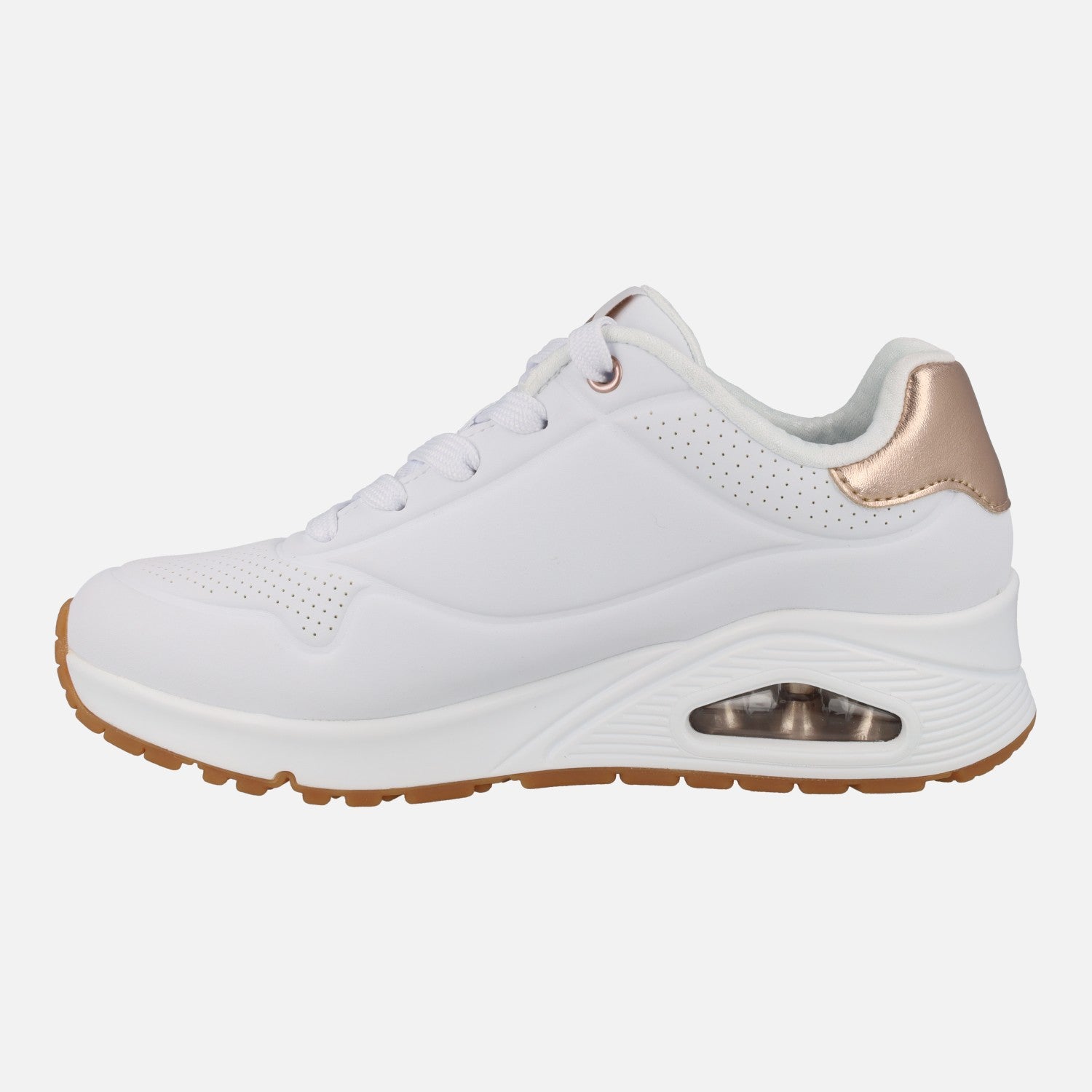 Zapatillas deportivas para mujer Uno Golden Air 177094, disponibles en TPE Taupe y en Blanco WHT. Deportivas con exterior sintético y cierre de cordones. Detalle metalizado en el talón. Interior textil. Plantillas Memory foam. Cámara de aire a la vista, con 4 cm de altura trasera (2 cm parte delantera).