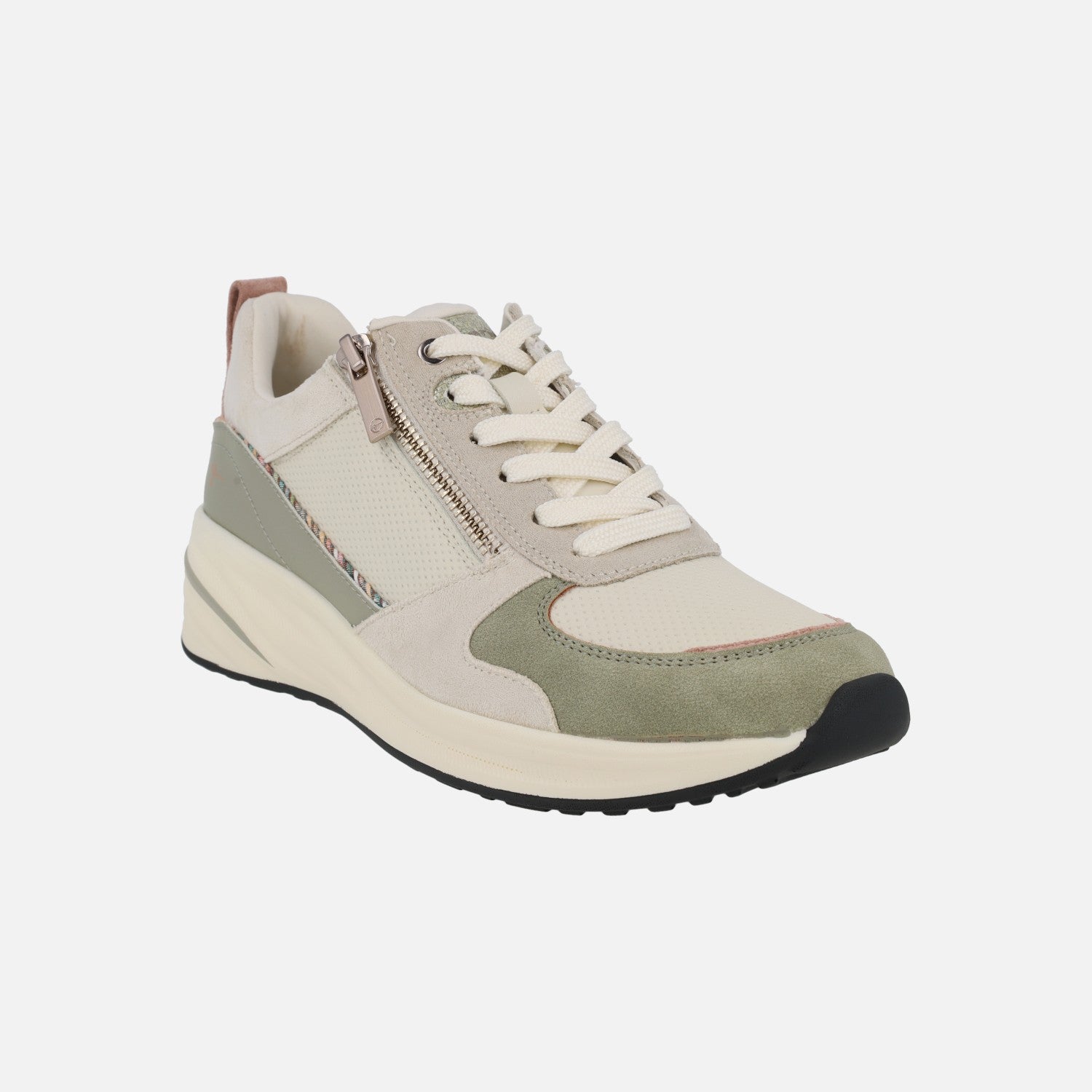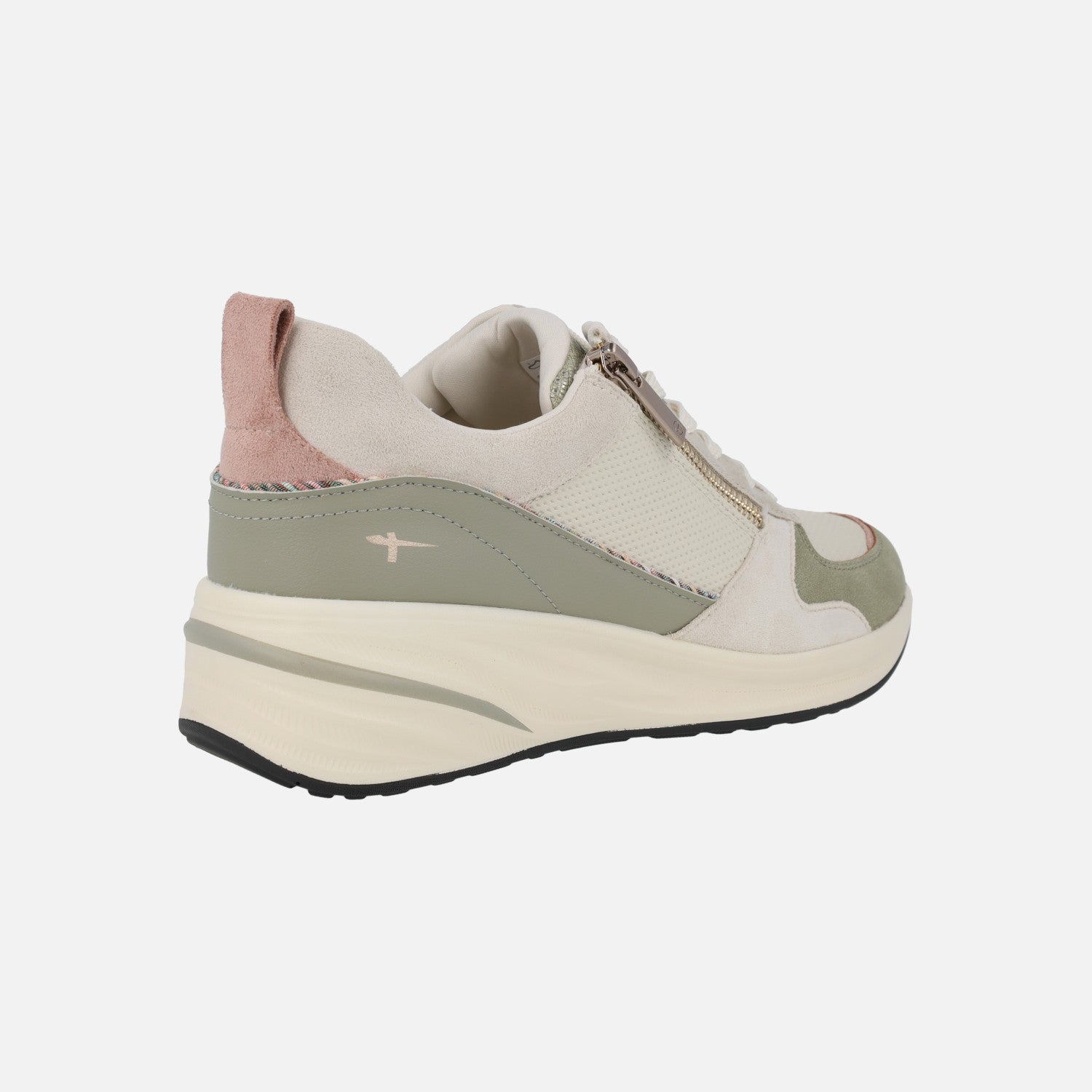 Zapatillas deportivas Tamaris Essentials modelo 1-23754-45 770 Sage. Deportivas con cuña baja, de aproximadamente 4 cm de altura trasera, con exterior elaborado en combinado de materiales sintéticos y textiles. Interior también en combinado de materiales textiles y sintéticos, con plantillas extraíbles. Piso sintético con cuña trasera, muy confortable. Cierre con cordones textiles y además cremallera en el lado exterior, para mayor facilidad en la puesta. Altura trasera 4 cm aproximadamente, con 2 cm de plataforma delantera. Combina verde con detalles en rosa y distintos tonos de beige.