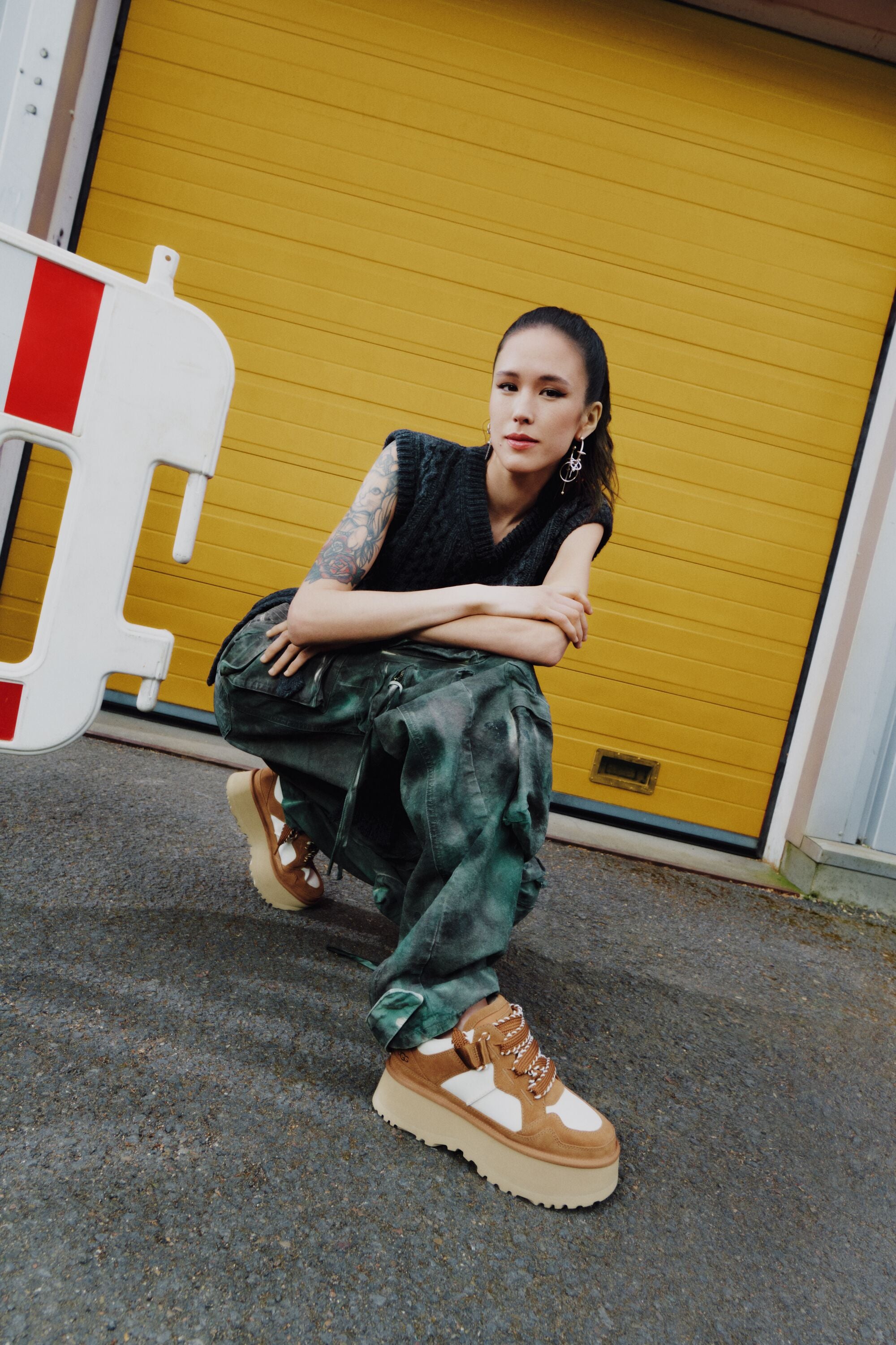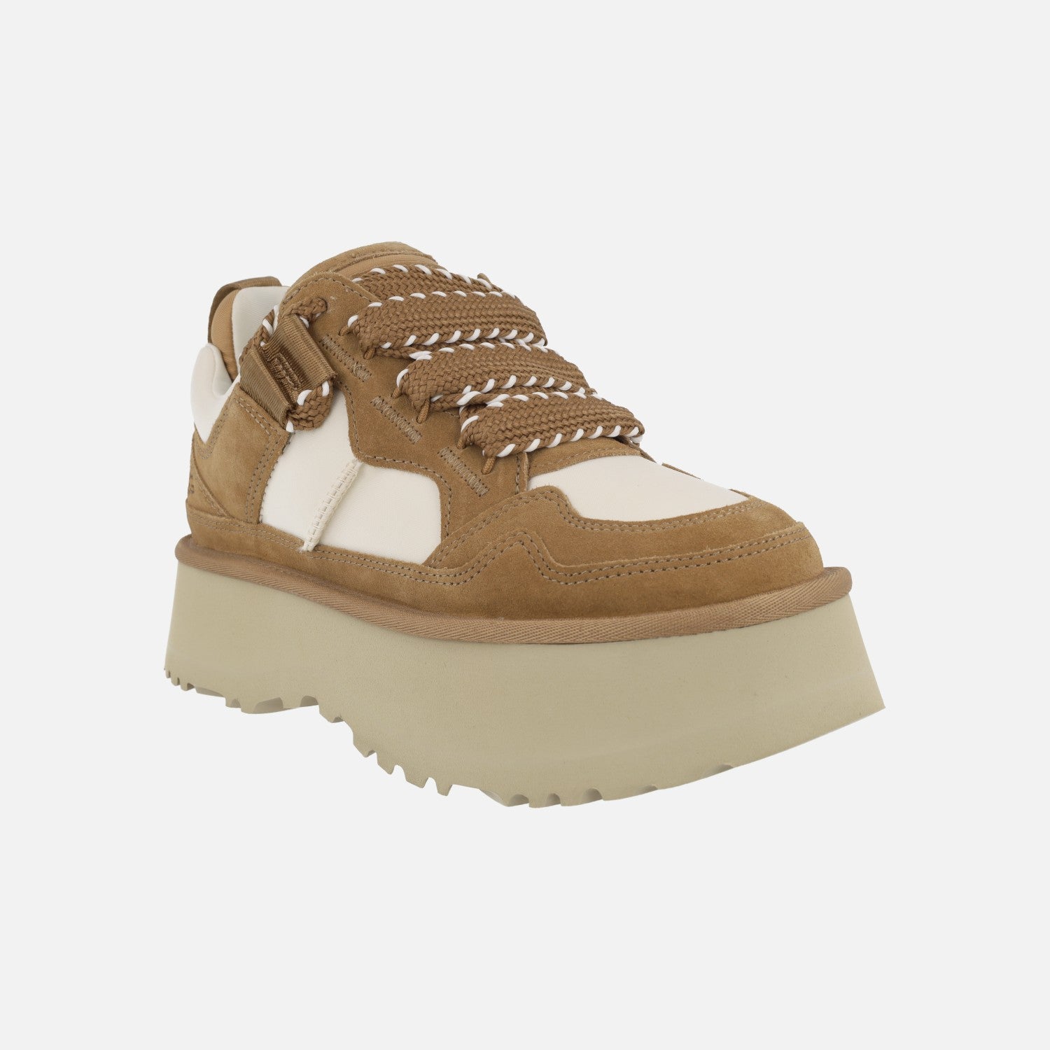 Zapatillas deportivas para mujer UGG ASTROMEL 1171541 Chesnut. Zapatillas deportivas elaboradas en piel ante y tejido (ante, nylon y tejido poliéster reciclado), en combinado beige y cuero.  Lengüeta acolchada. Interior textil, planta acolchada. Cordones textiles anchos (trae recambio). Plataforma de goma EVA de 5 cm de altura.