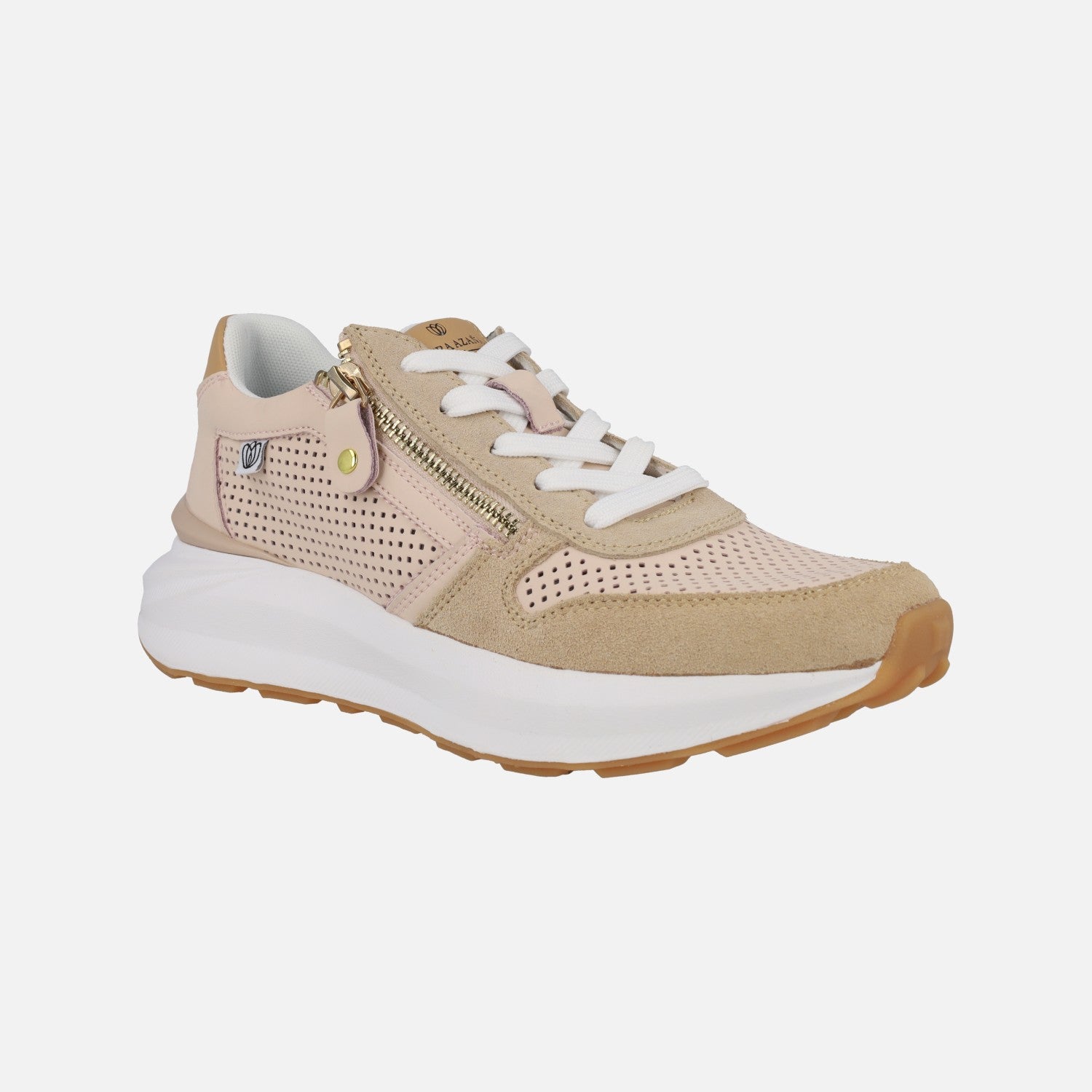 Zapatos deportivos para mujer de la marca Laura Azaña modelo LA27701BI, disponibles en blanco y en salmón. Sneakers de piel, con detalles de picados. Cierre de cordones además de cremallera lateral para mayor comodidad. Interior textil, con plantillas extraíbles. Piso de goma de 4 cms de altura trasera (2,5 cms parte delantera).
