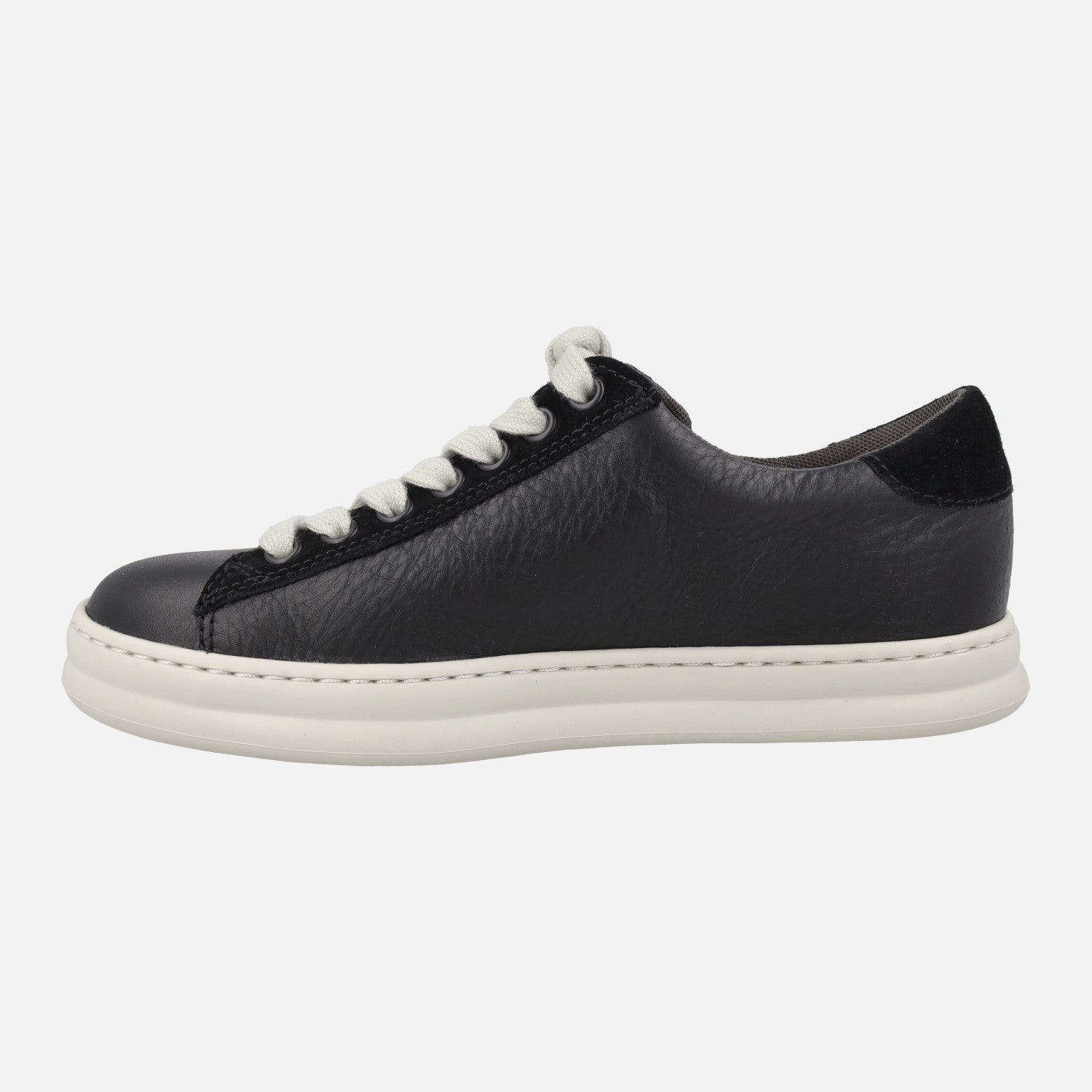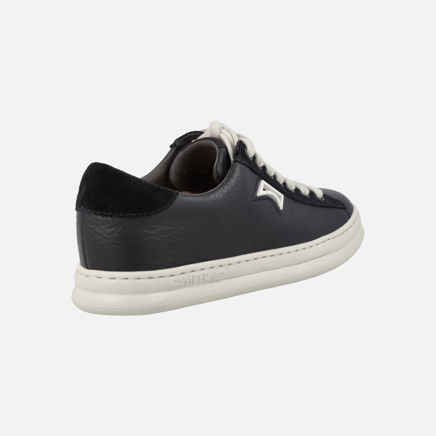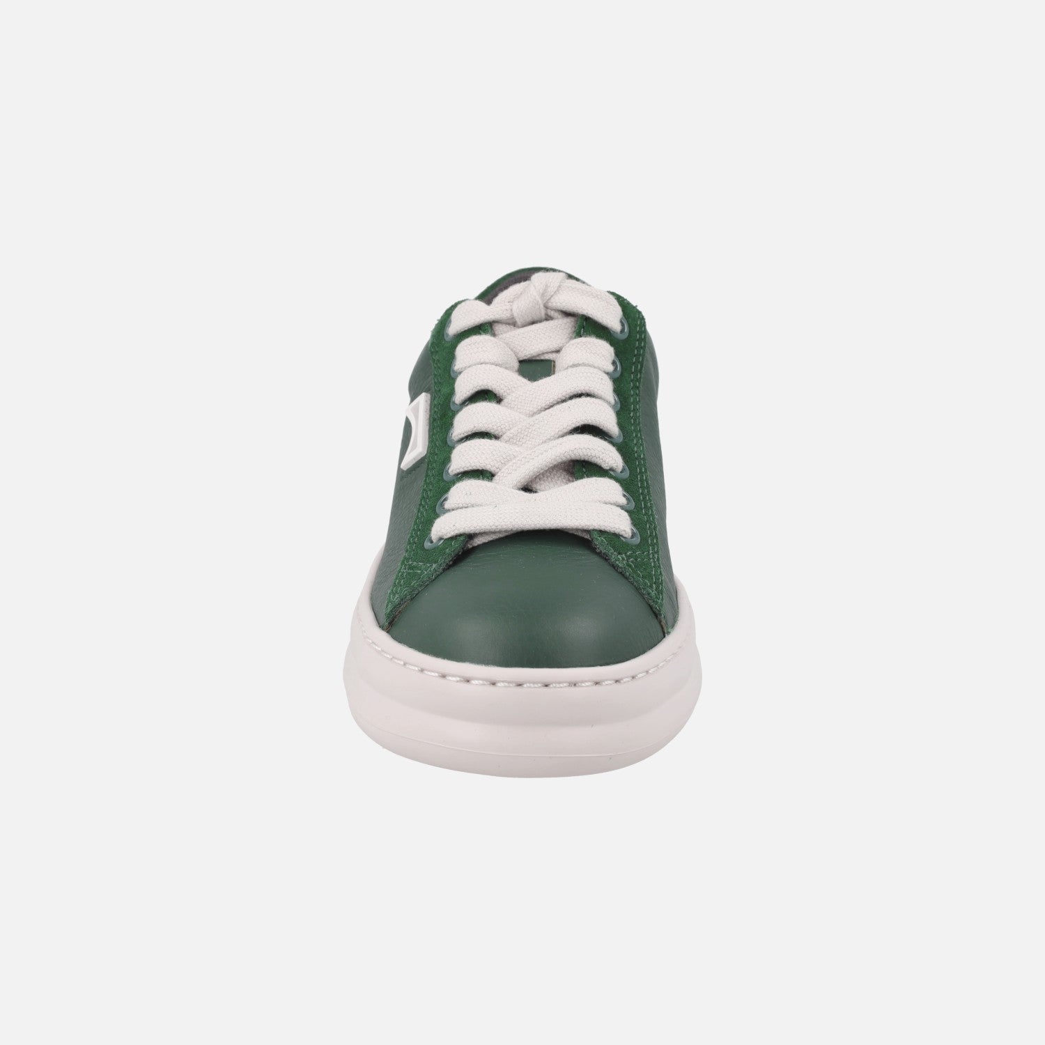 Zapatillas deportivas Camper Runner k201855, disponibles en verde (arume), blanco y en negro. Zapatillas deportivas estilo retro, elaboradas en piel y serraje. Cordones textiles. Interior textil con plantillas extraíbles. Piso de goma EVA Extralight. Las plantillas llevan una pequeña cuña de 3 cm, que junto al piso dan un total de 4,5 cm de altura.