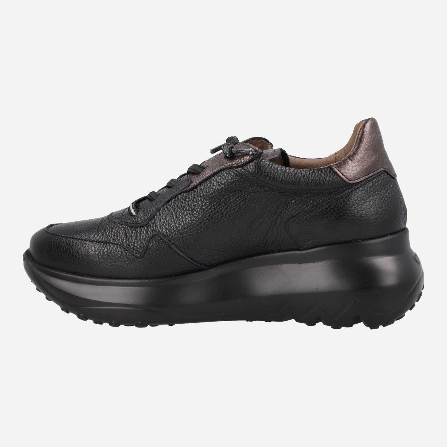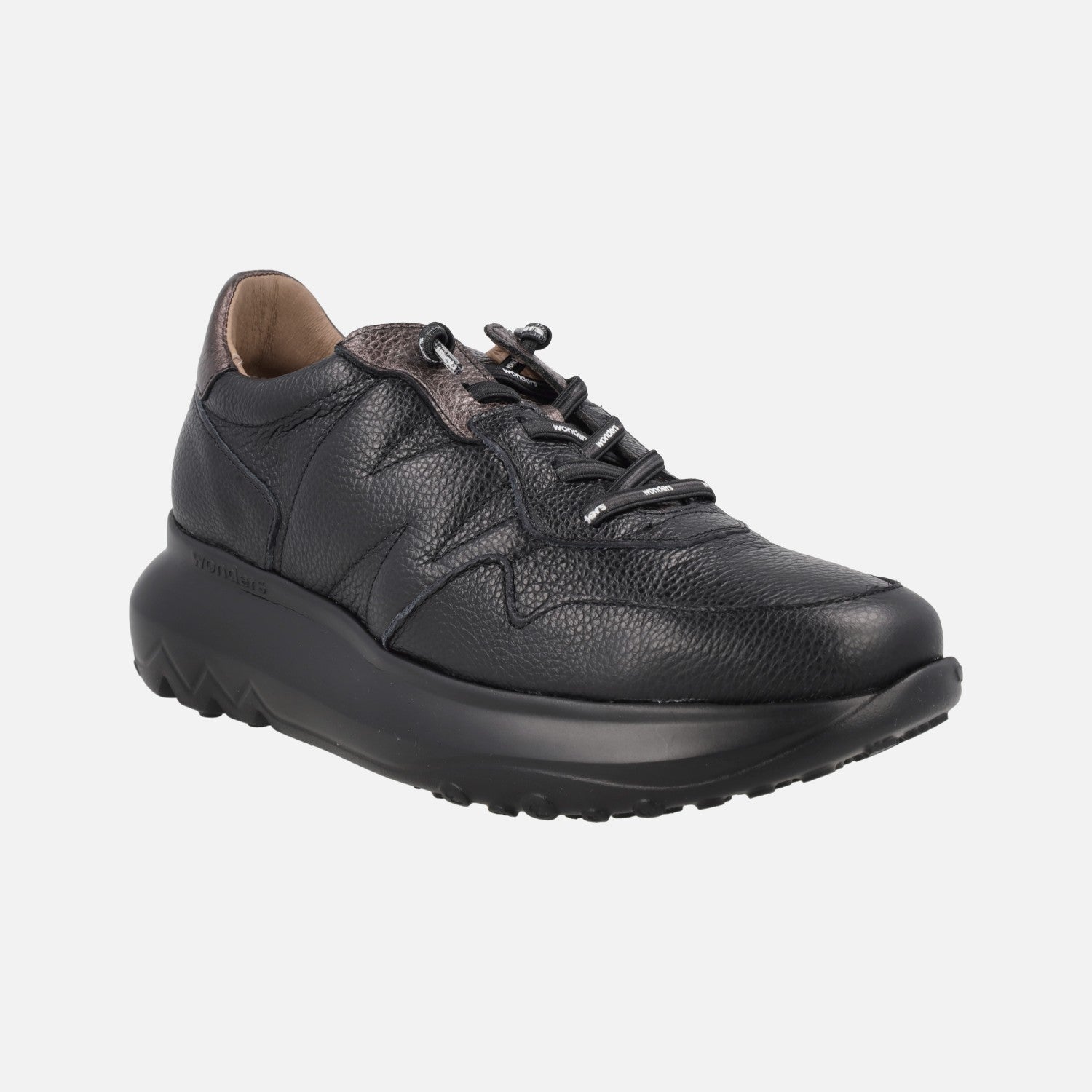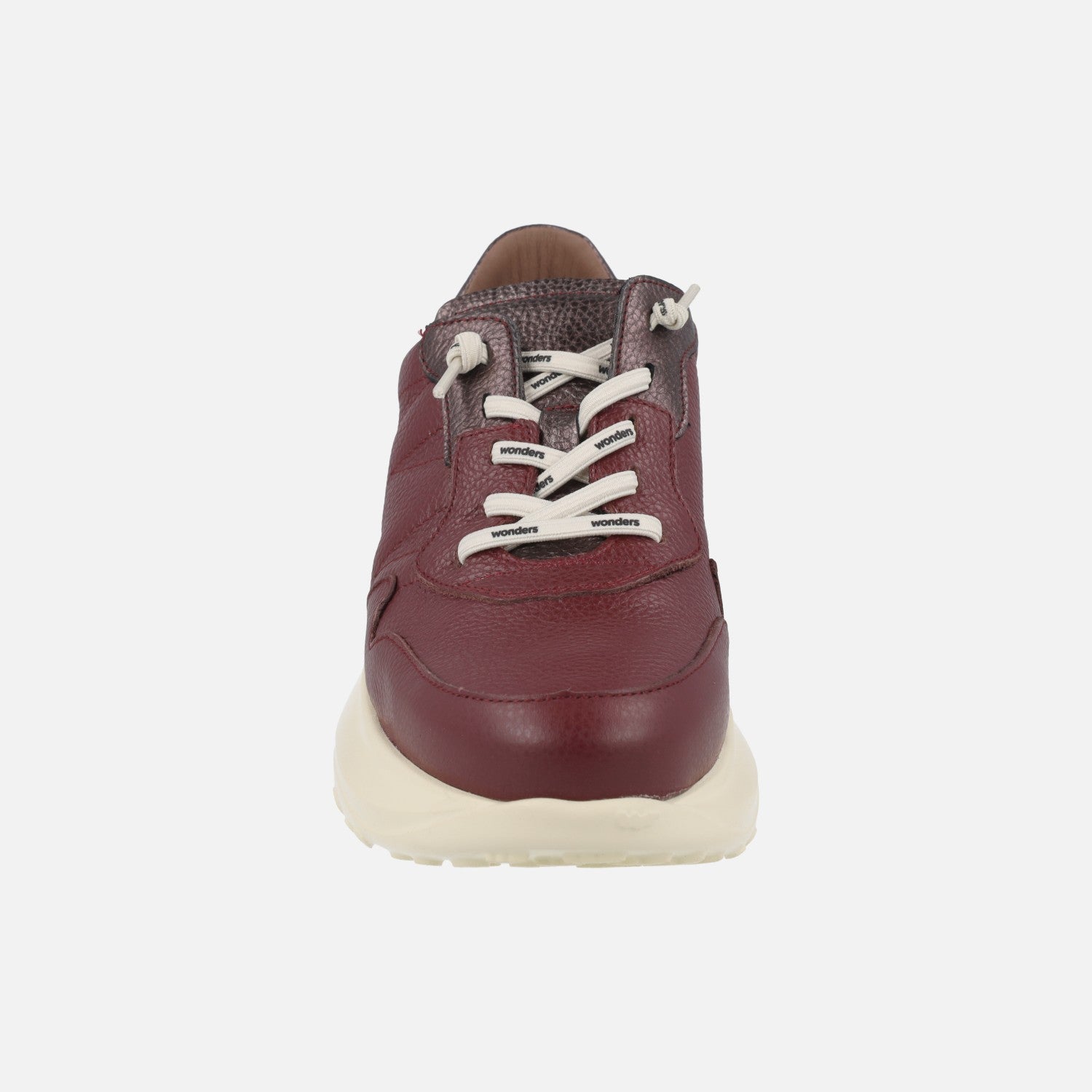 Zapatillas deportivas de piel Wonders ULTRAFLY 10 A-4010 disponibles en color negro y en color vino (burdeos). Logo "W" de Wonders en relieve en el lateral exterior. Cordones elásticos. Interiores en combinado de piel y microfibra, plantillas extraíbles MemoryGEL. Piso de EVA Extralight con 5 cm de altura trasera (3 cm parte delantera).