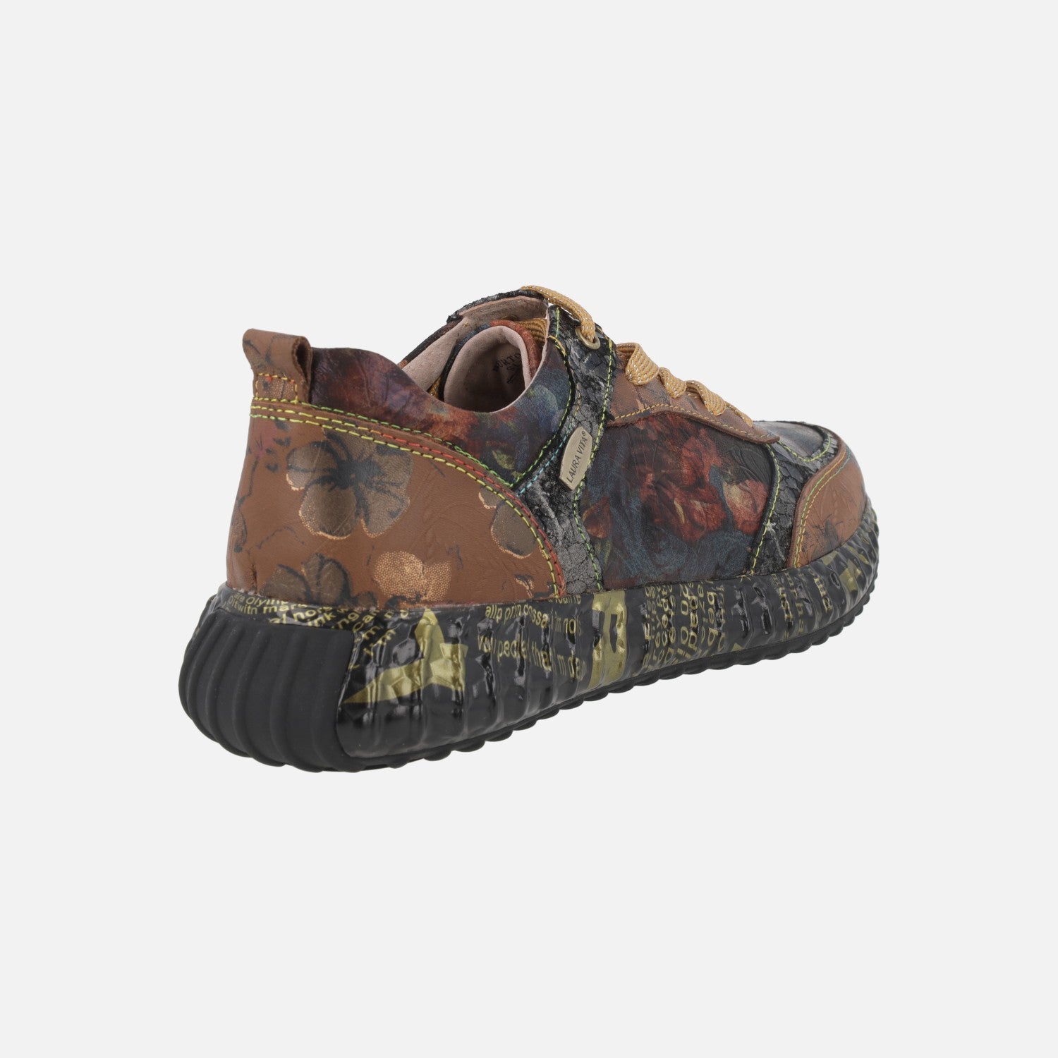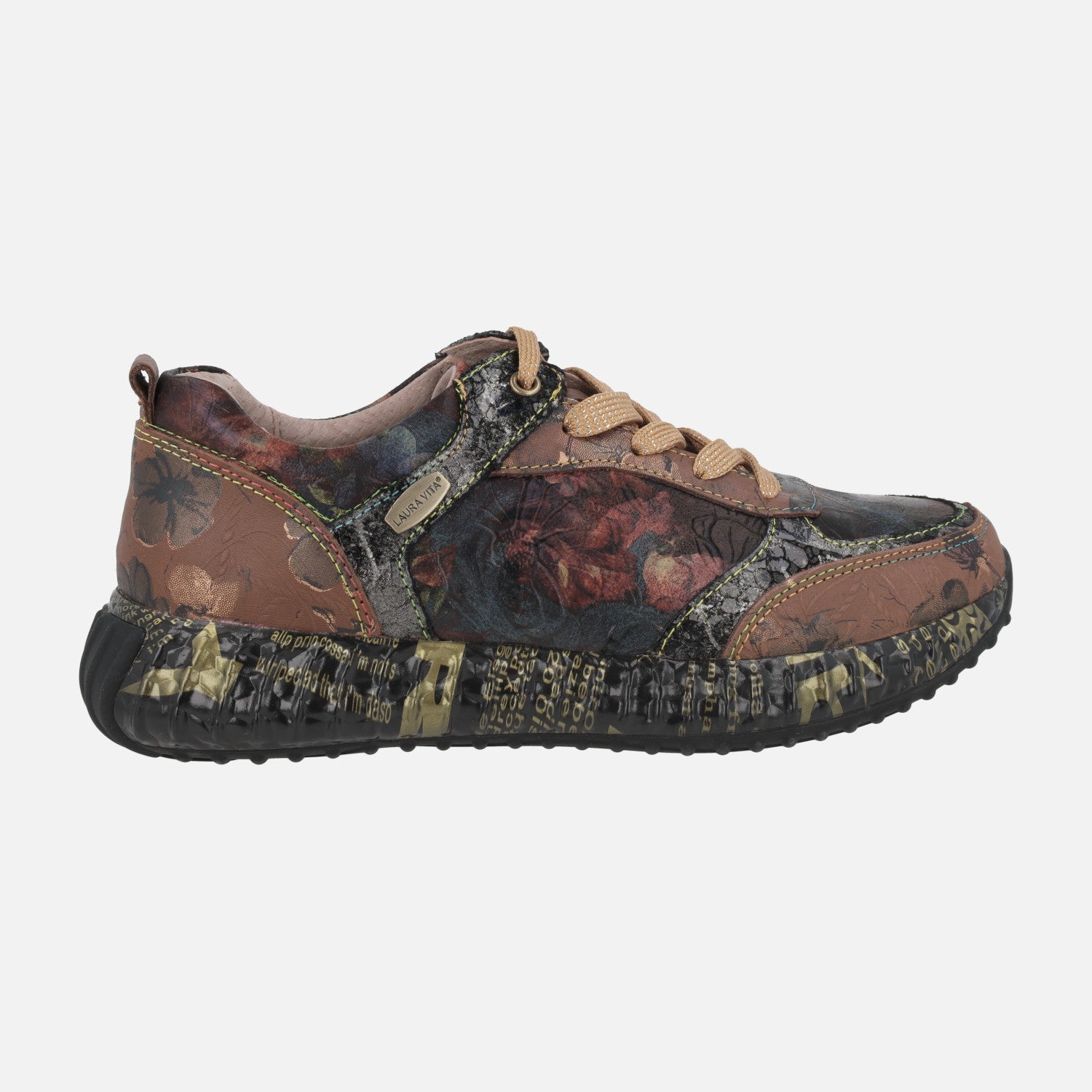 Preciosas zapatillas deportivas de la marca Laura Vita modelo Burton 36 Marron. Deportivas de piel combinada con tejido, cierre de cordones. Estampado de flores. Interiores forrados de piel. Piso sintético con 4 cm de altura trasera (2,5 cm parte delantera).