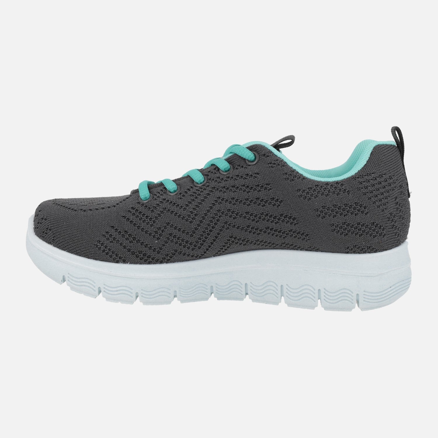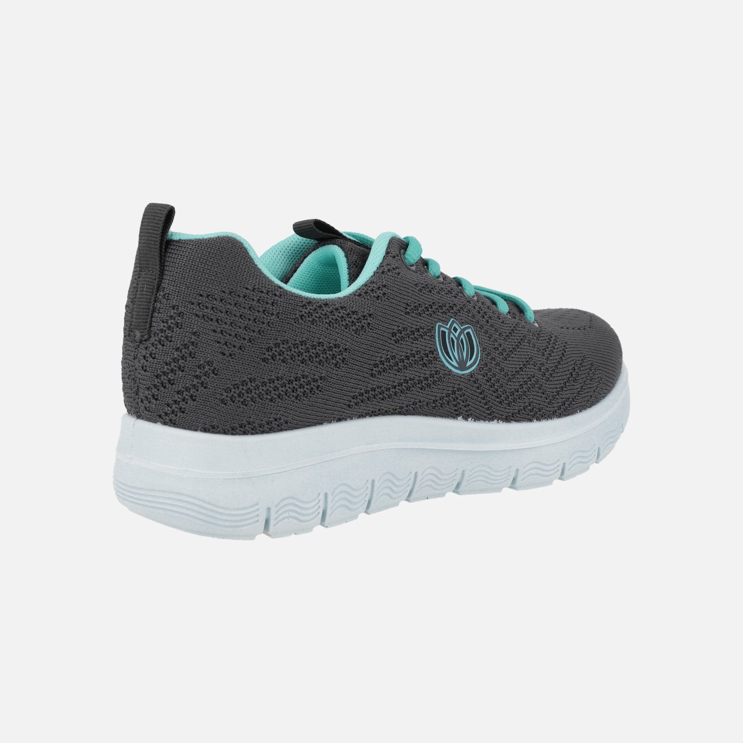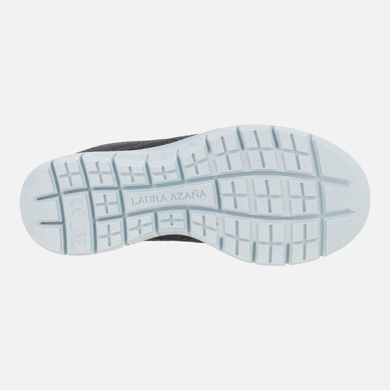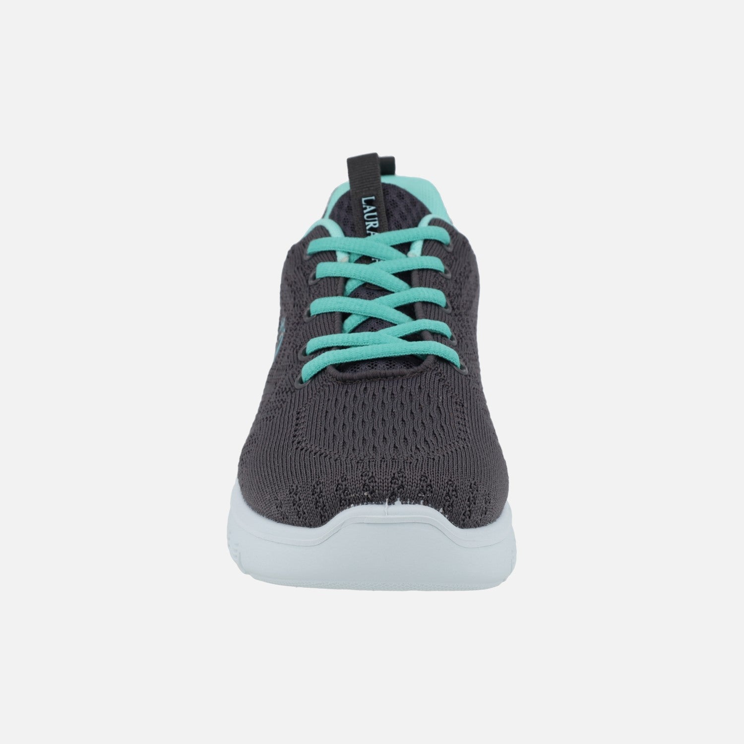 Zapatillas deportivas para mujer de la marca Laura Azaña, modelo LA24503TE Linux gris. Zapatillas elaboradas en tejido gris oscuro, con cordones y forro contrastado en turquesa. Interior textil con plantillas extraíbles. Piso sintético con 3,5 cm de altura trasera (2,5 cm parte delantera). Made in Spain.
