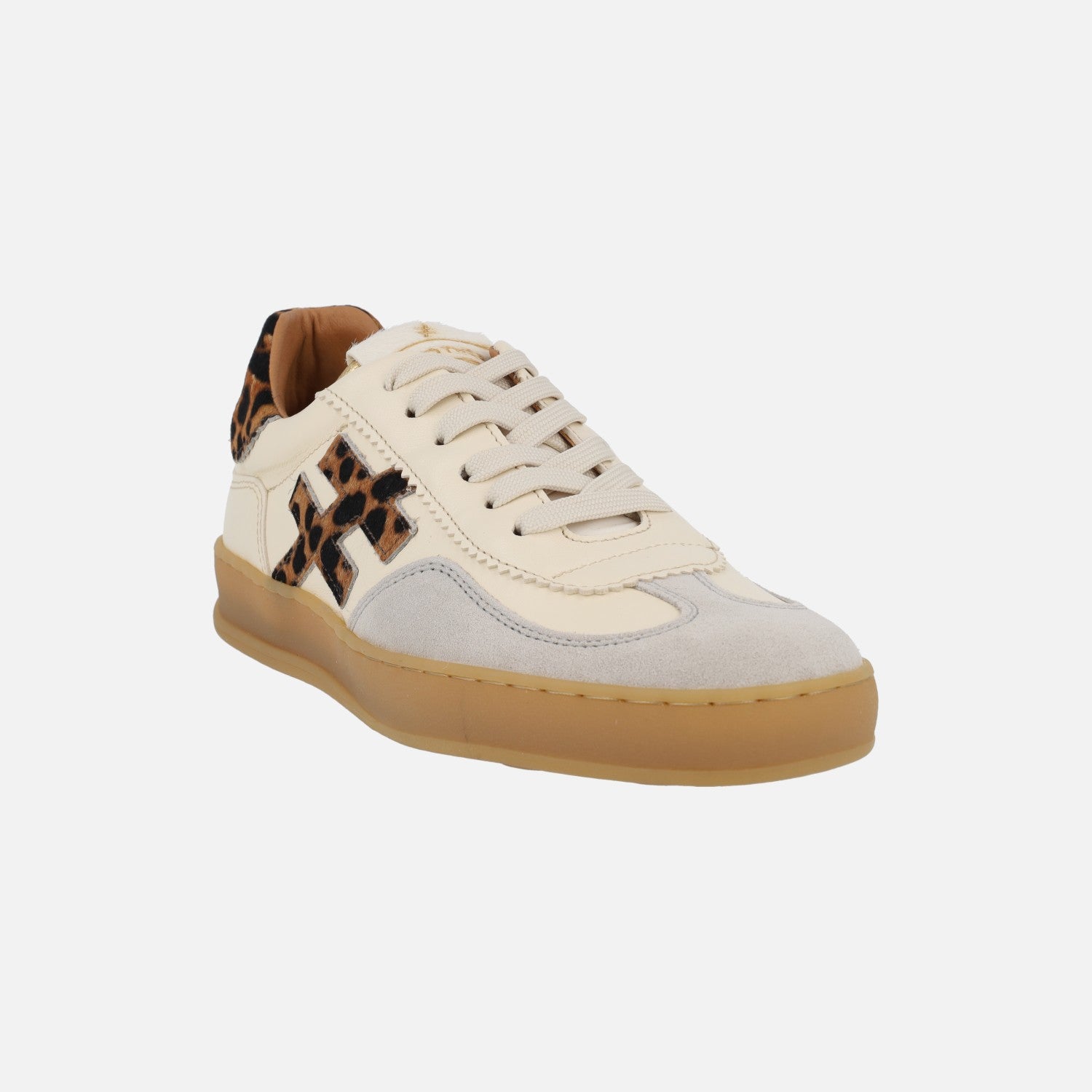 Zapatillas deportivas de la marca Another Trend modelo A032 Iconic 2 Off white. Zapatillas elaboradas en piel beige combinada con serraje gris y detalles en animal print leopardo. Cierre de cordones. Interior textil con plantillas extraíbles. Piso sintético de aproximadamente 3 cm de altura trasera (2 cm parte delantera).