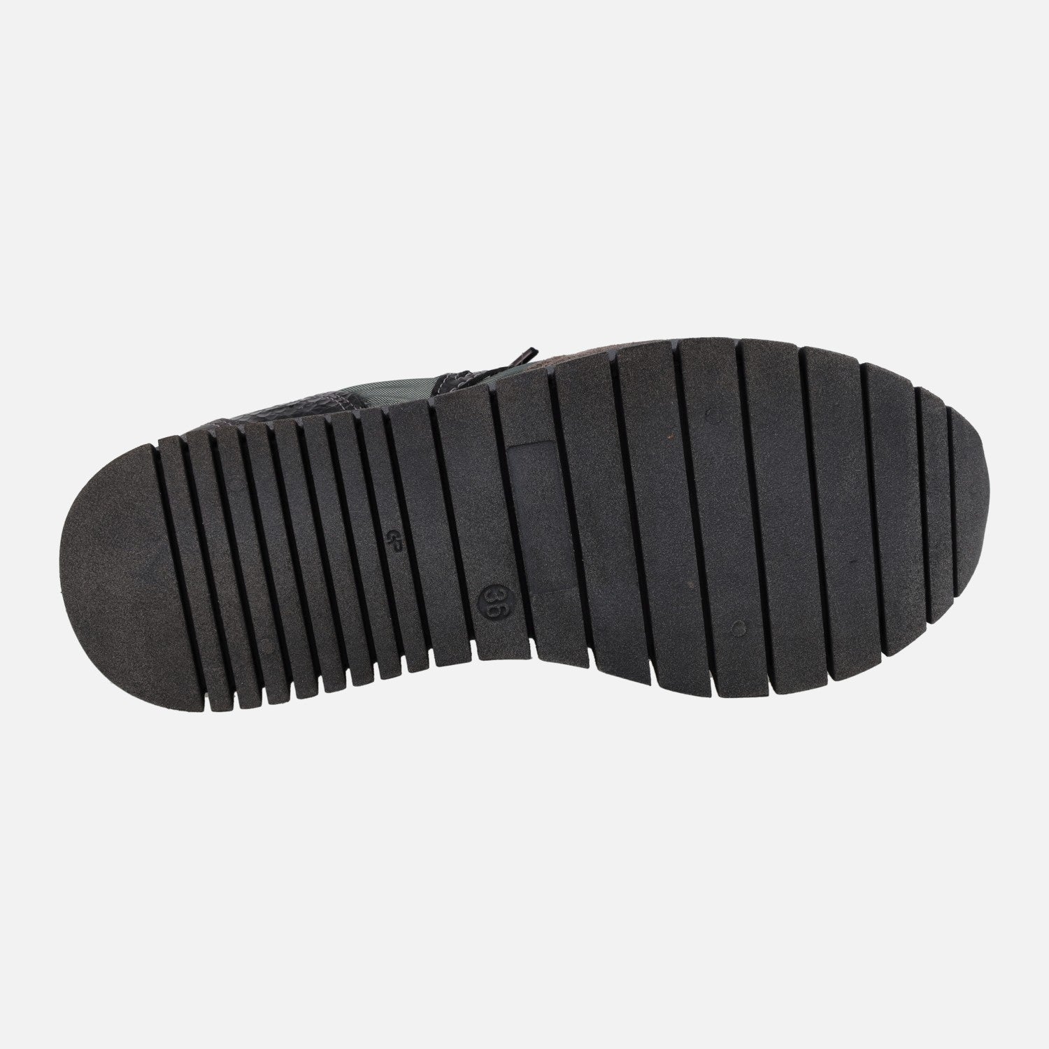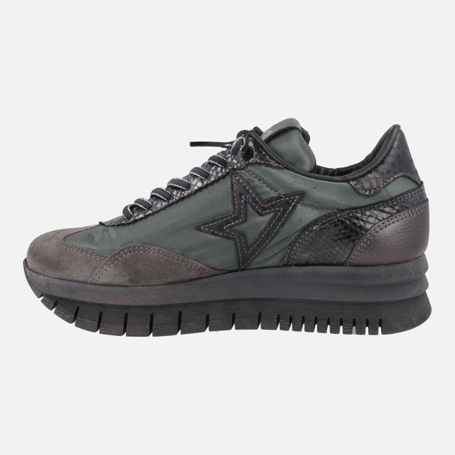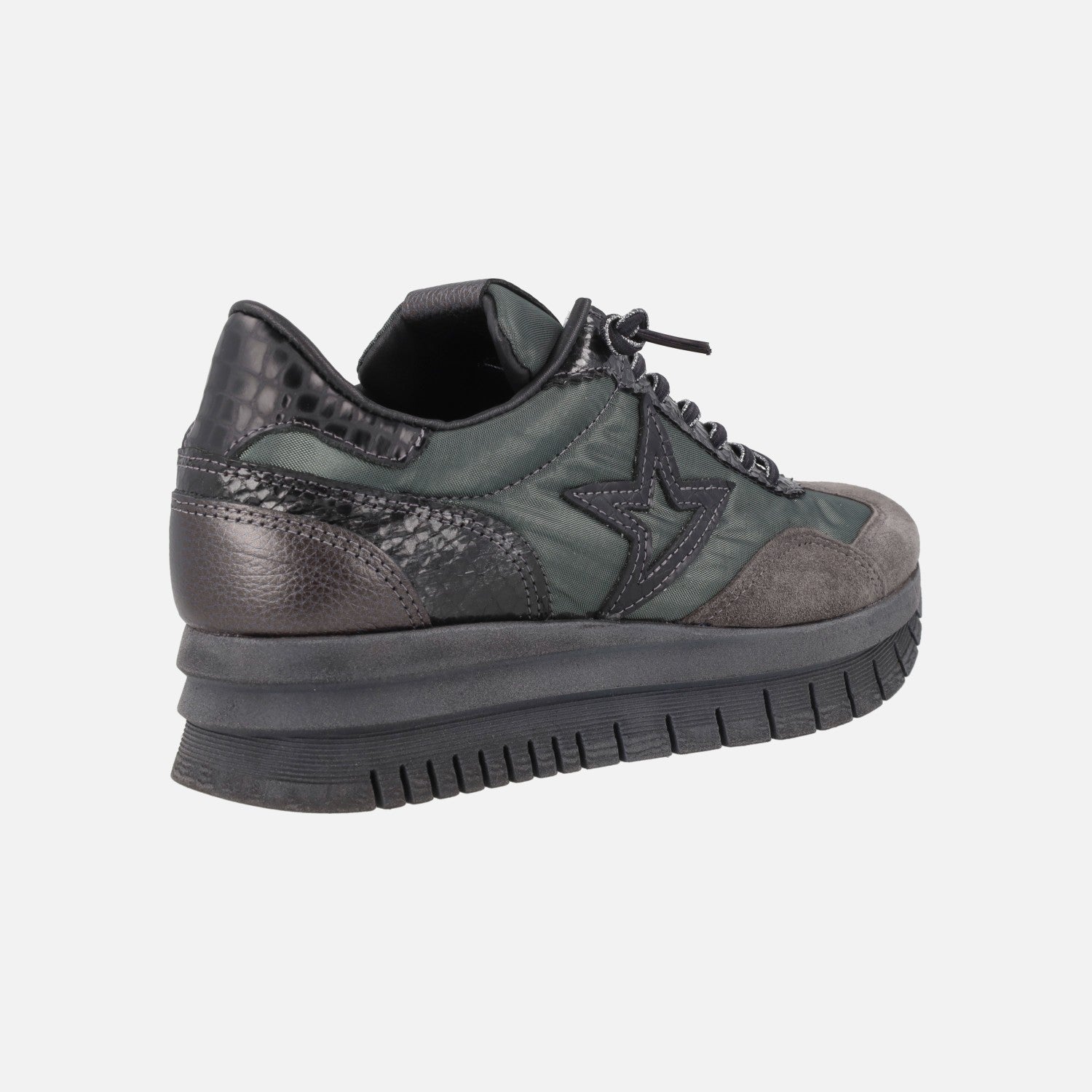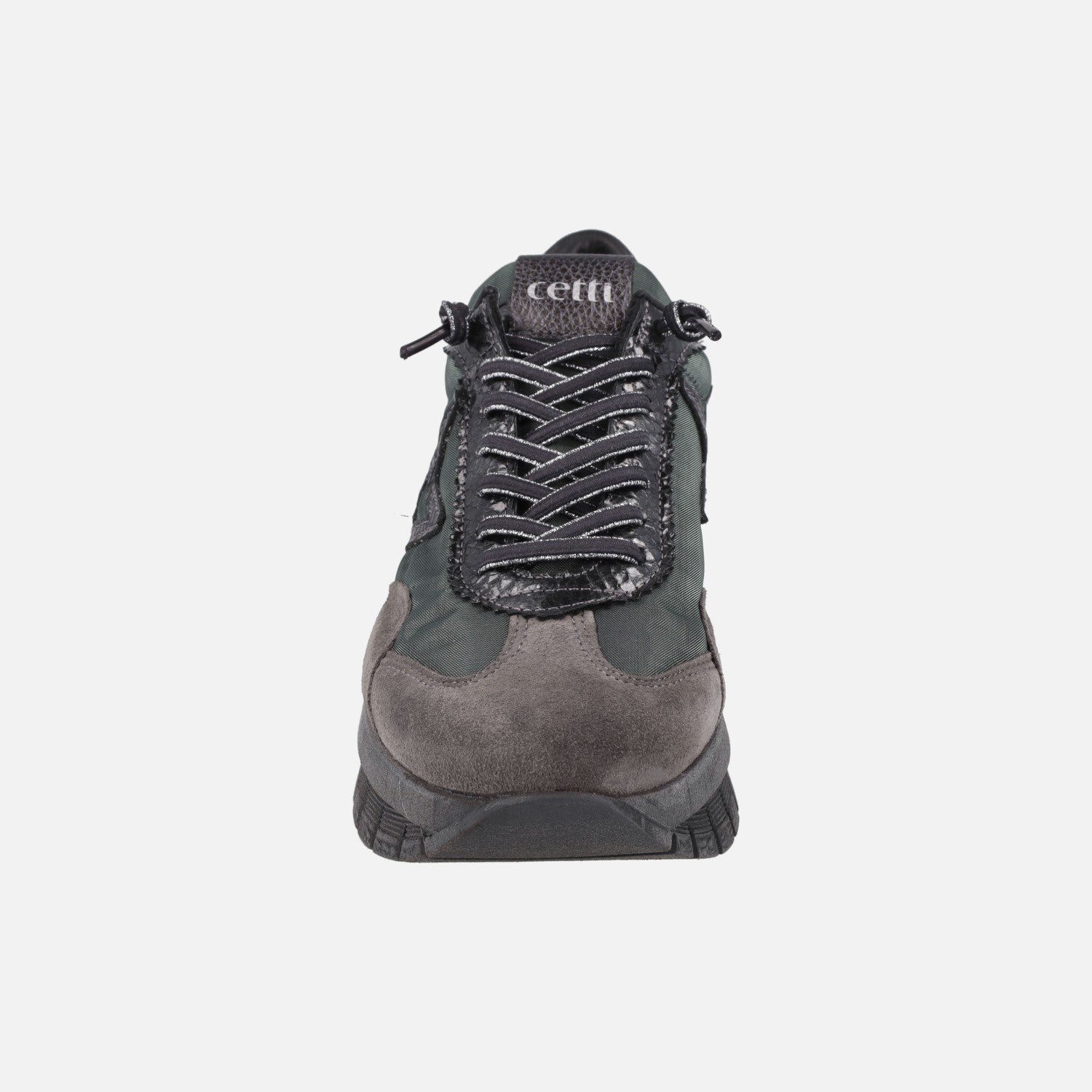 Preciosas zapatillas deportivas de la marca Cetti modelo 1259 XL Ante metal piombo. Sneakers elaboradas en combinado de ante, tejido y distintas texturas, en combinado gris y verde. Cordones elásticos. Interior mixto en tejido y sintéticos, con plantillas extraíbles. Piso grueso de goma, de 4 cm de altura en la parte de atrás y 3 cm en la delantera.