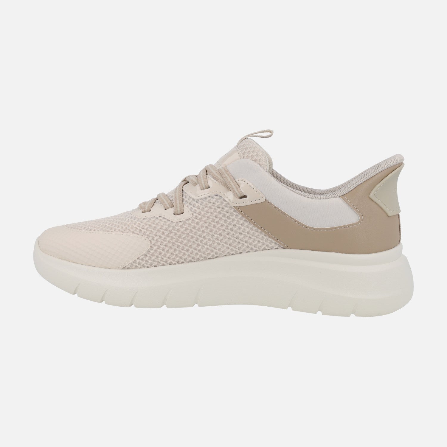 Zapatillas deportivas para mujer de la marca Geox modelo Plummery Plus D670JB Papyrus/cream. Deportivas con exterior en tejido y sintéticos, en color beige. Cierre de cordones elásticos y sistema de calce fácil en el talón, para poder calzarlos sin necesidad de agacharse. Interior mixto en tejido y sintéticos, plantillas extraíbles. Suela sintética con 3 cm de altura trasera (2,5 cm parte delantera).