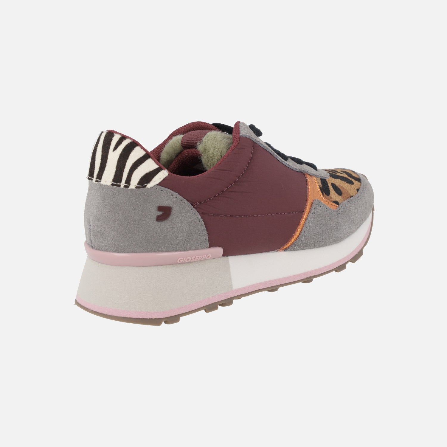 Elegantes zapatillas deportivas modelo Posen 76416-P Burdeos de la marca Gioseppo. Sneakers elaboradas en piel, serraje, pelo y tejido, con cierre de cordones. Interior textil con plantillas extraíbles. Detalles de animal print cebra y leopardo, lengüeta forrada de pelo. Piso sintético, de 4 cm de altura trasera (2 cm parte delantera).