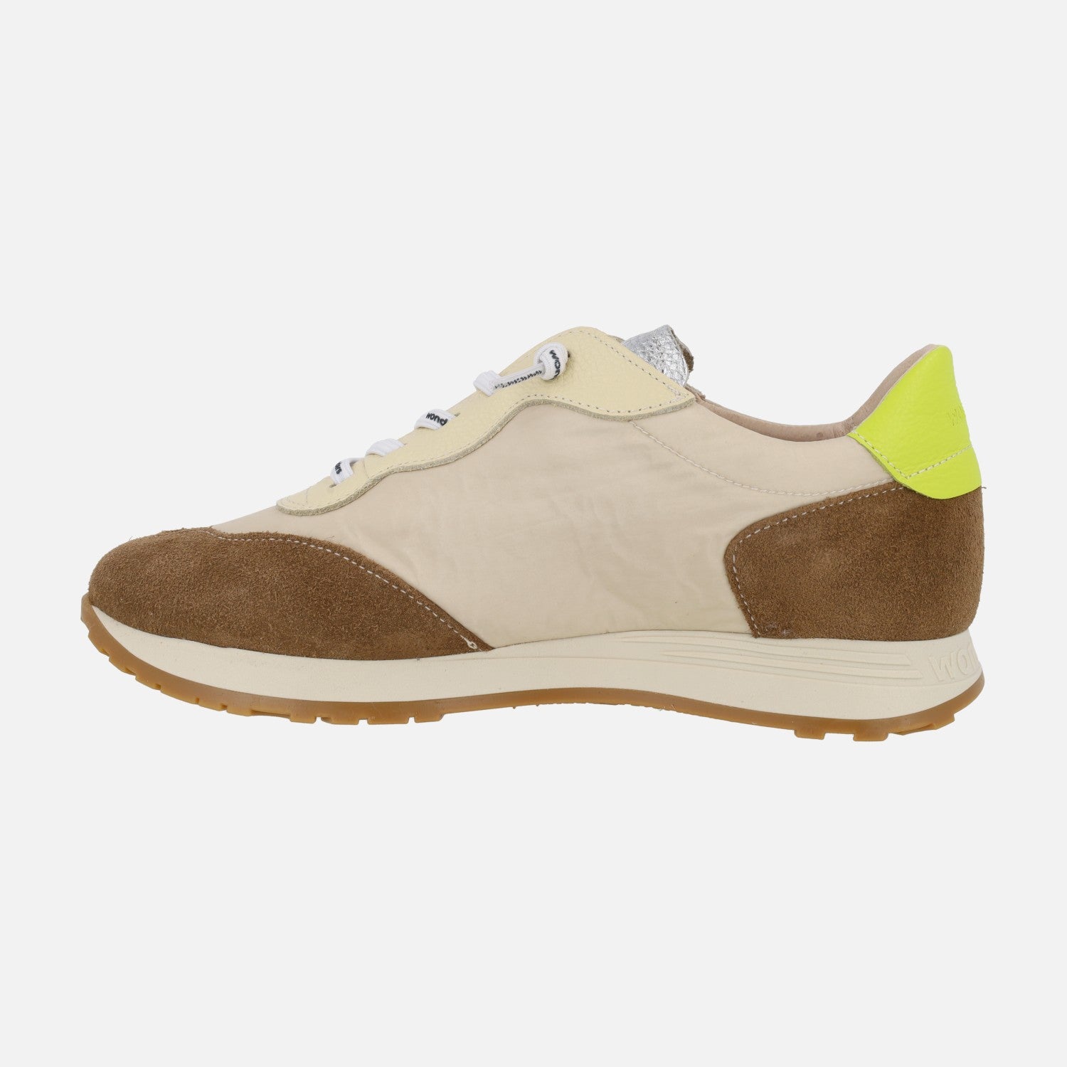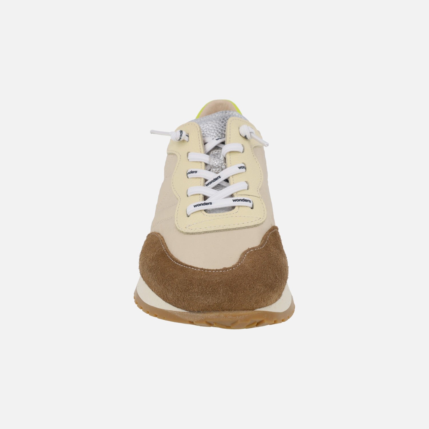 Zapatillas deportivas para mujer de la marca Wonders modelo A-4802 Coñac/taupe. Deportivas elaboradas en piel y tejido nylon, en beige y marrón con talonera contrastada en amarillo. Cordones elásticos. Trae cordones normales de repuesto. Interior en combinado de piel y tejido con plantillas extraíbles. Suela sintética con 2,5 cm de altura trasera (1,5 cm parte delantera).