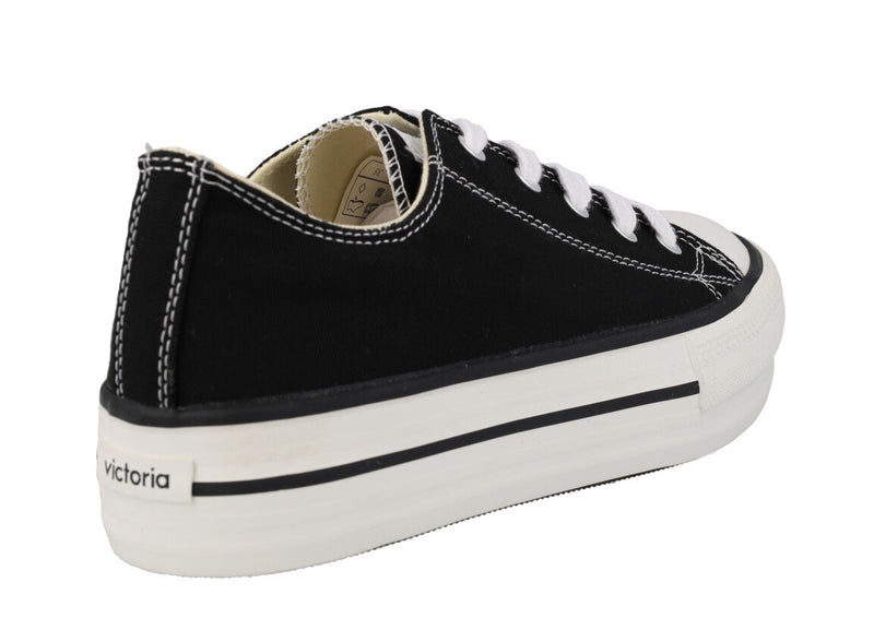 Deportivas de lona con doble piso de la marca española Victoria, modelo 1061100 Tribu Doble Lona. Zapatillas deportivas elaboradas en tejido algodón, con cierre de cordones. Disponibles negras y blancas. Interior textil, también de algodón. Puntera engomada. Piso doble de goma, con plataforma de 4 cms de altura.