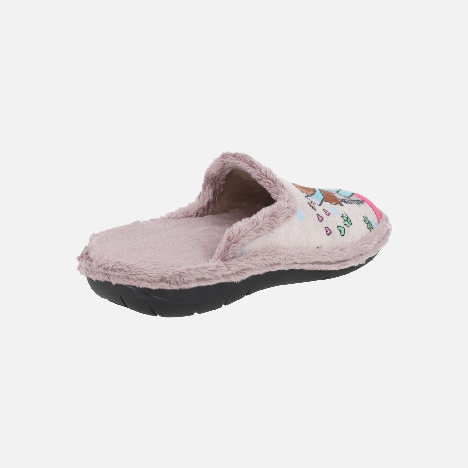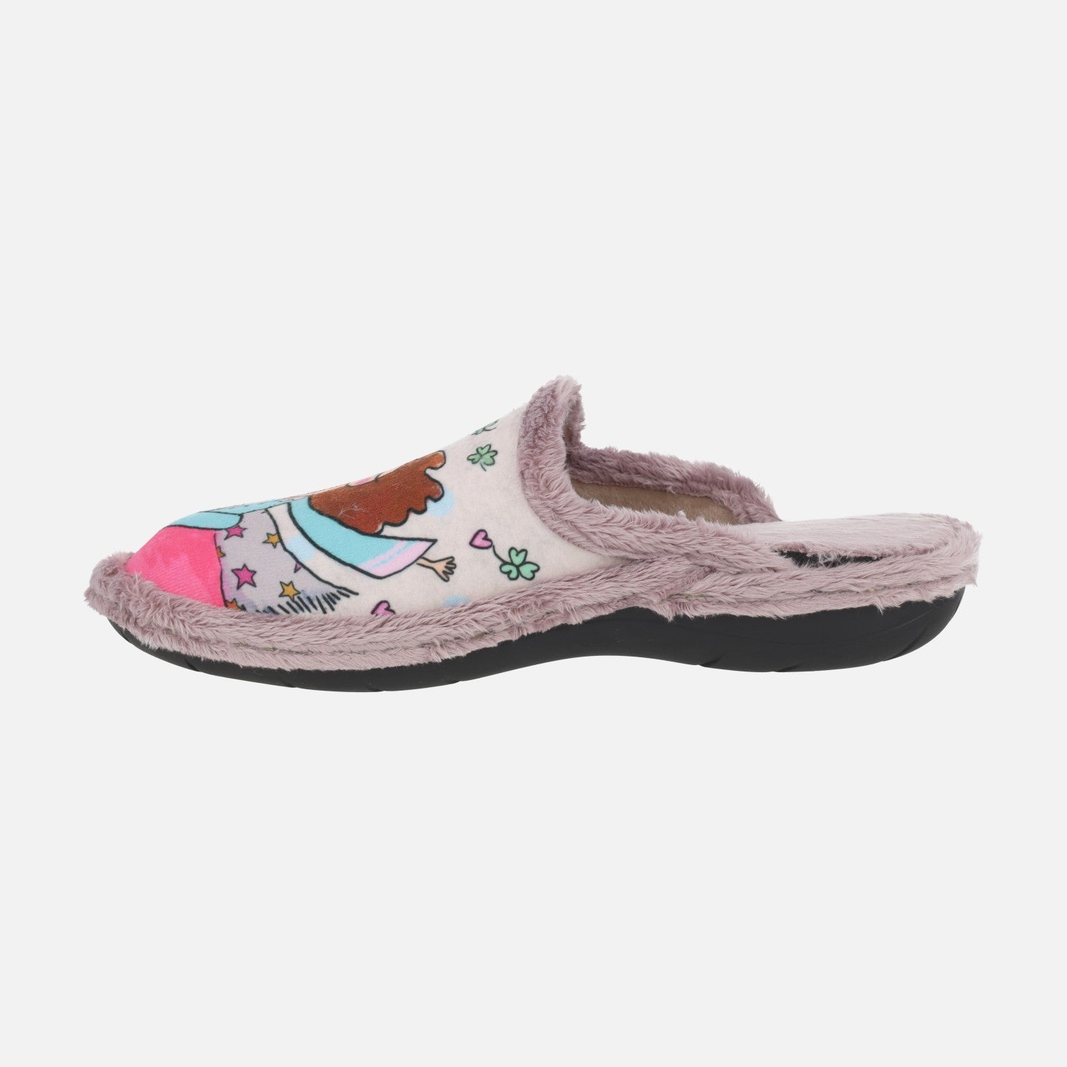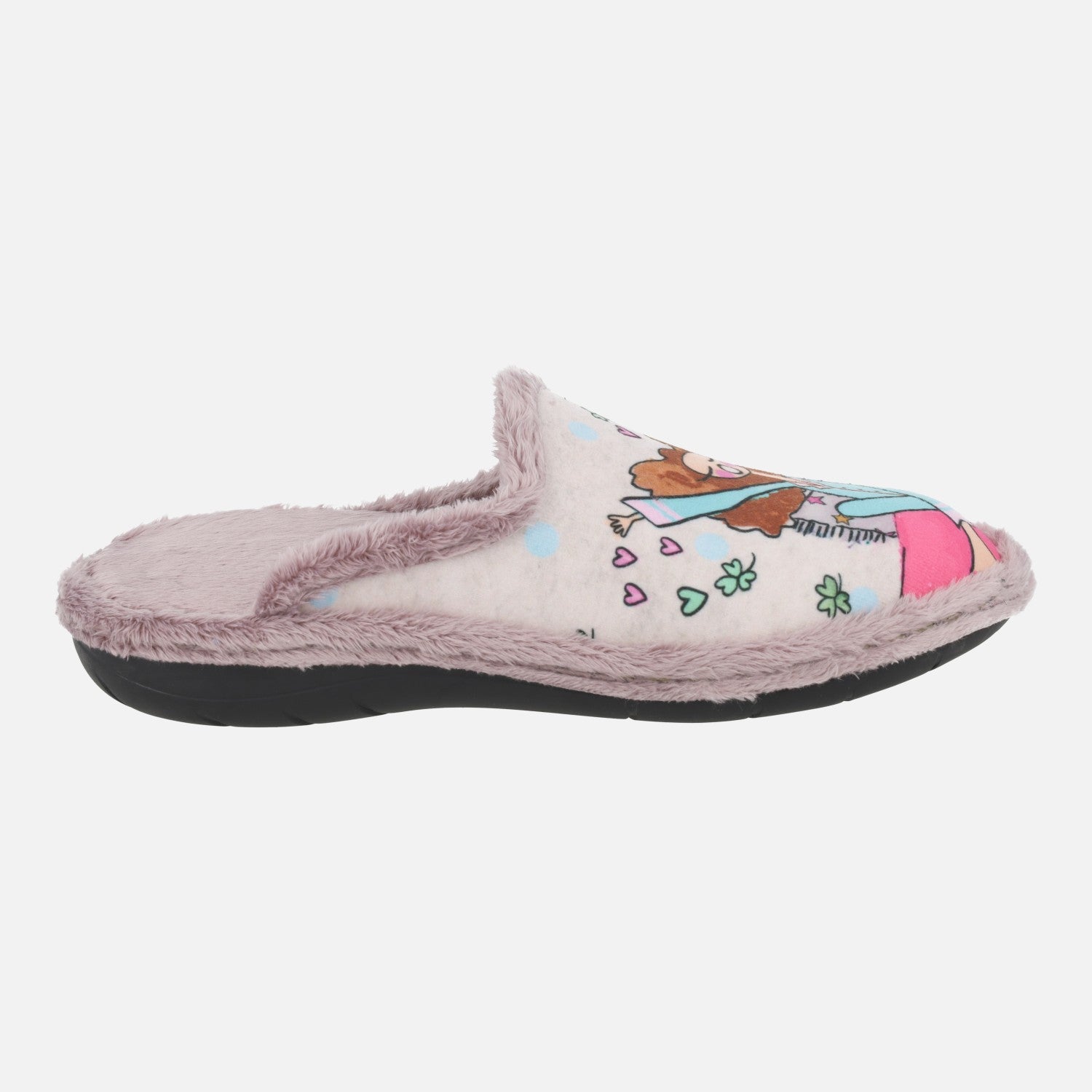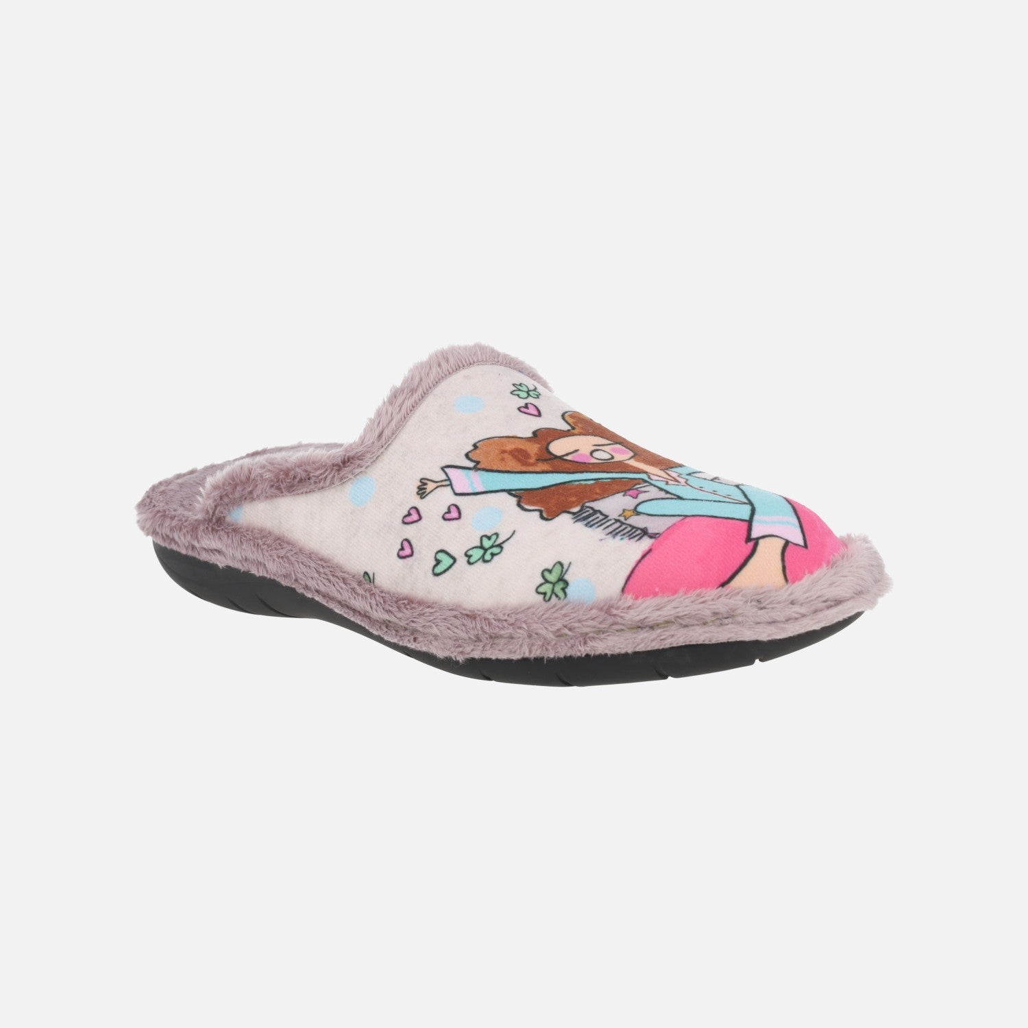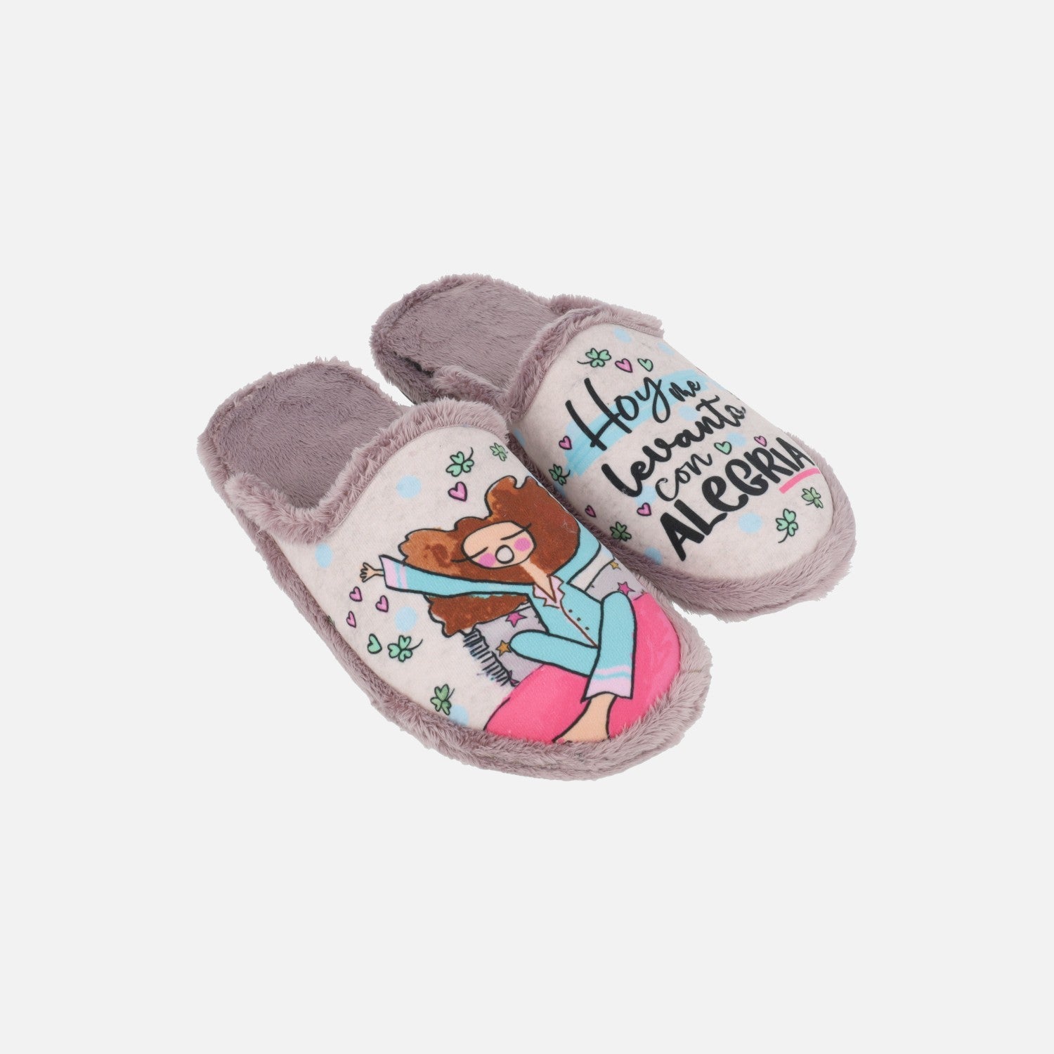 Zapatillas de casa abiertas de talón para mujer de la marca Suaveflex, modelo 200 Bison. Zapatillas de casa elaboradas en tejido pelo en tonos rosados y malvas, con diseño de chica despertando y la frase "HOY ME LEVANTO CON ALEGRÍA". Interior textil suave con plantillas extraíbles. Piso sintético con 3 cm de altura trasera (2 cm parte delantera). Made in SPain.