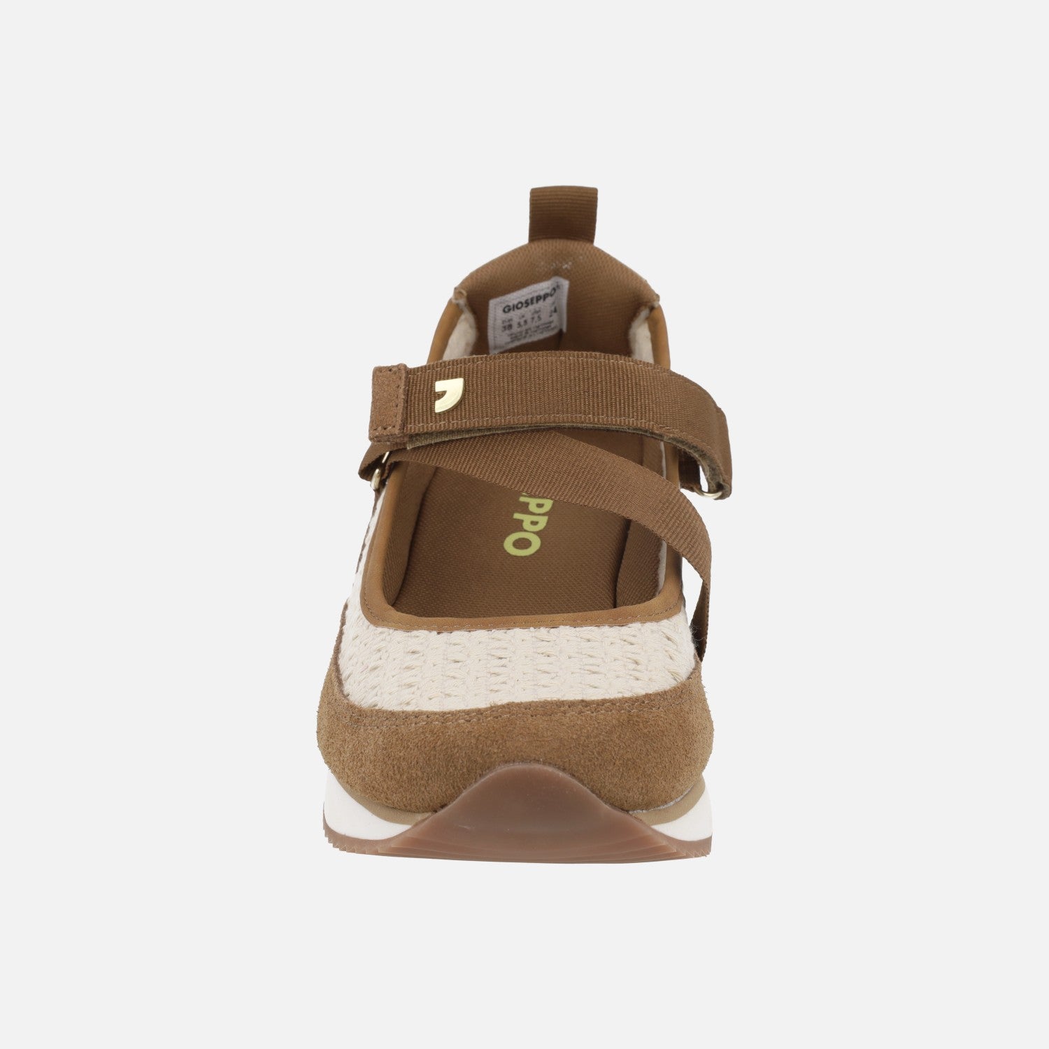 Zapatillas estilo mercedes de la marca Gioseppo modelo LIPA 78728 Off white. Zapatillas abiertas elaboradas en tejido crochet beige combinado con serraje marrón y pieza dorada en el talón. Tira al empeine con cierre ajustable de velcro. Interior textil. Piso de TPR con entresuela de EVA y cuña forrada imitando rafia. Altura trasera 6 cm (2 cm parte delantera).