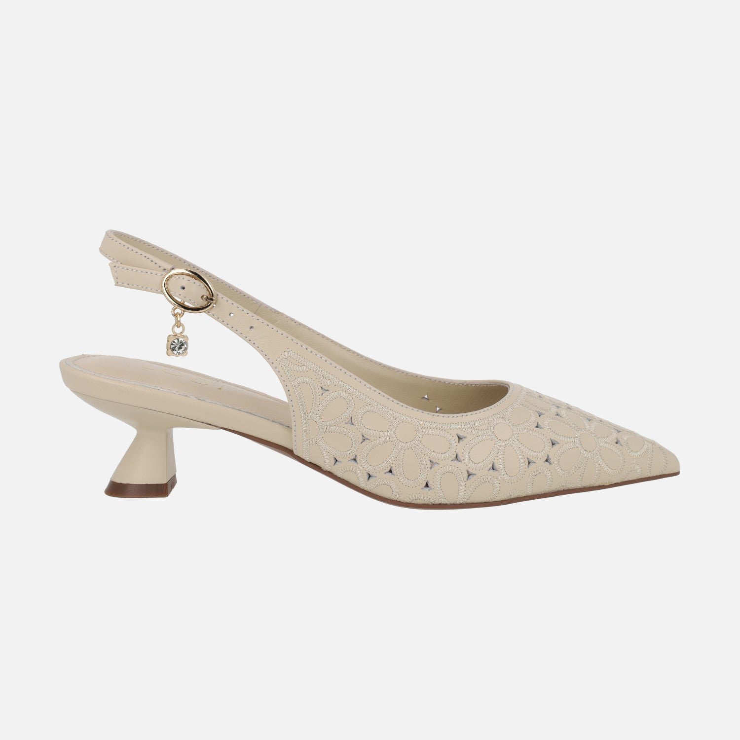 Preciosos zapatos corte salón destalonados de la marca Lodi, modelo A-Vina, disponibles en napa flores sand (camel) y off white (beige). Salones destalonados, elaborados en piel con detalle de picados y bordados de flores. Tira al talón con cierre de hebilla ajustable. Interiores en piel, planta new gel. Suela sintética con tacones de aproximadamente 4,5 cm de altura.